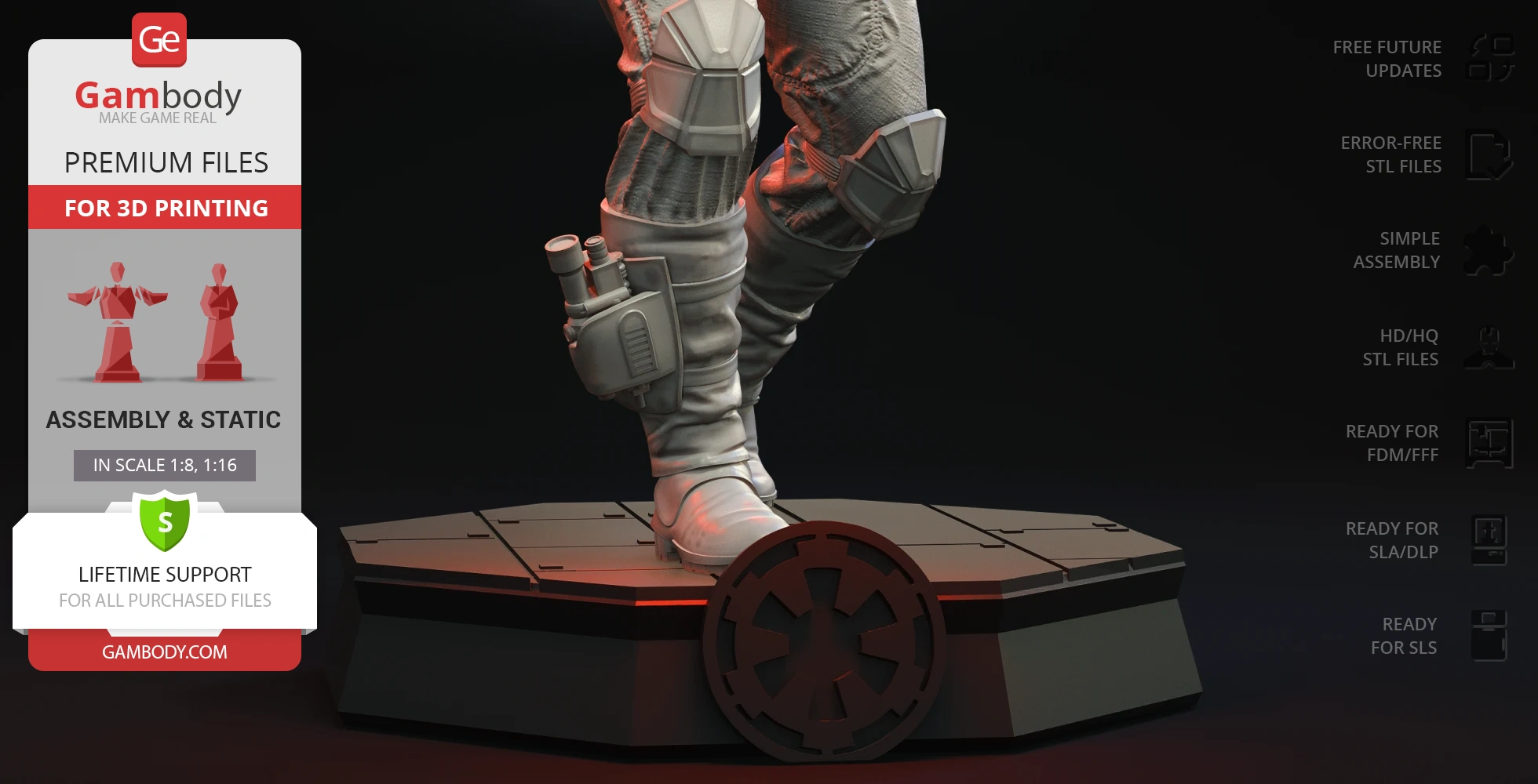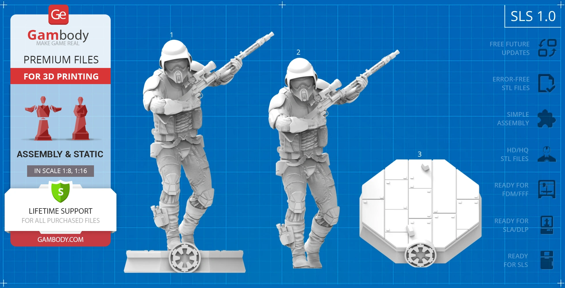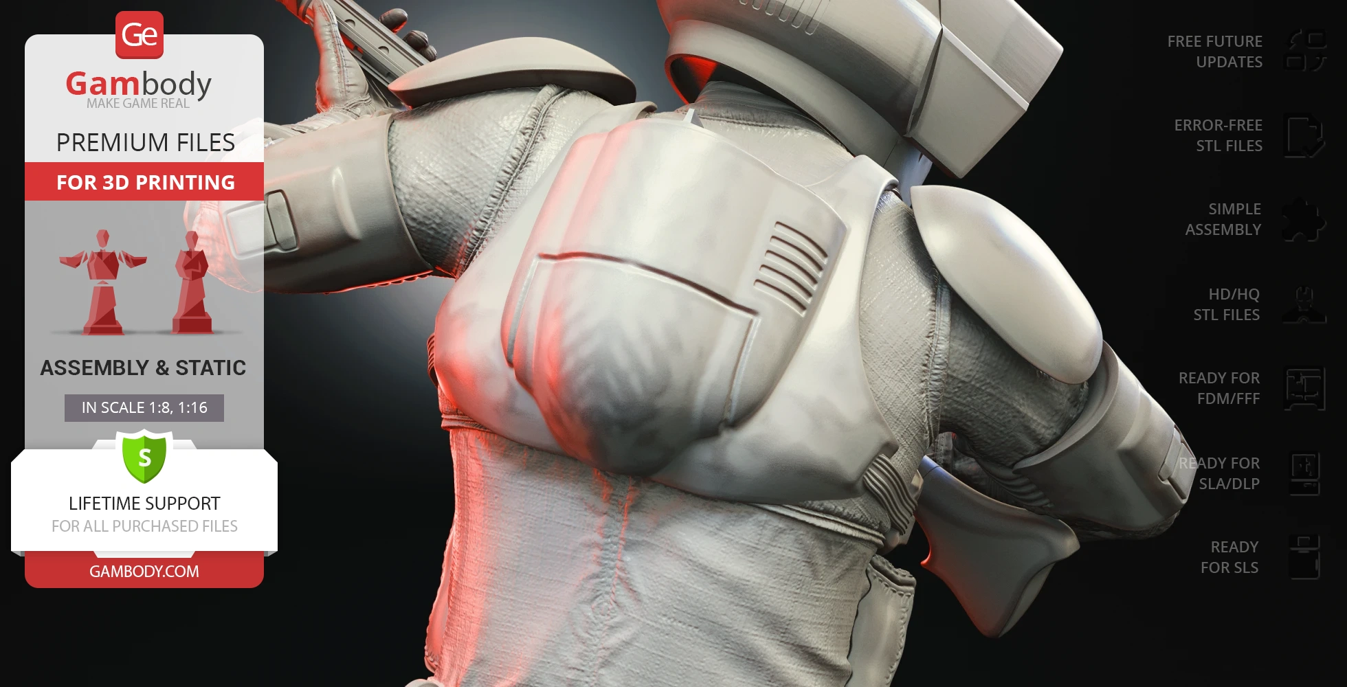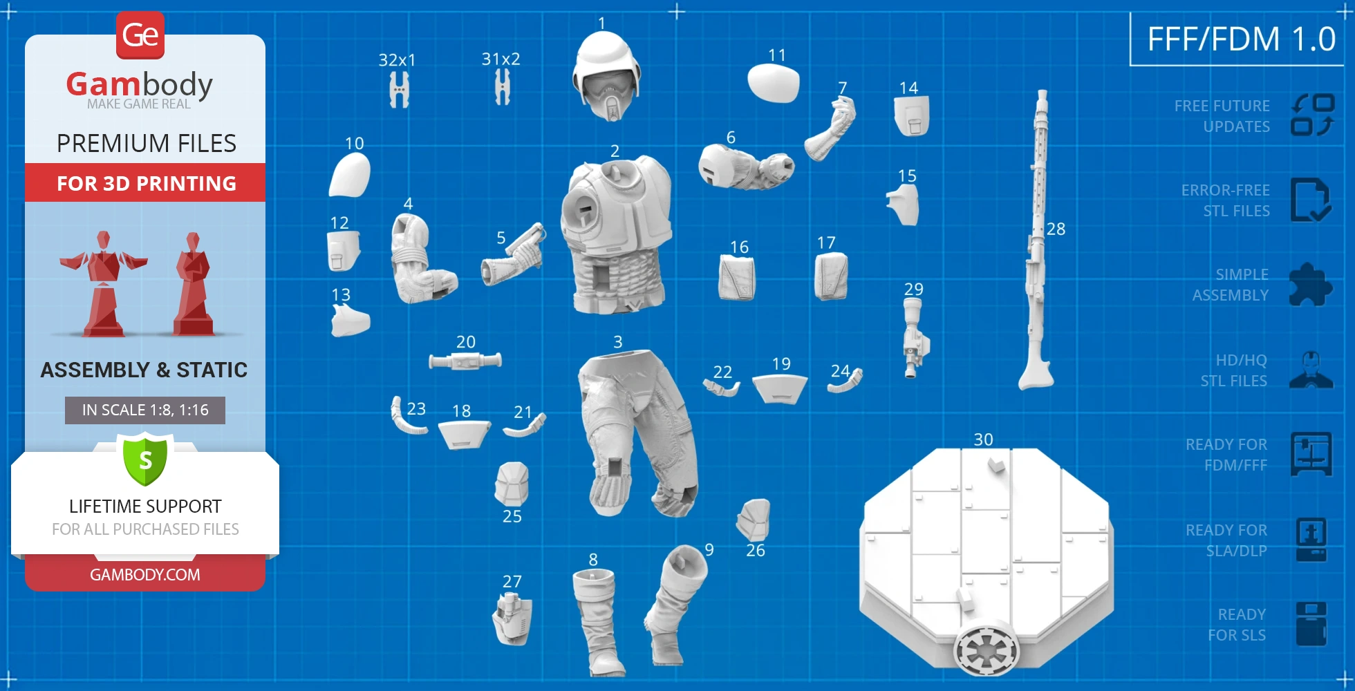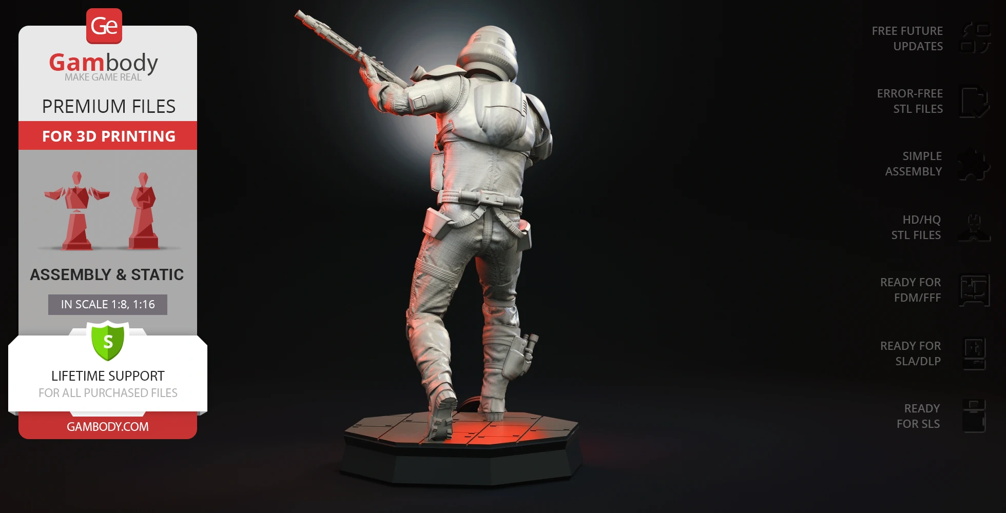 • 4 versions of Scout Trooper STL files for FFF/FDM, DLP/SLA, DLP/SLA Eco, and SLS files for all versions are available for download after the purchase;