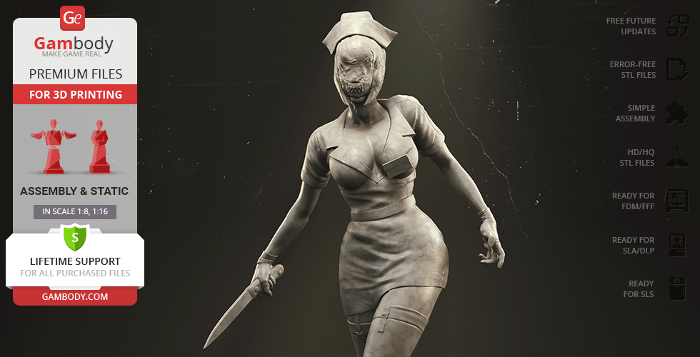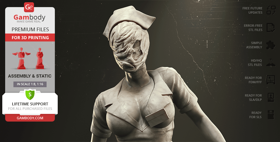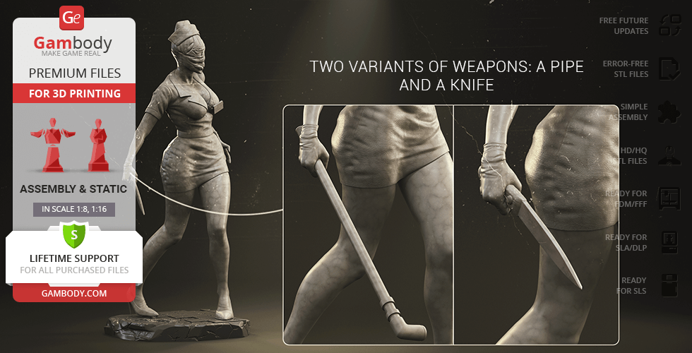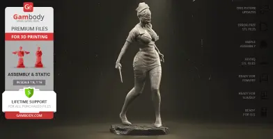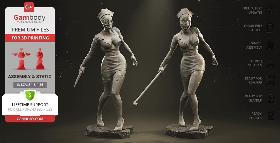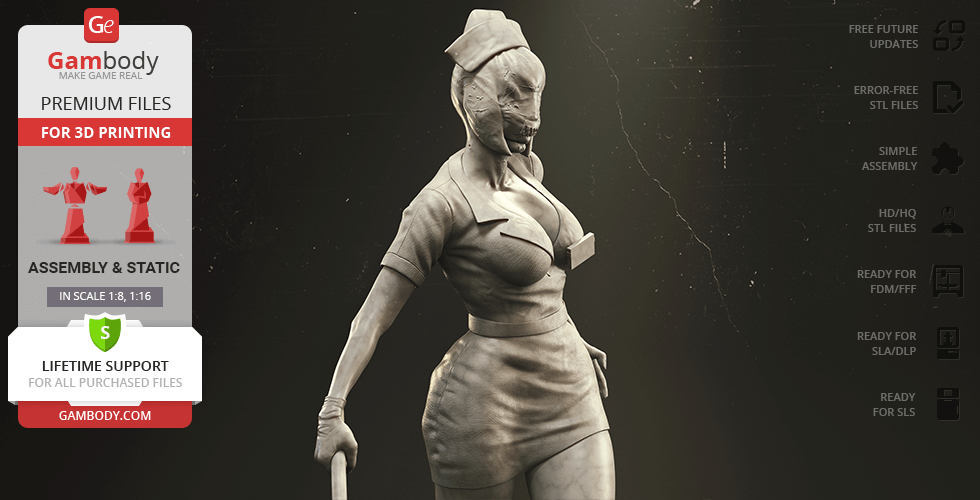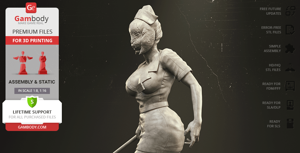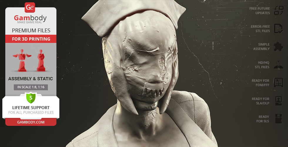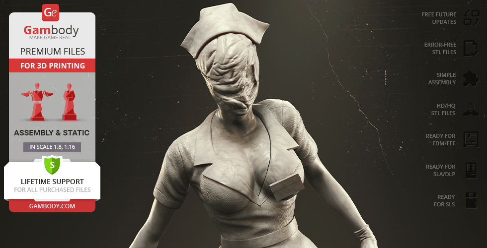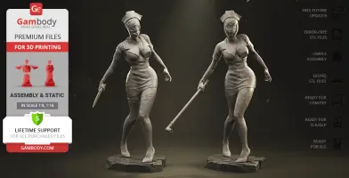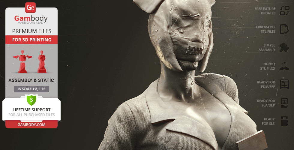 The author of the stunning Bubble Head Nurse for 3D printing was particularly inspired by the appearance of the creature in the sequel. The design of the model captures the essence of the character as well as possible: an evil creature with a puppet body remotely resembling a human and similar to a zombie. The head of the Nurse is wrapped in a mask, and only the rows of sharp fang-like teeth are visible under the bandage. The gnarled fingers and limping gait of the humanoid indicate its weakness, but the power with which the Nurse holds the steel pipe and the determination with which she moves towards the enemy indicates how strong and dangerous this opponent can be. Choose Bubble Head Nurse for your collection and indescribable emotions are guaranteed to you!