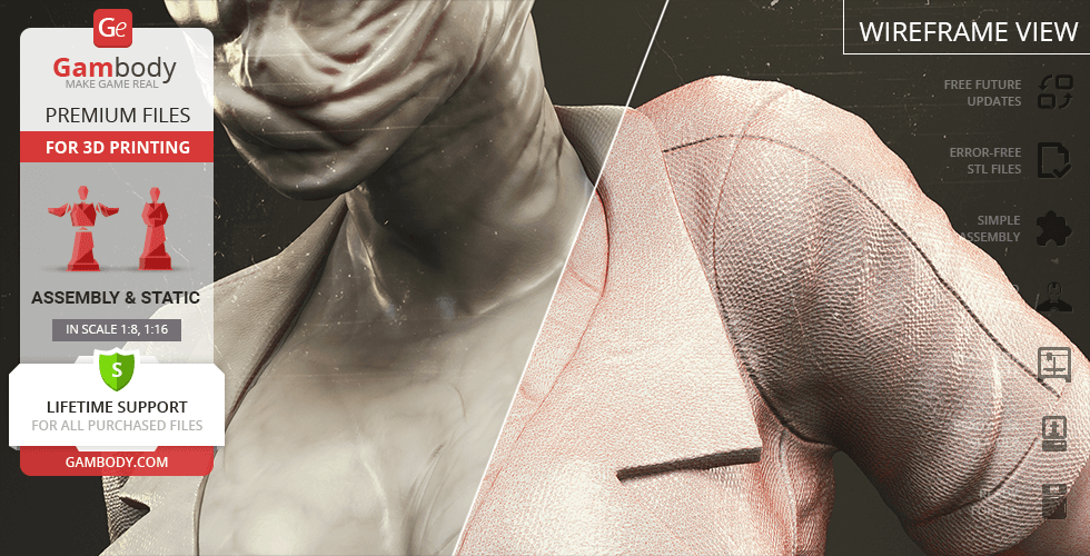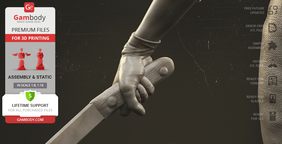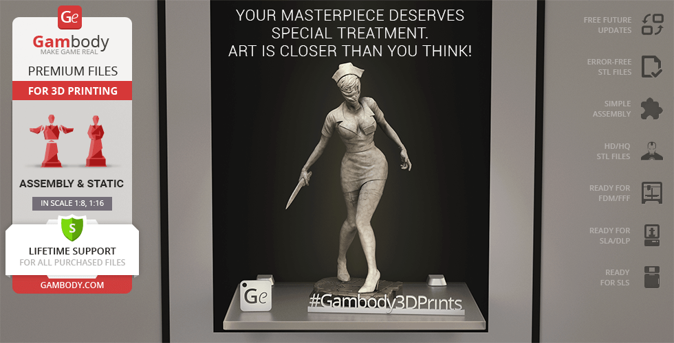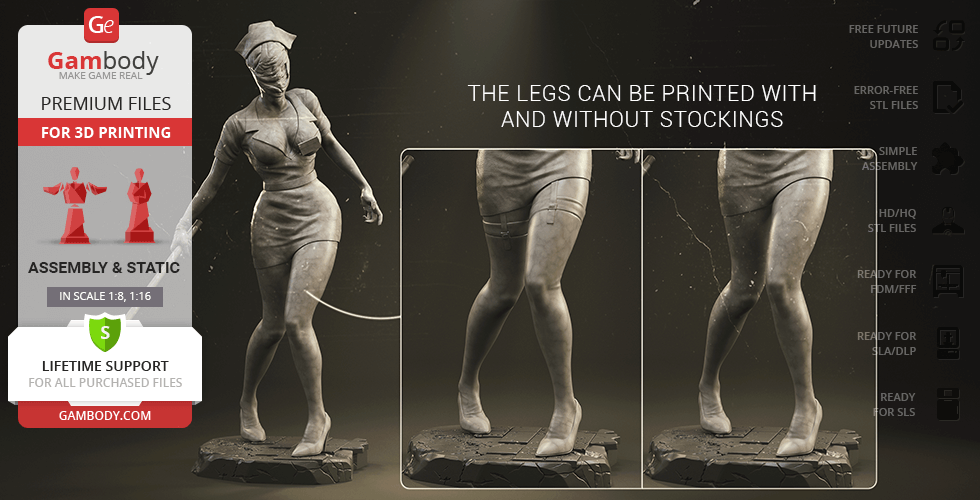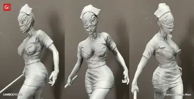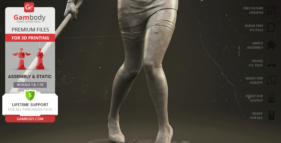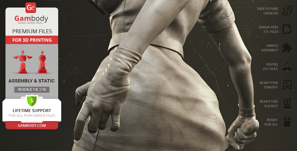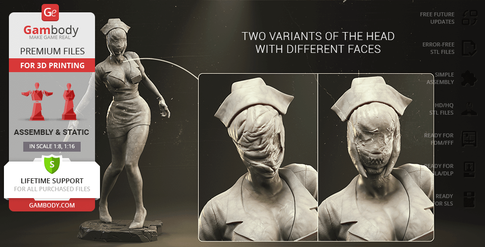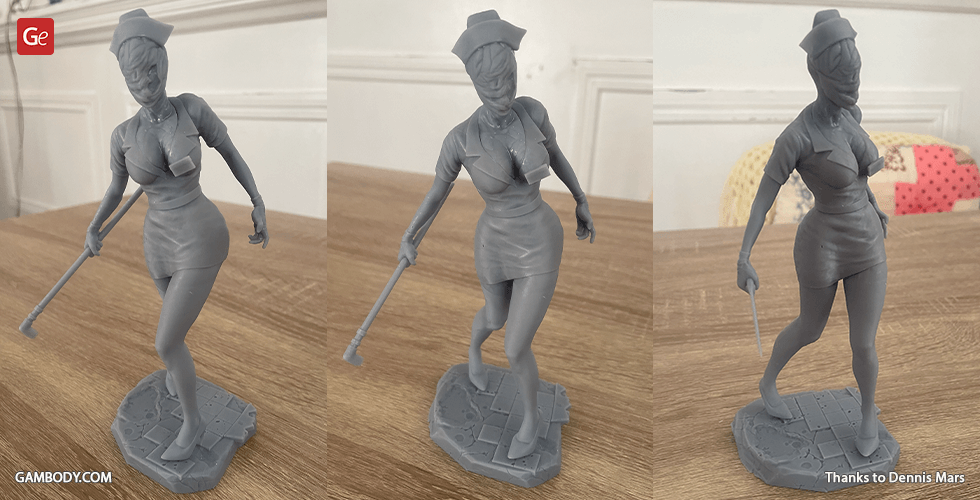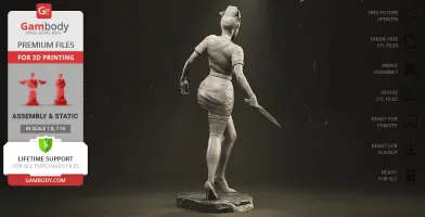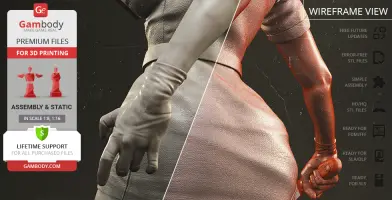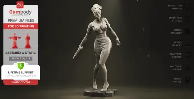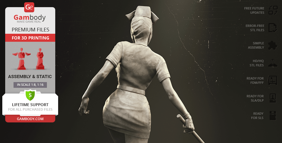 The author of the stunning Bubble Head Nurse for 3D printing was particularly inspired by the appearance of the creature in the sequel. The design of the model captures the essence of the character as well as possible: an evil creature with a puppet body remotely resembling a human and similar to a zombie. The head of the Nurse is wrapped in a mask, and only the rows of sharp fang-like teeth are visible under the bandage. The gnarled fingers and limping gait of the humanoid indicate its weakness, but the power with which the Nurse holds the steel pipe and the determination with which she moves towards the enemy indicates how strong and dangerous this opponent can be. Choose Bubble Head Nurse for your collection and indescribable emotions are guaranteed to you!