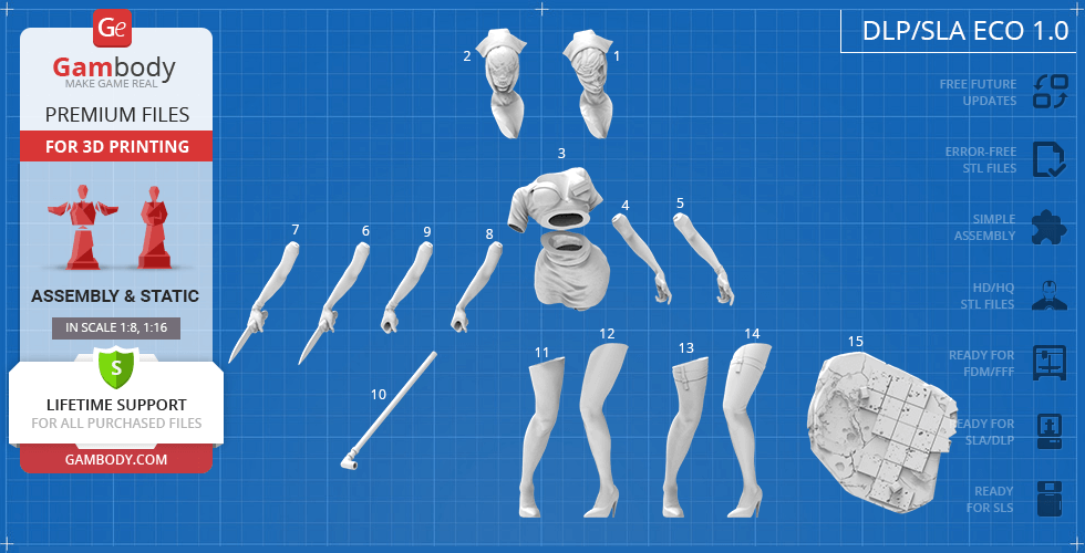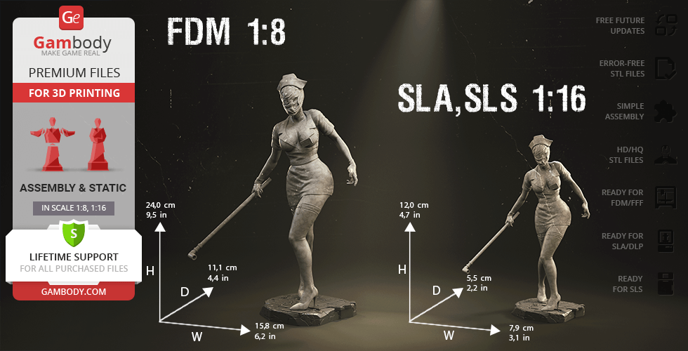 - 4 versions of Bubble Head Nurse STL files for FFF/FDM, DLP/SLA, DLP/SLA Eco, and SLS — files for all versions are available for download after the purchase;