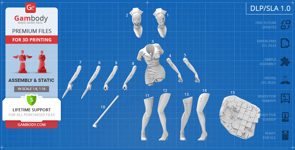 - STL files of high-poly Bubble Head Nurse model for 3D printing consist of 59 files;
