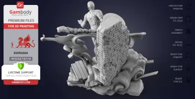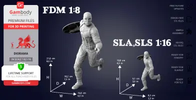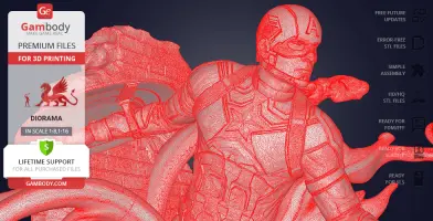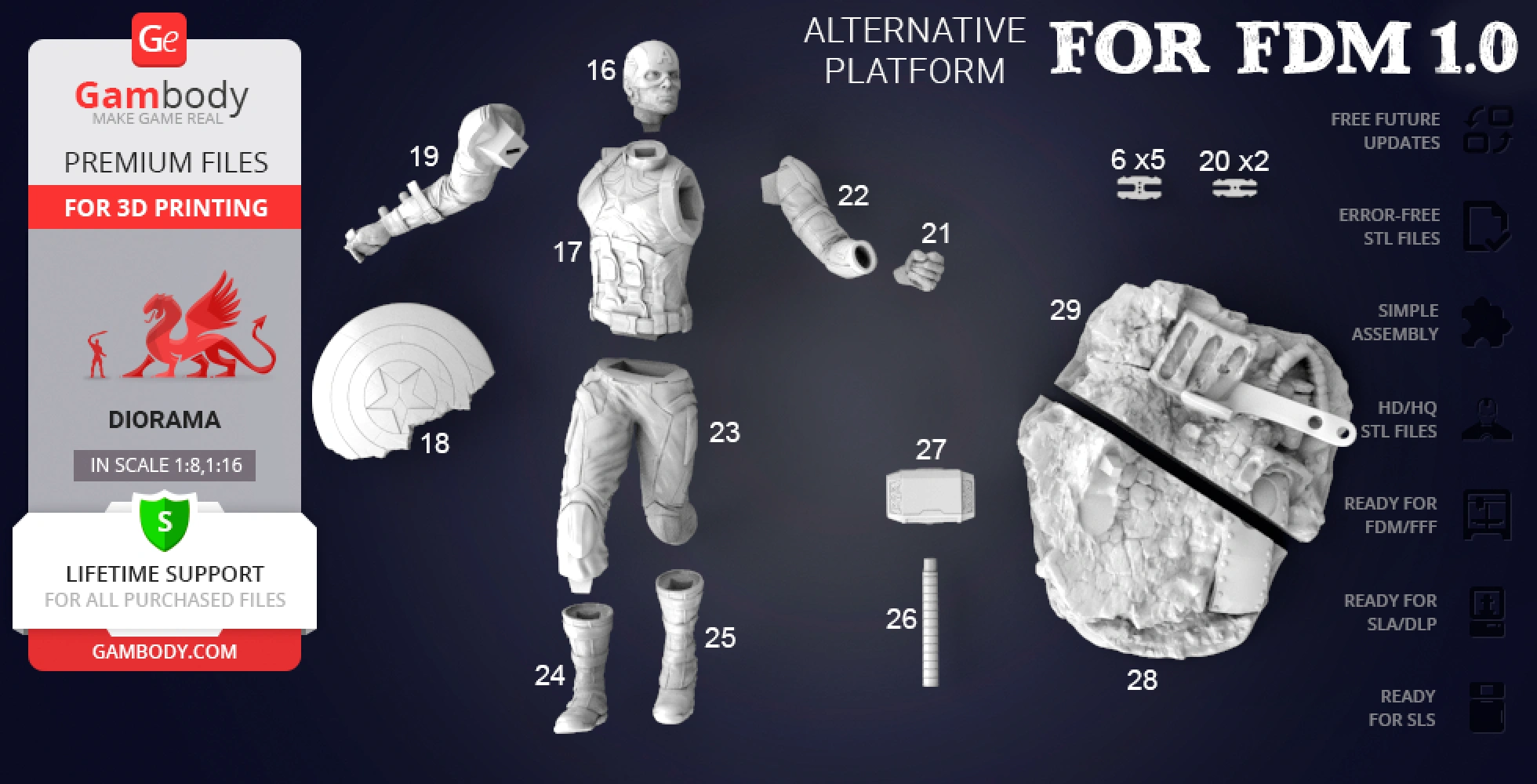 The model’s moderation and adaptation for different types of 3D printers was conducted by Gambody team. In order to conceal the places where assembly parts of the model must be connected, the figurine was cut along the contour of Steve Rogers’ suit seams. Also, for you to be able to easily choose between two alternative Cap variants, the figurine's parts from the FFF/FDM 1.0 version are the same as the ones with corresponding titles in the FFF/FDM 1.1. So in order to assemble the Endgame Steve Rogers you just need to print the new hand that holds Mjolnir. Depending on the background you want to display your Captain America in, there were designed two completely different platforms: the big explosion scene and a smaller battlefield-like one. All the assembly parts are provided in STL files in recommended positions that were worked out so to ensure the smoothness of the details’ surfaces after printing and that the 3D printing beginners won't face difficulties when placing the parts on a build plate.