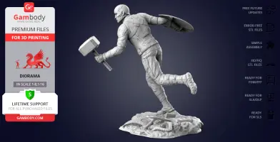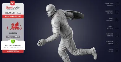 For all fans of Infinity Saga and MCU, Captain America figurine for 3D printing has two assembly variants to choose from. The FFF/FDM 1.0 version of the model features the first Avenger mounted on a big platform resembling the heated battle scene. In this version, the super-soldier is equipped only with his trademark shield. But as we all were surprised to observe in the Battle for Earth, Steve Rogers is indeed worthy to wield Thor's hammer Mjolnir against Thanos. So for you to depict the Endgame variant of Captain America, there is an FFF/FDM 1.1 version where the figurine is holding Mjolnir in his left hand and his shield in tatters in the right. Both versions you can find in the ‘Source files’ tab and see the way they look like and how they are divided into assembly parts in the photo preview section.