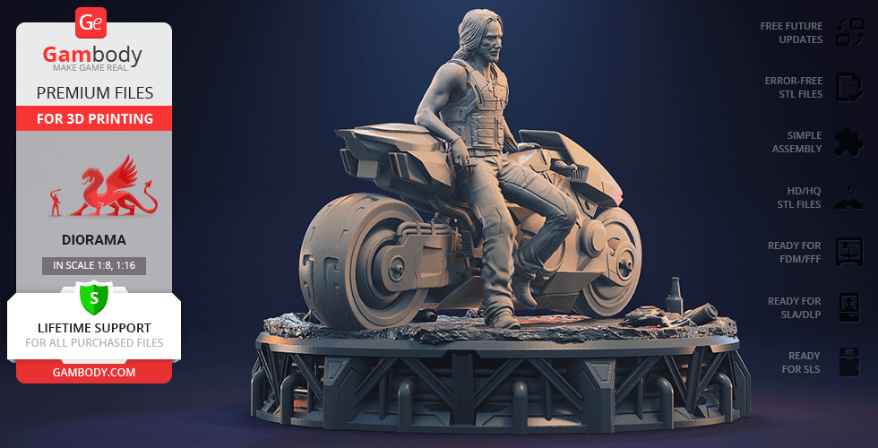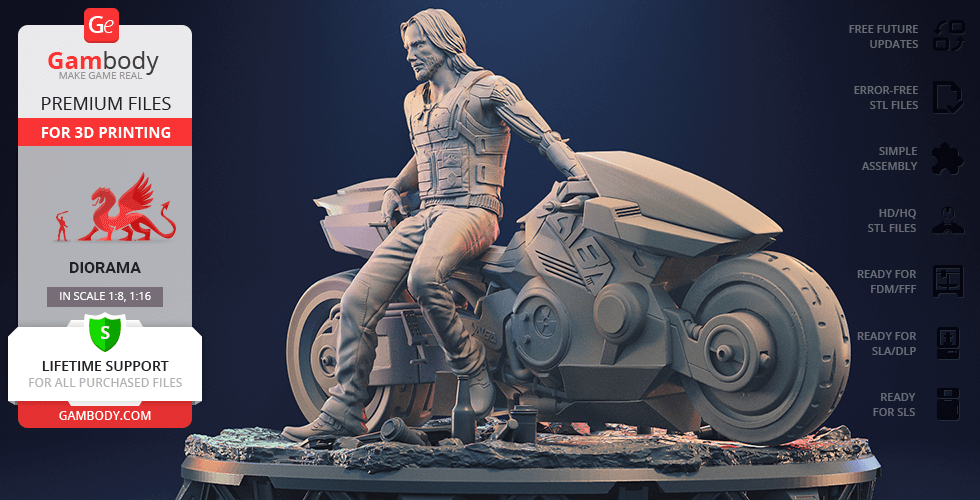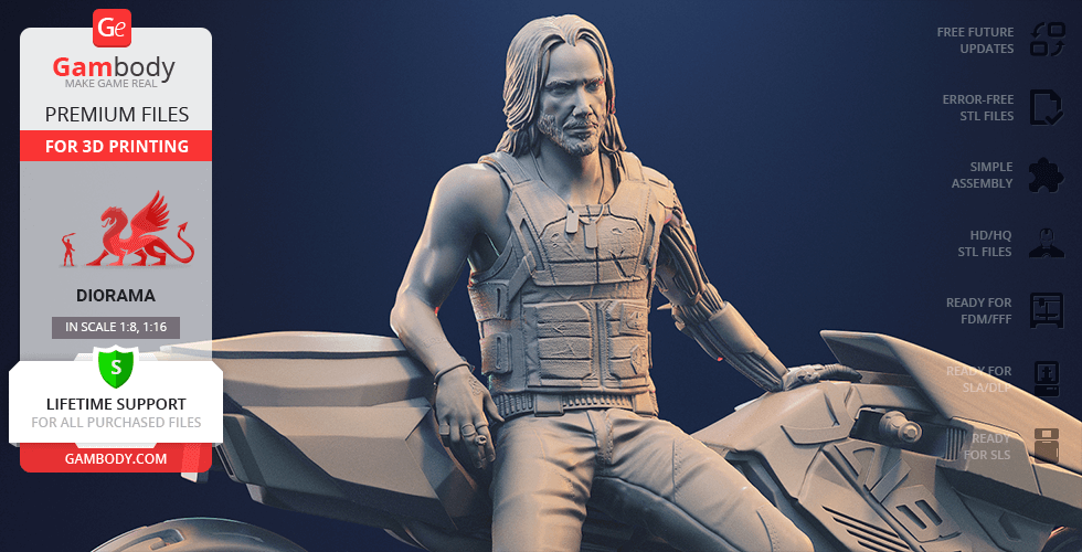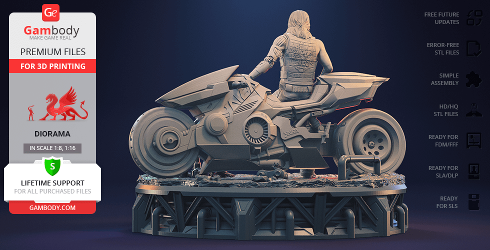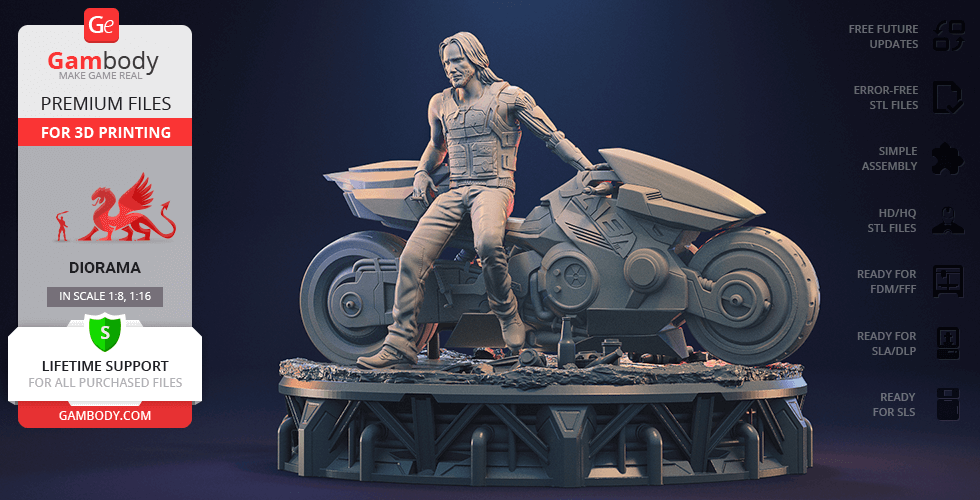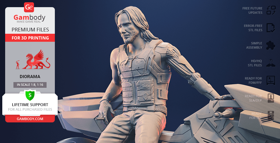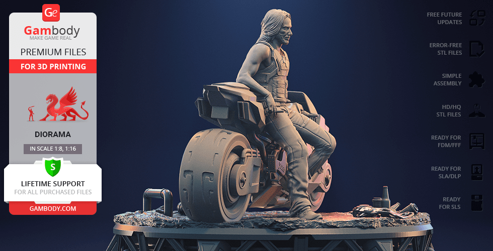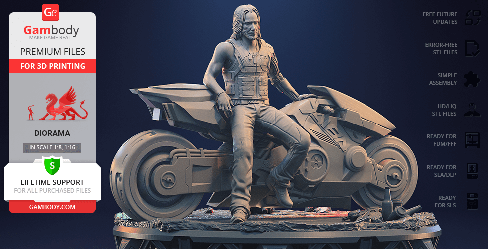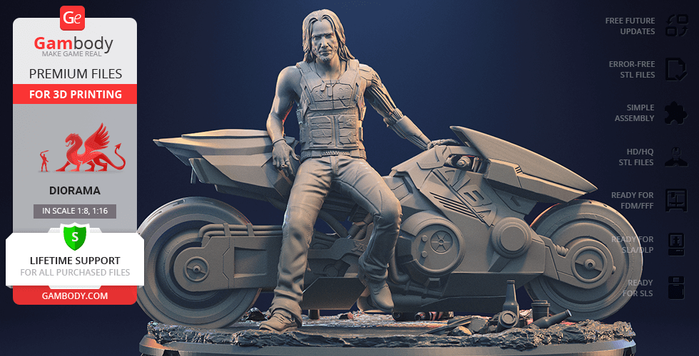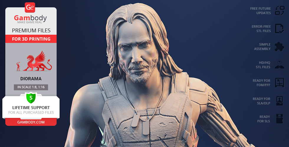 Cyberpunk diorama for 3D printing is a static assembly model and its moderation and adaptation for different types of 3D printers took Gambody team 48 hours. The anatomy and proportions of Johnny Silverhand figurine were thoroughly reviewed during the moderation process for the Rockerboy to be depicted harmoniously in the intended pose.