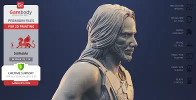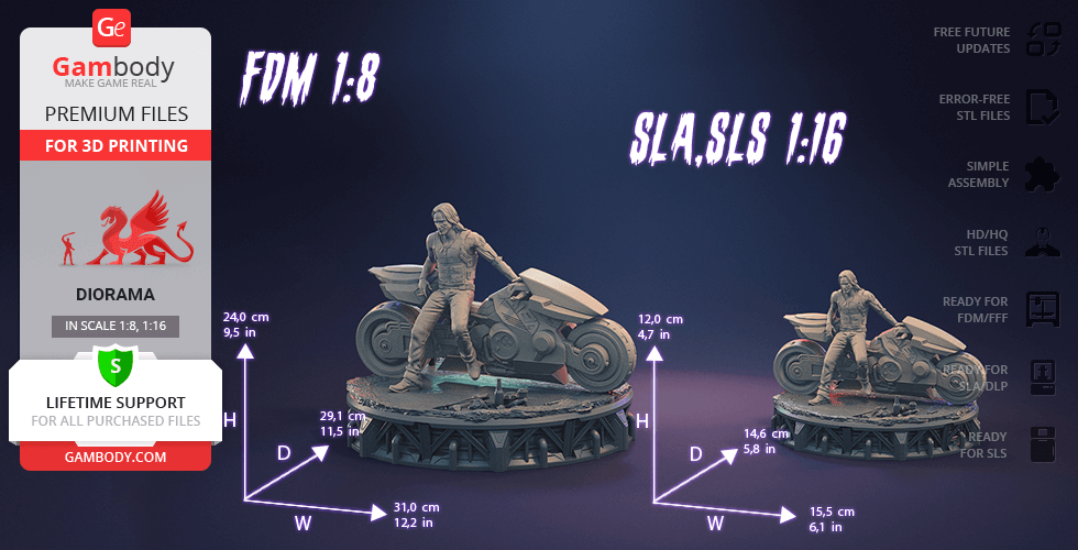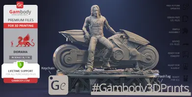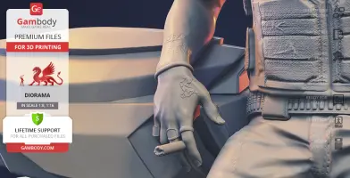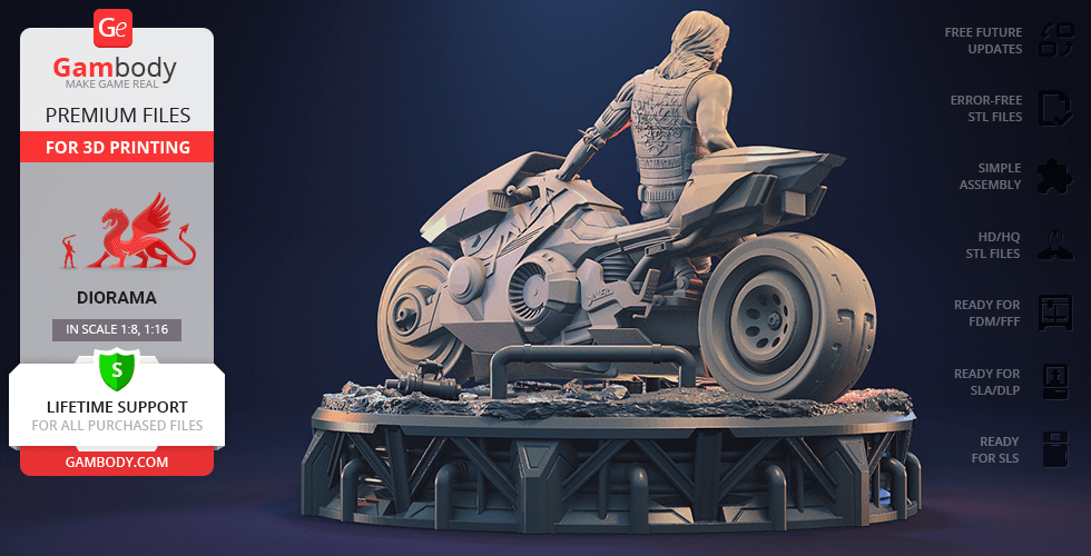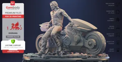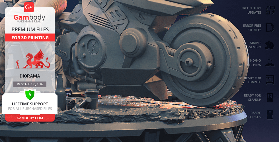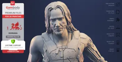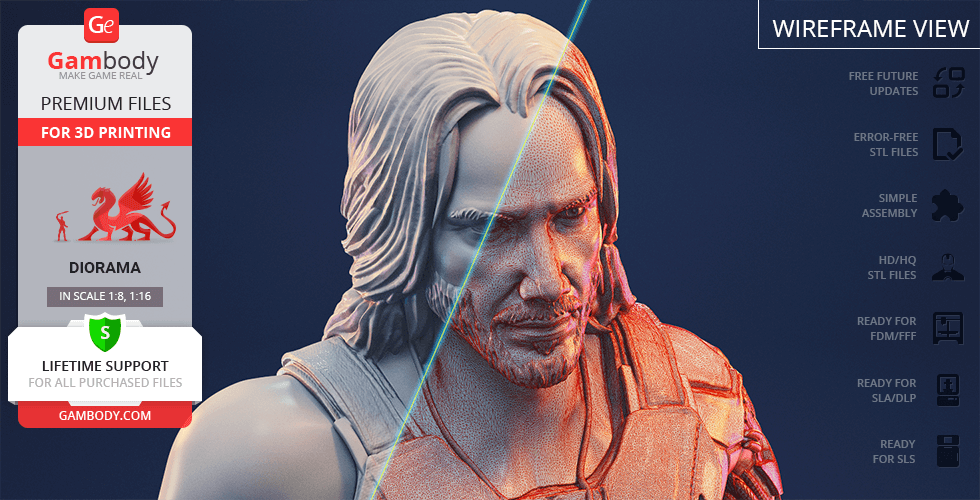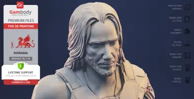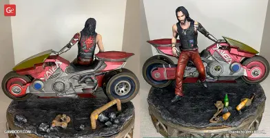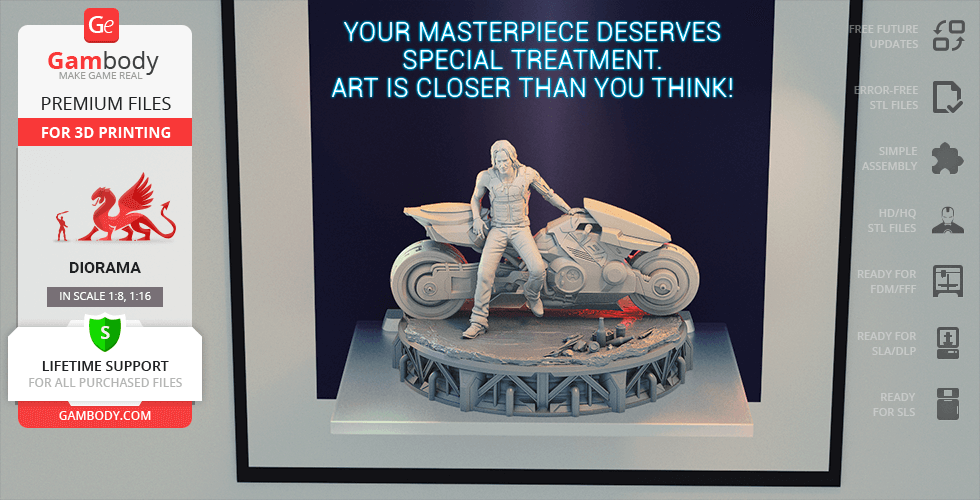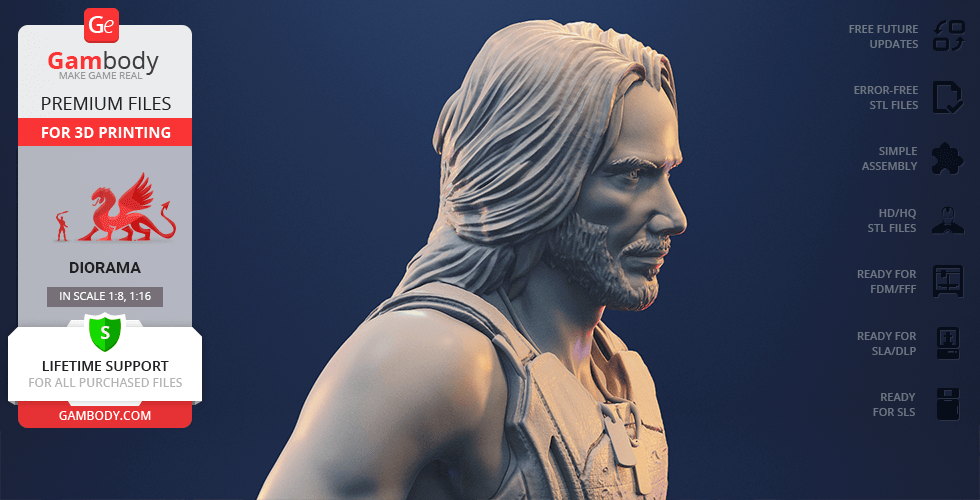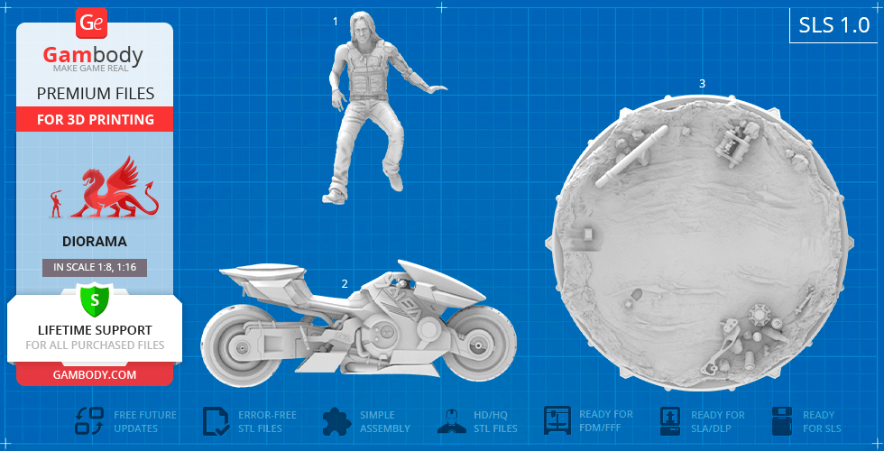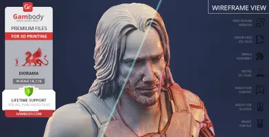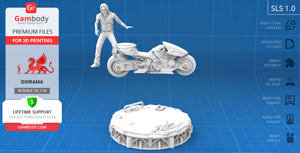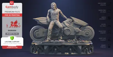 Cyberpunk diorama for 3D printing is a static assembly model and its moderation and adaptation for different types of 3D printers took Gambody team 48 hours. The anatomy and proportions of Johnny Silverhand figurine were thoroughly reviewed during the moderation process for the Rockerboy to be depicted harmoniously in the intended pose.