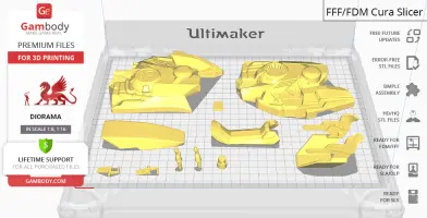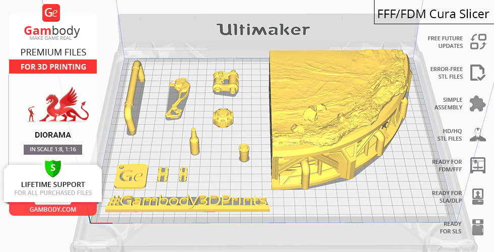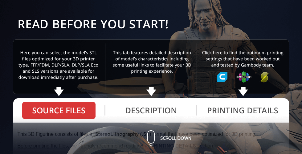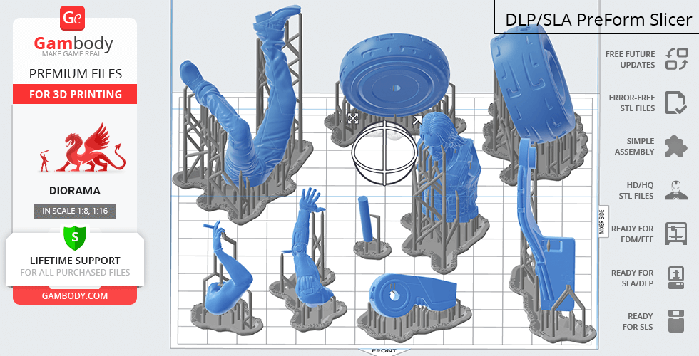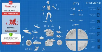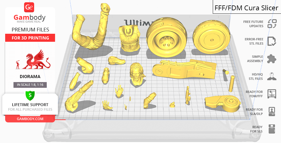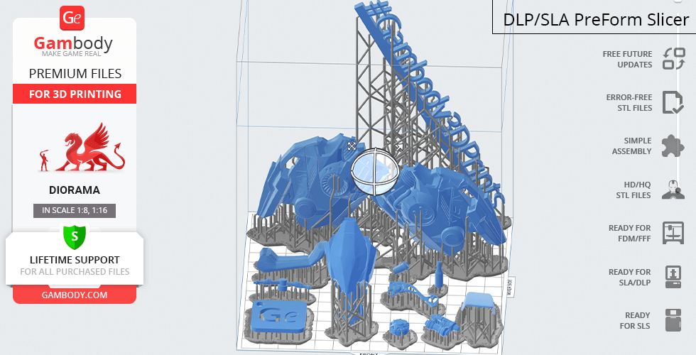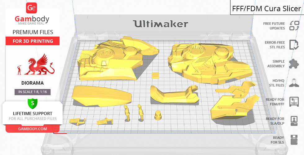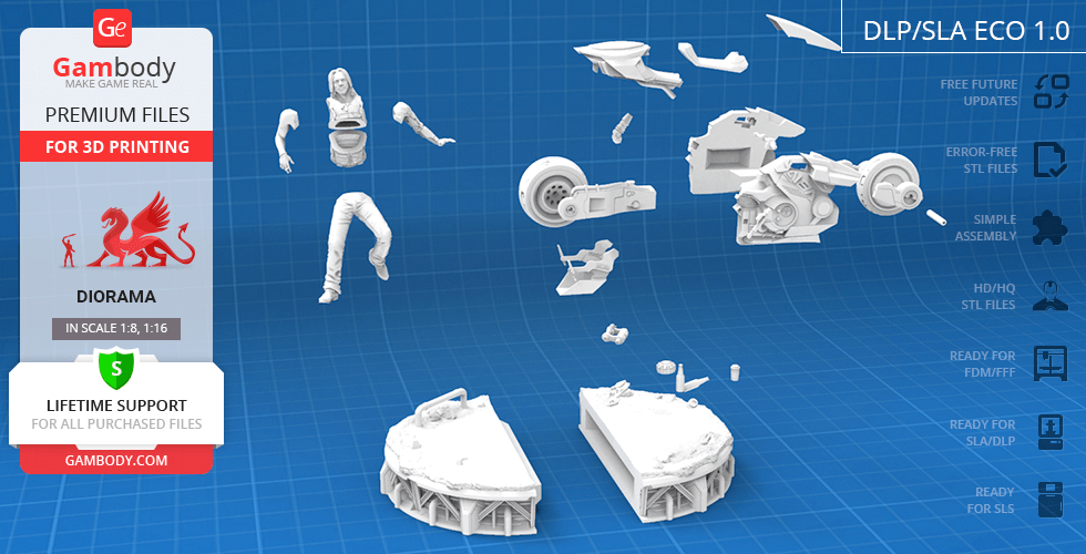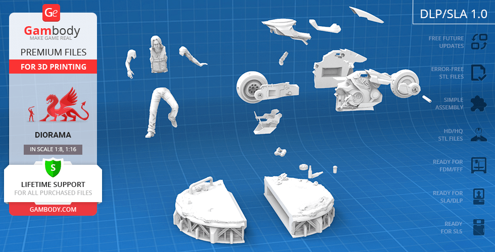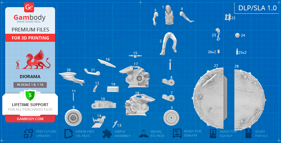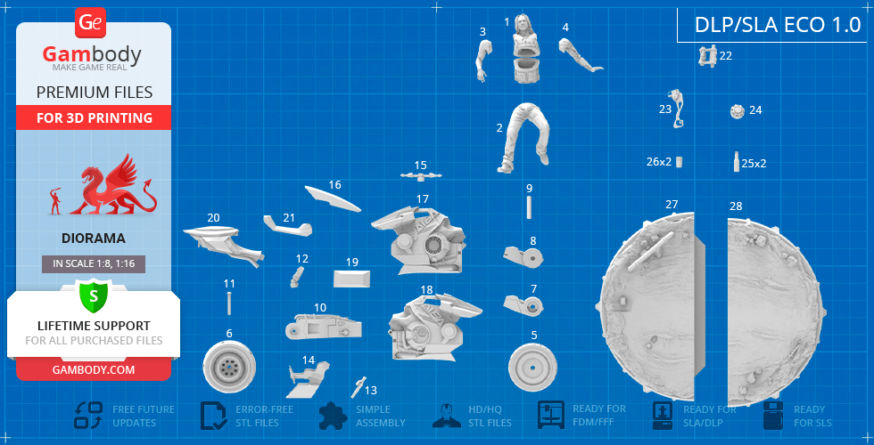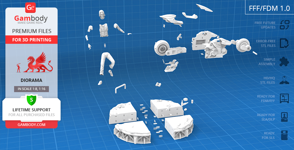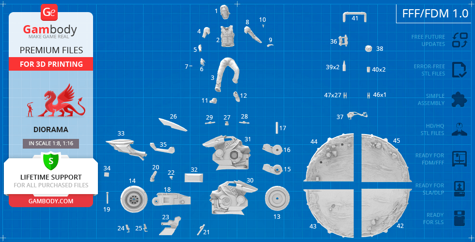 All assembly parts come in STL files in recommendedpositions that were worked out in order to ensure the smoothness of the details’ surfaces after printing and so that the 3D printing beginners won't face difficulties when placing the parts on a build plate. When downloading any figurine's file you will also receive "Assembly Manual" for FFF/FDM 1.0 and DLP/SLA 1.0 versions in PDF format.