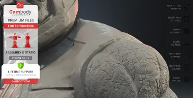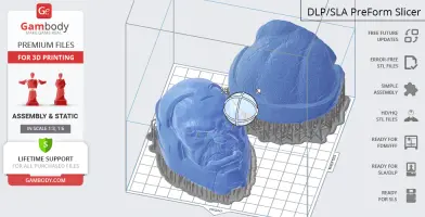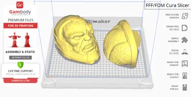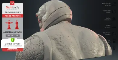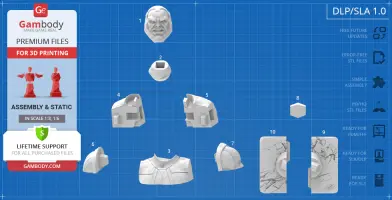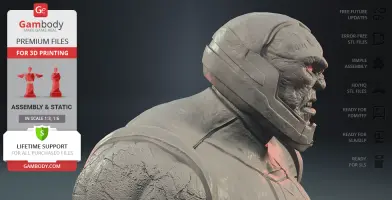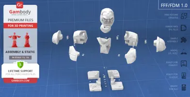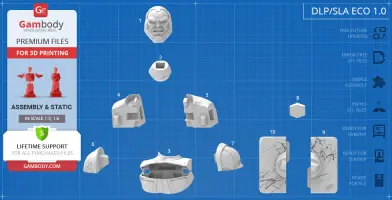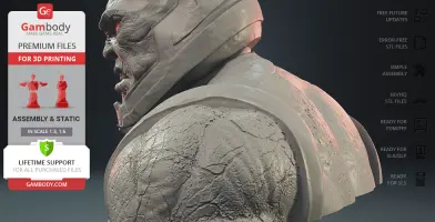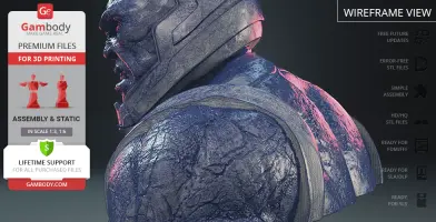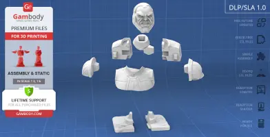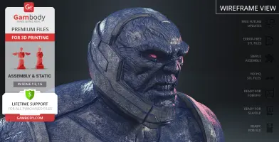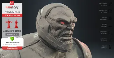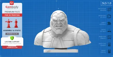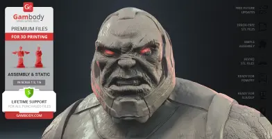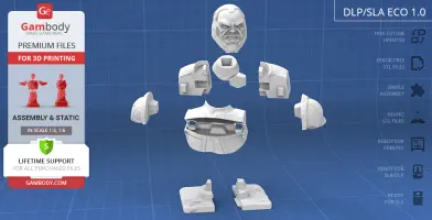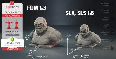 Darkseid Bust for 3D printing is a static assembly figurine and its moderation and adaptation for different types of 3D printers took Gambody team 25 hours in total. The large bust of the Justice League’s archenemy was divided into as many assembly parts as needed to fit even the smallest 3D printers' build plates. The cutting of the model was chosen by our team to minimize the amount of filament needed for generated support and some of the model’s parts were hollowed out for you to save resin in the model’s Eco version. For you to achieve the cleanest 3D printed result, Darkseid’s head, shoulders, chest plates etc. are provided as separate assembly parts. The parts of the bust were cut along the character suit’s seams in order to conceal the connecting stitches. The rocky stand of the bust was divided into four parts to fit the build plates of the average 3D printers. All assembly parts are provided in STL files in recommended positions that were worked out in order to ensure the smoothness of the details’ surfaces after printing and to make sure that the 3D printing beginners won't face difficulties when placing the parts on a build plate. When downloading any bust’s file you will also receive "Assembly Manual" for FFF/FDM 1.0 and DLP/SLA 1.0 versions in PDF format.
