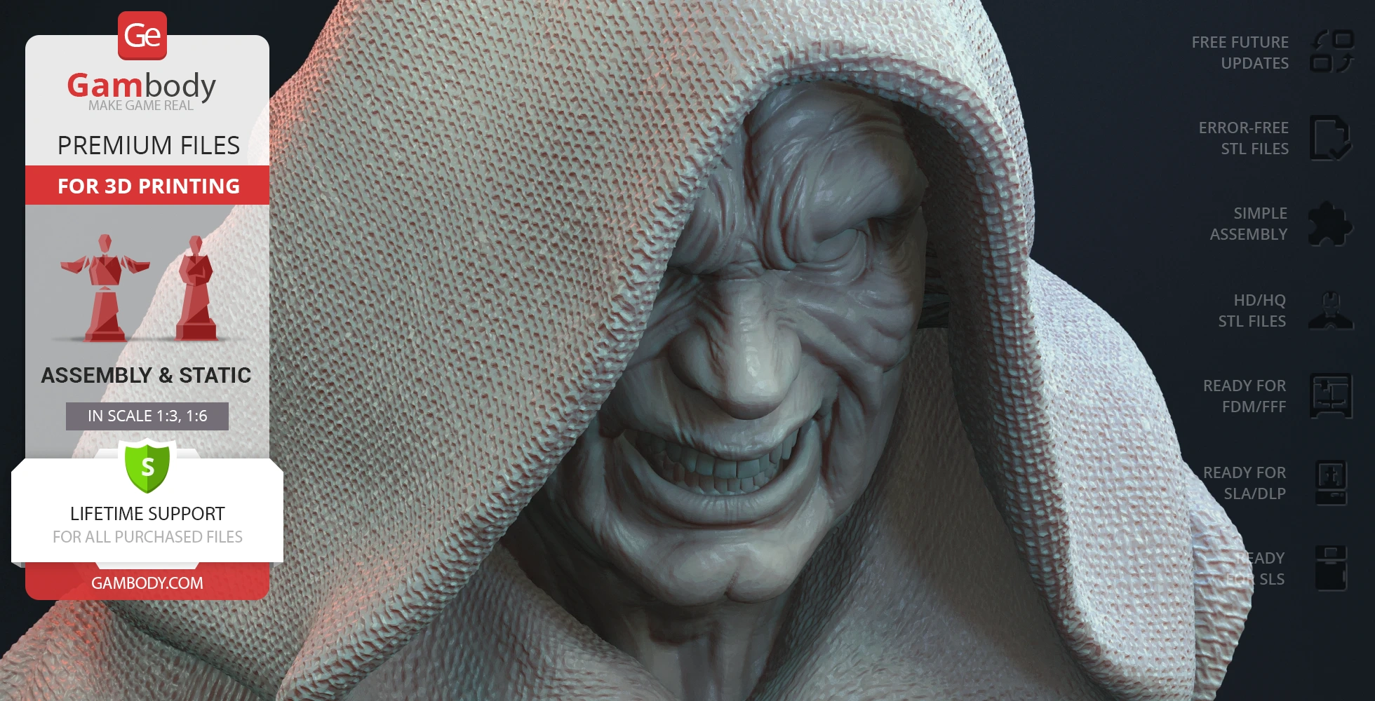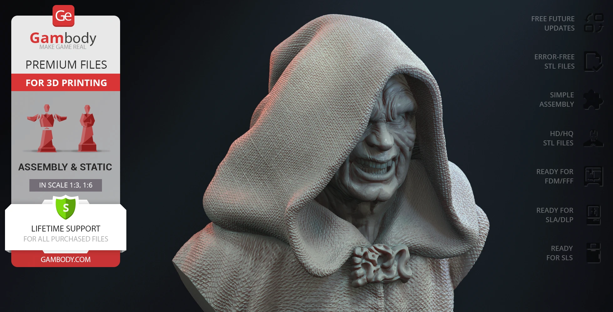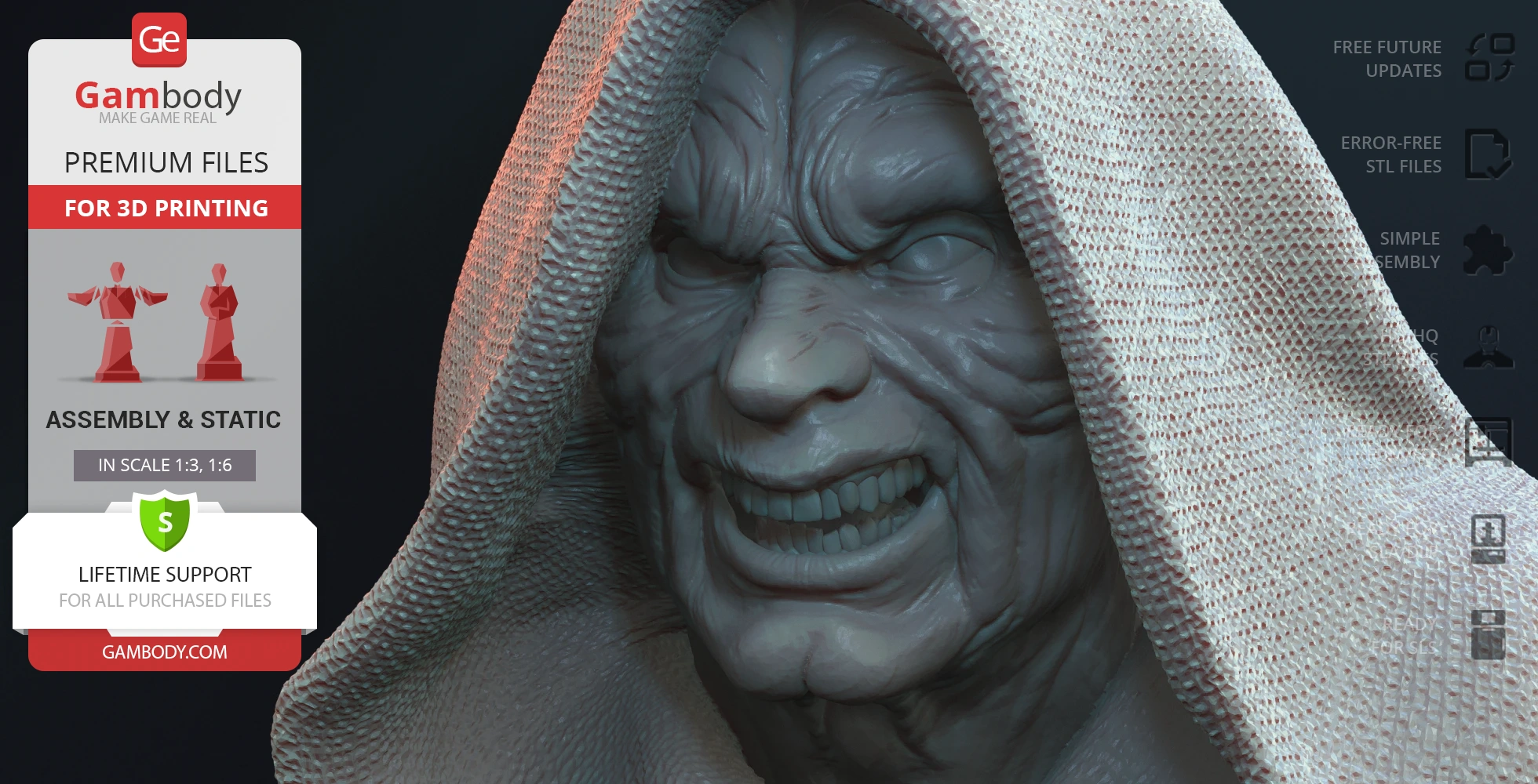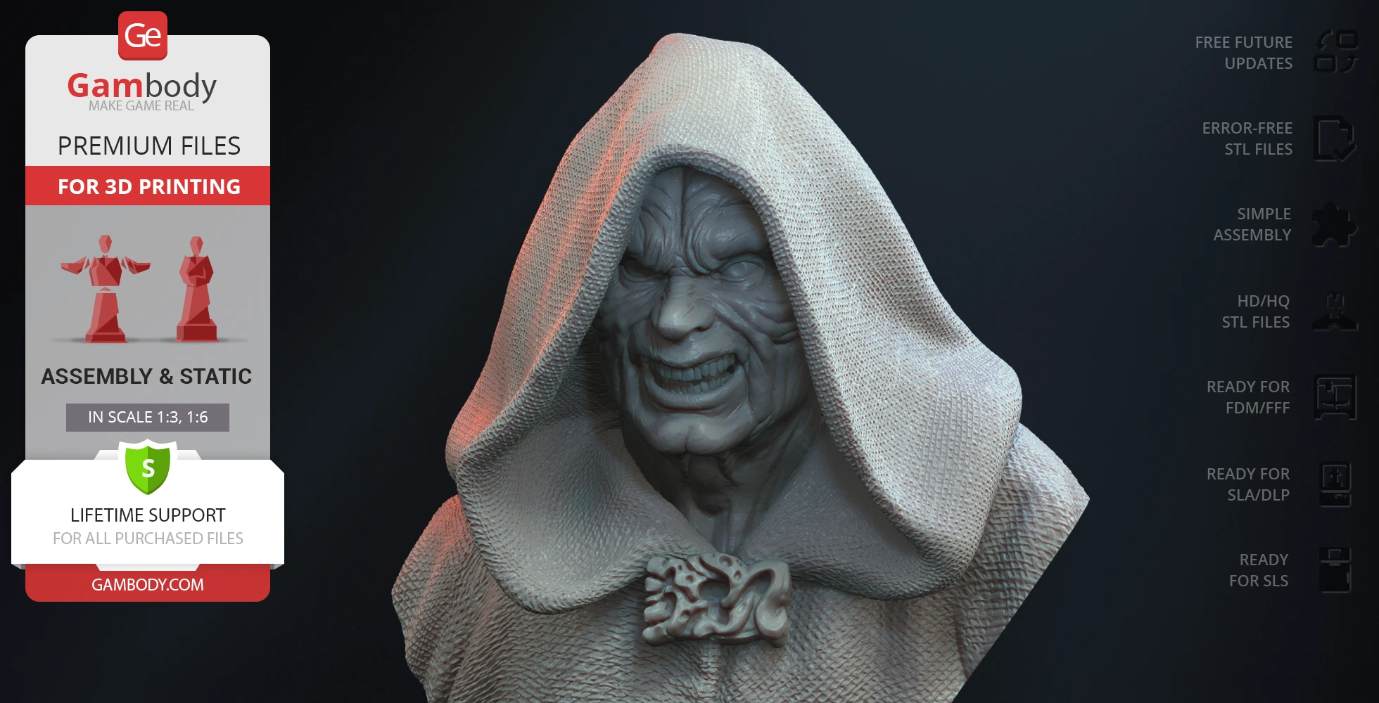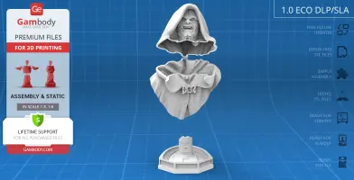 Darth Sidious Bust for 3D printing is a static assembly model and its moderation and adaptation for different types of 3D printers took the Gambody team 54 hours in total. The 3D print's anatomy and proportions were thoroughly reviewed during the moderation process for the character.