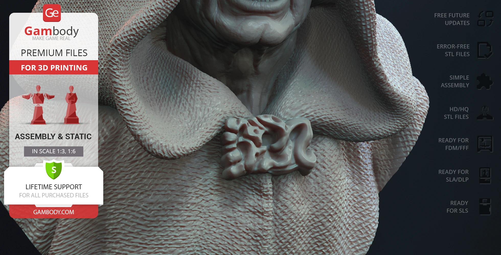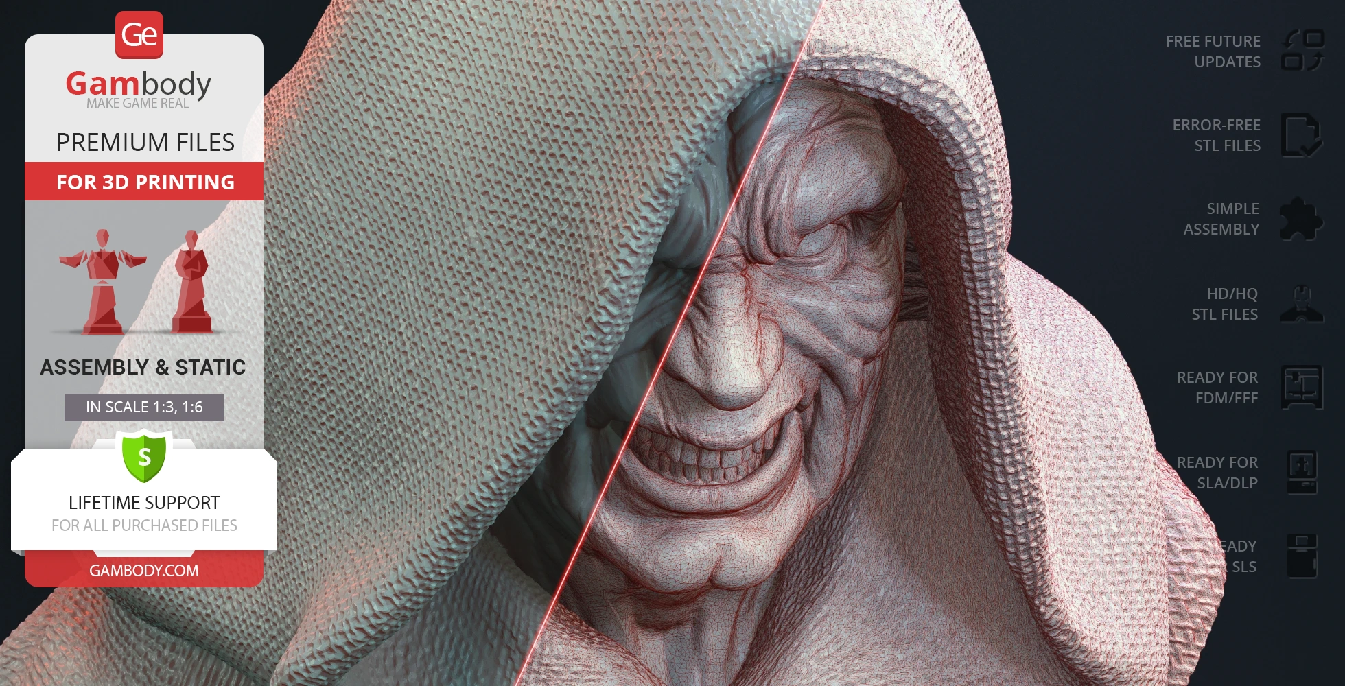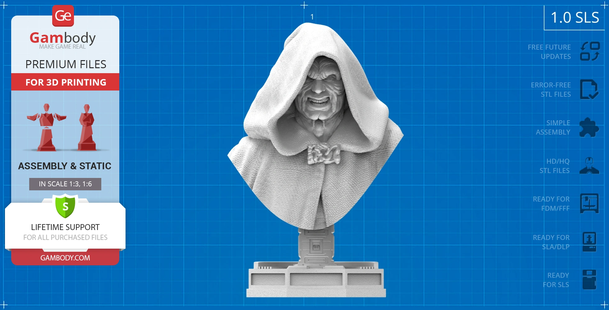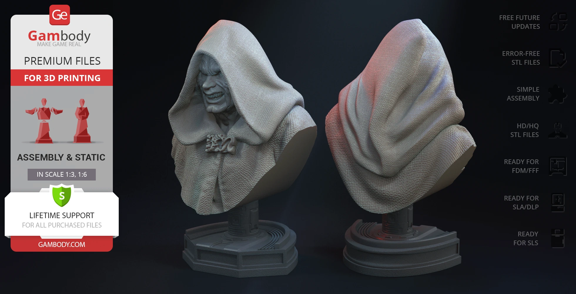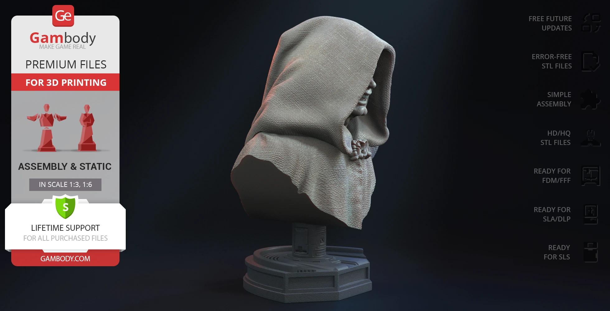 Darth Sidious Bust for 3D printing is a static assembly model and its moderation and adaptation for different types of 3D printers took the Gambody team 54 hours in total. The 3D print's anatomy and proportions were thoroughly reviewed during the moderation process for the character.
