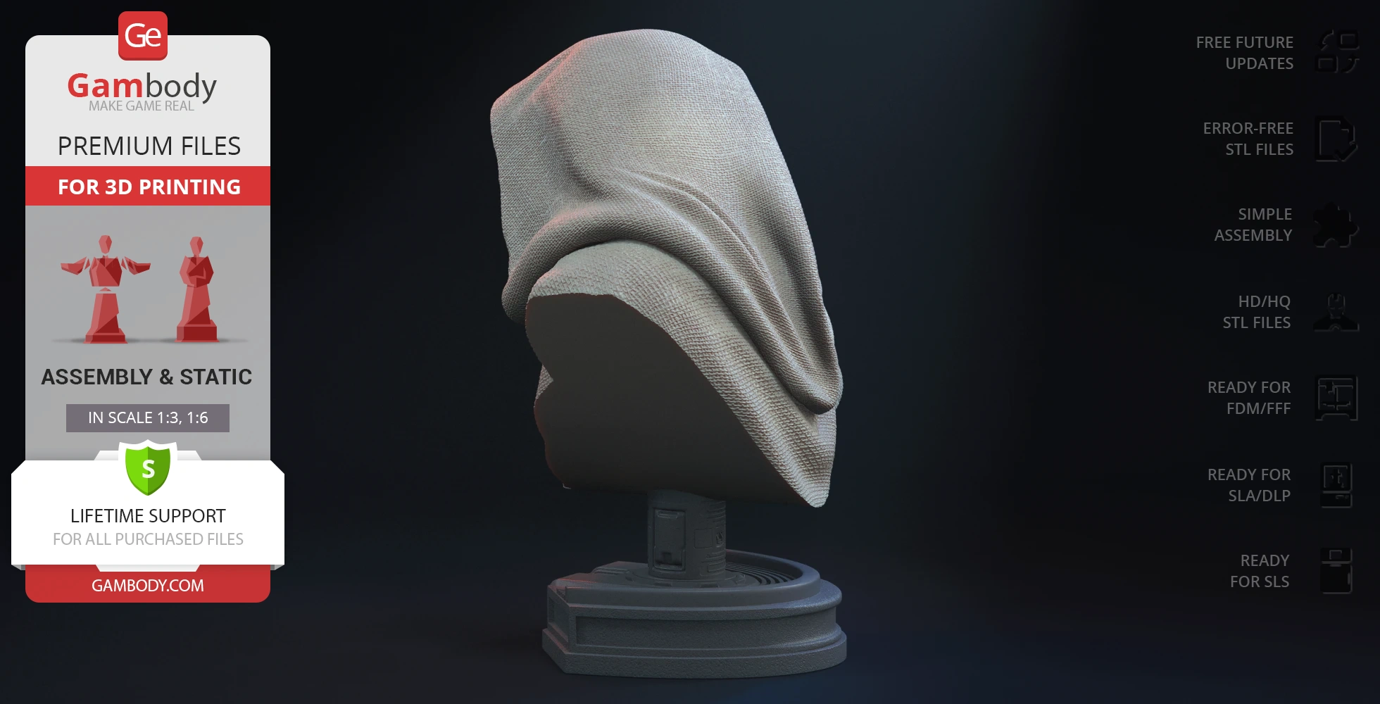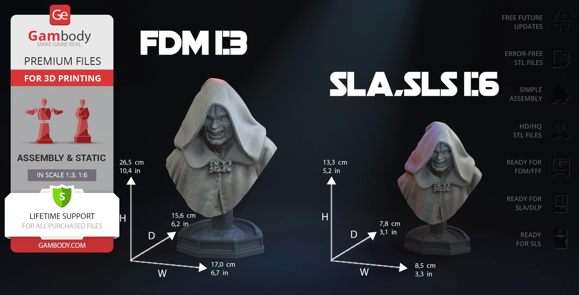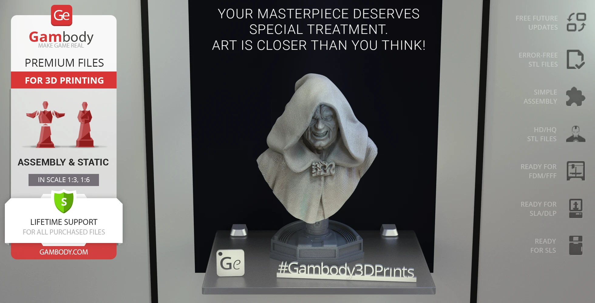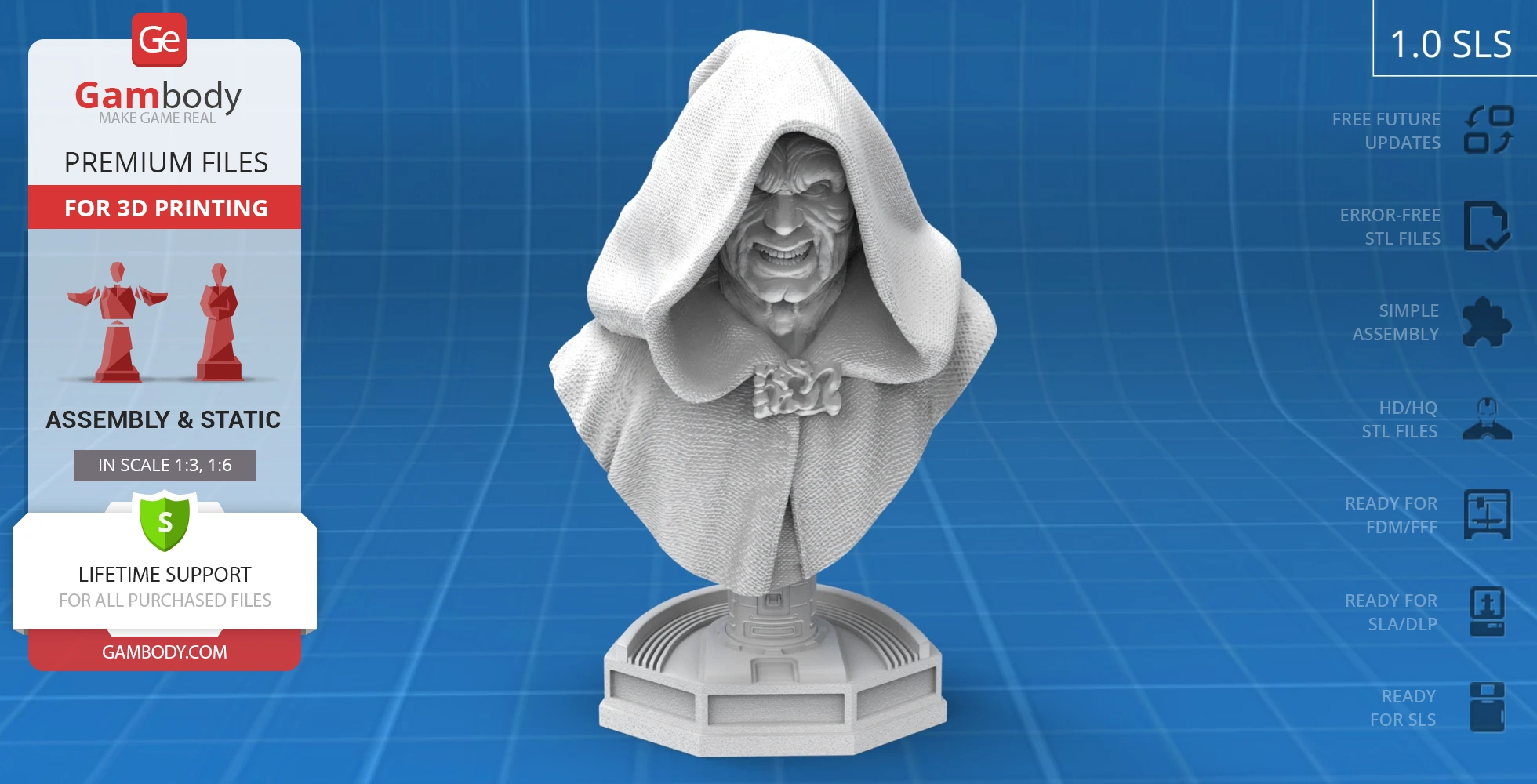 Darth Sidious Bust for 3D printing is a static assembly model and its moderation and adaptation for different types of 3D printers took the Gambody team 54 hours in total. The 3D print's anatomy and proportions were thoroughly reviewed during the moderation process for the character.