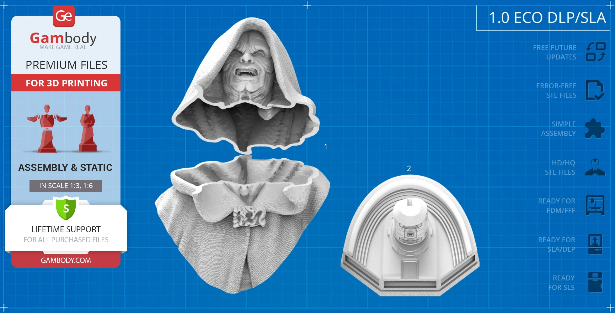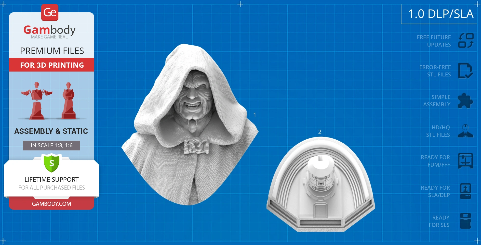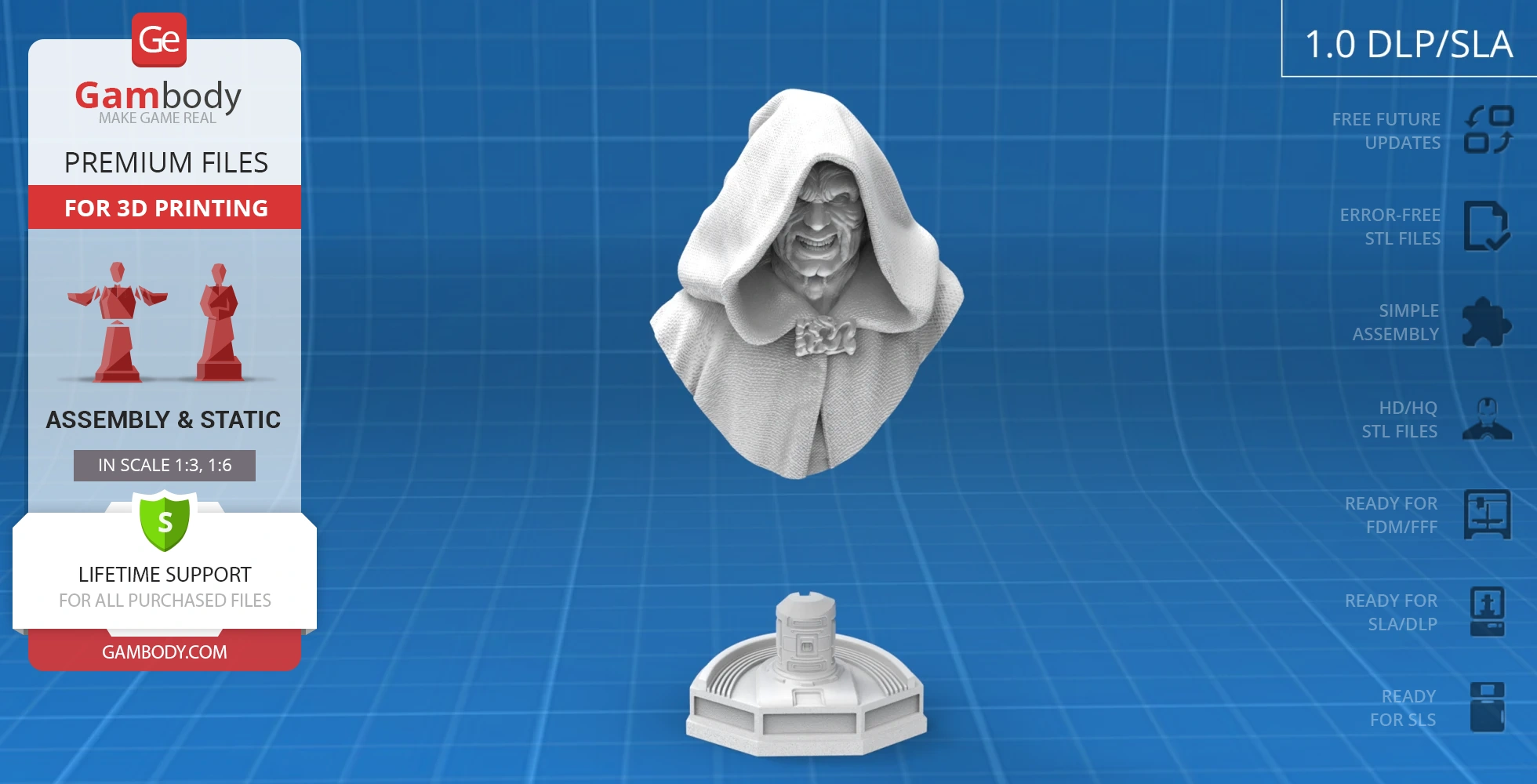 All assembly parts in the 1.0 FFF/FDM version are provided in STL files in recommended positions that were worked out in order to ensure the smoothness of the details’ surfaces after printing and that the 3D printing beginners won't face difficulties when placing the parts on a build plate. When downloading any model's file you will also receive "Assembly Manual" for 1.0 FFF/FDM and 1.0 DLP/SLA versions in PDF format. We highly recommend that you get acquainted with the “Assembly Video” and "Assembly Manual" before getting down to Sith Lord Palpatine Bust.