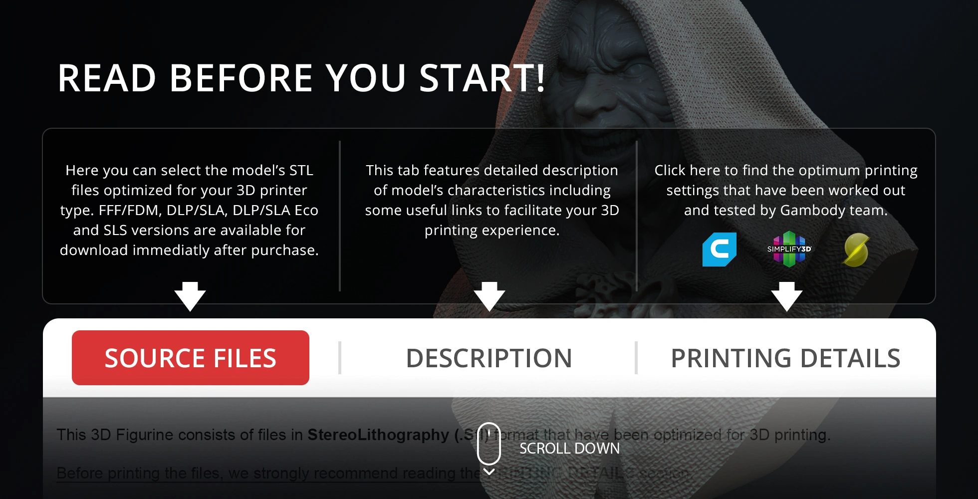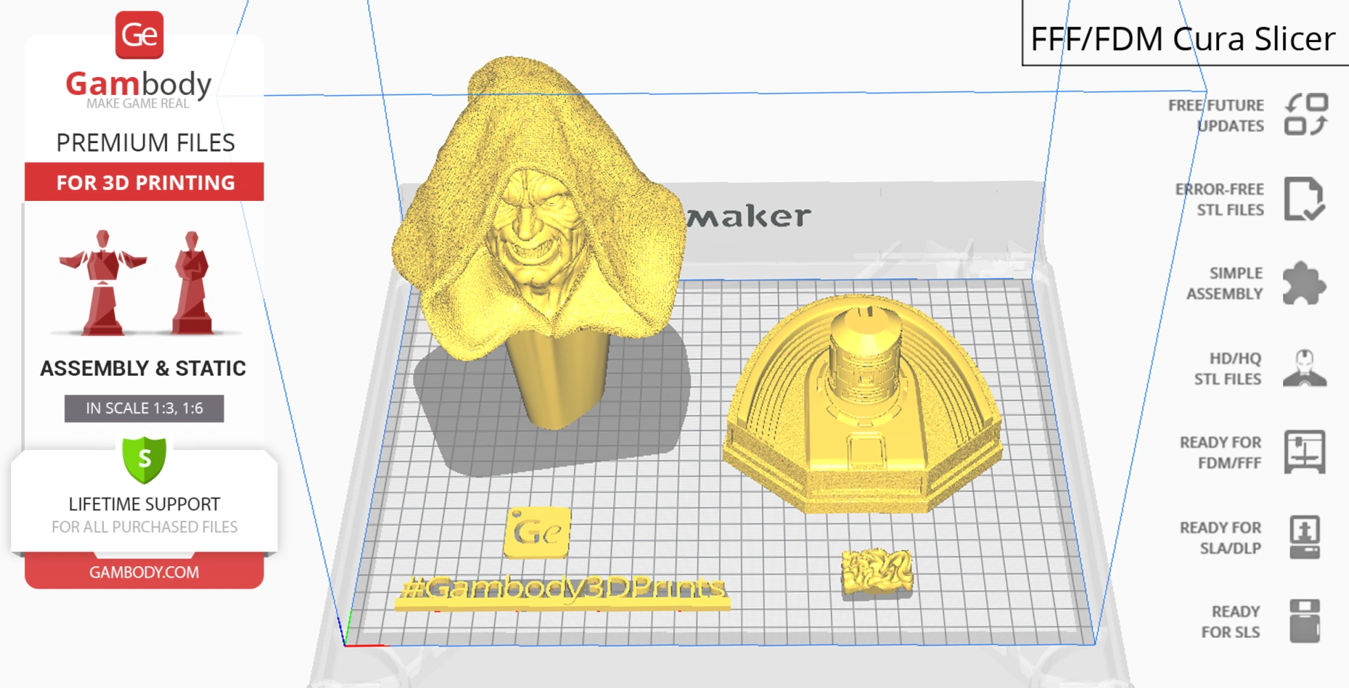 Watch the tutorial on how to assemble the 3D printed Darth Sidious model from the provided 3D print files onGambody YouTube channel.