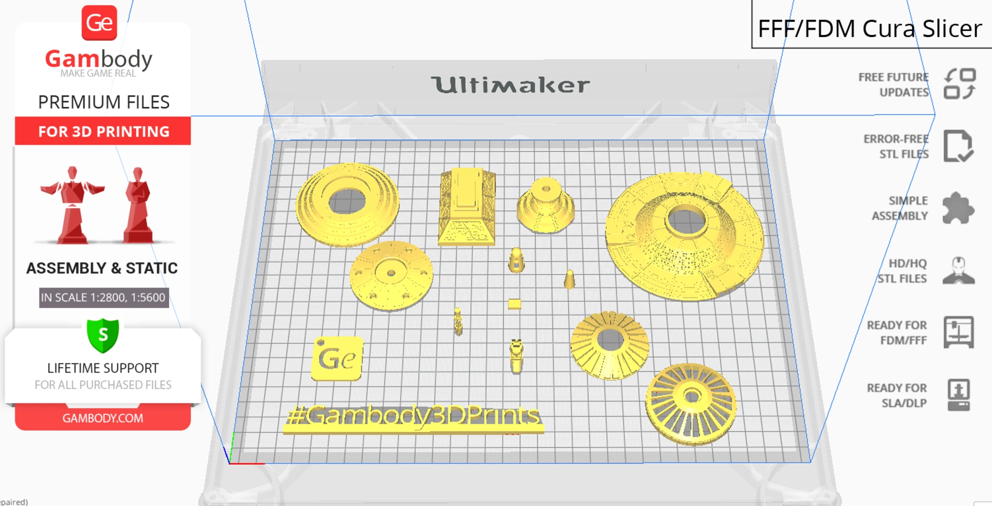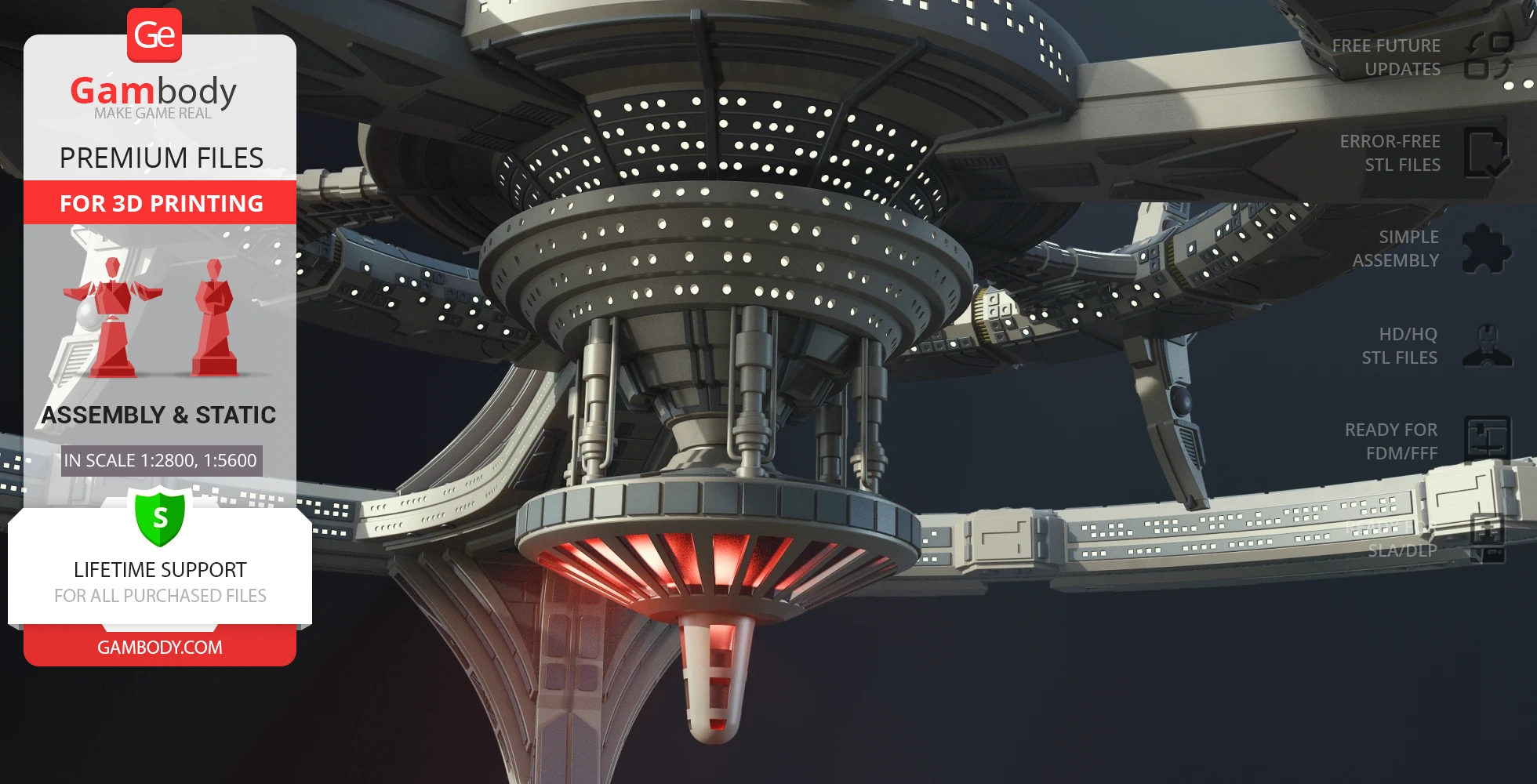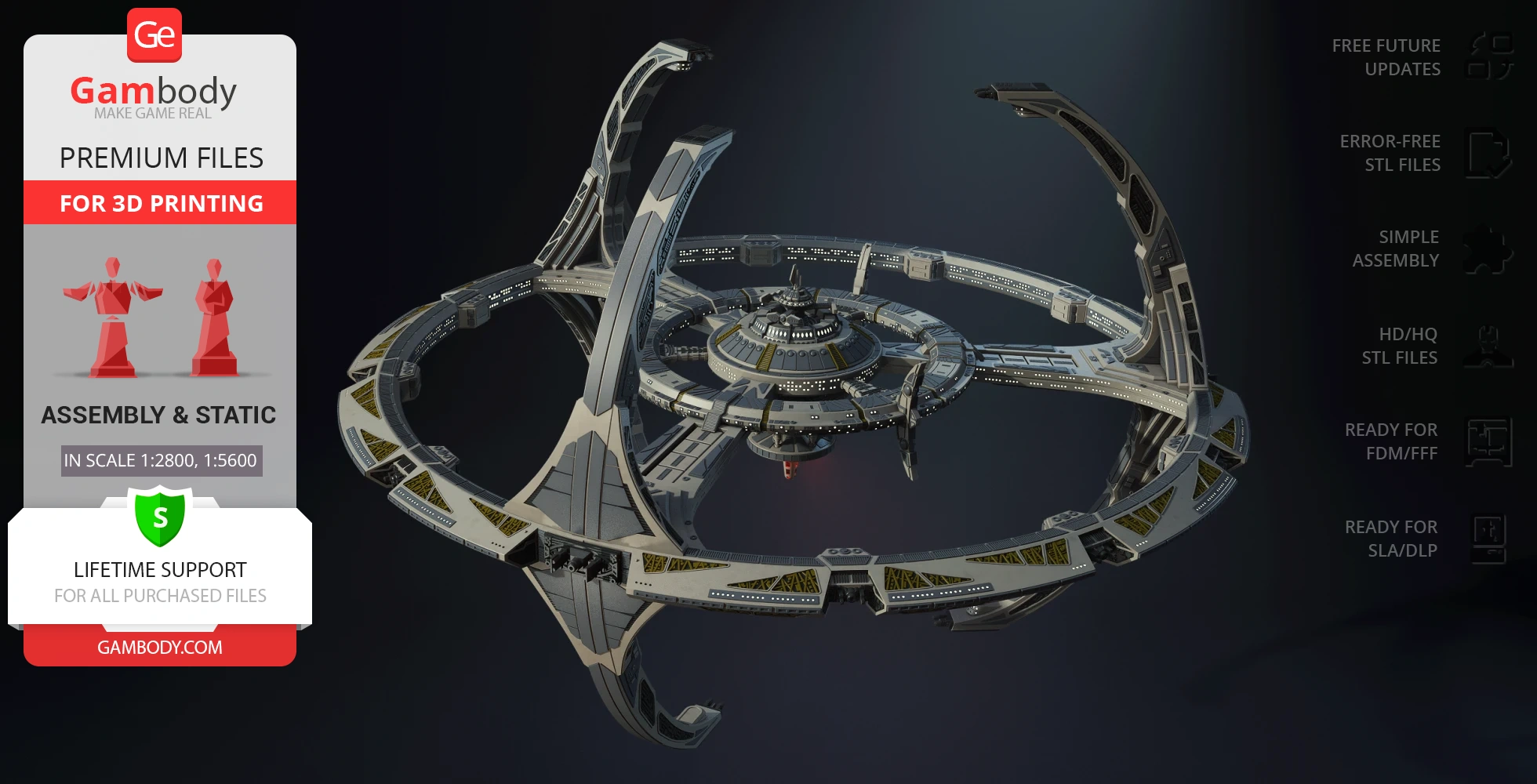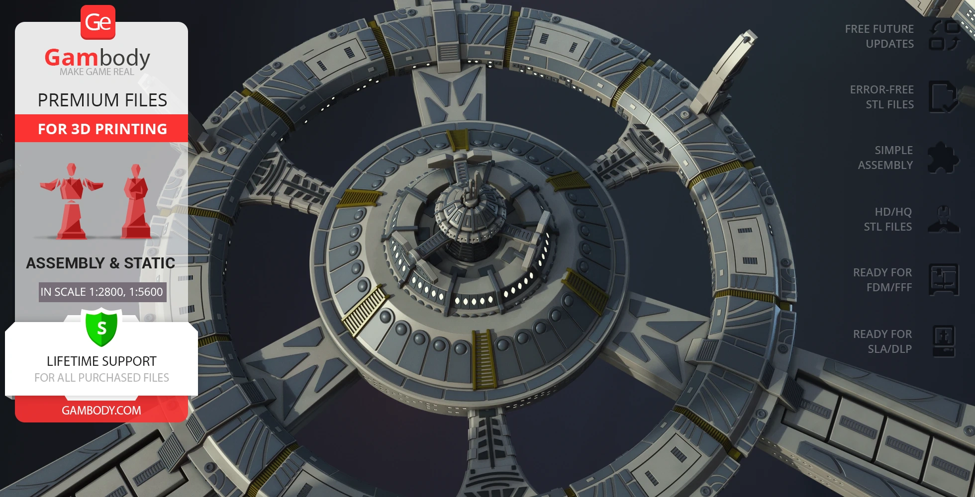 - The model is available in recommended scales of 1:2800 for the FFF/FDM version and 1:5600 for the DLP/SLA version, based on the 1452-meter diameter of the Deep Space 9 station.