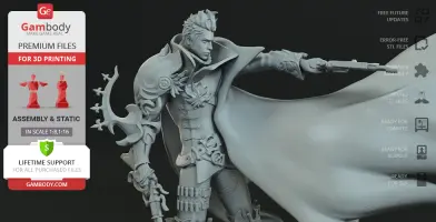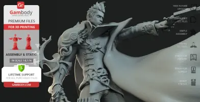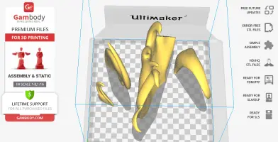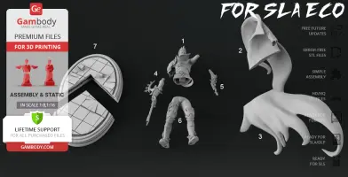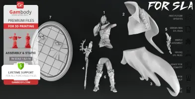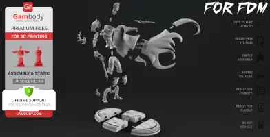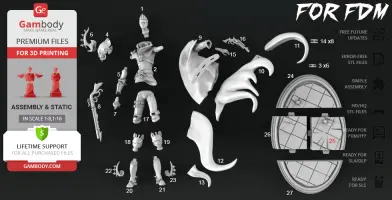 FDM version features:- Contain 27 parts;- Assembly kit includes locks. One part of Lock (14_Ge_lock_10H_(x8)) needs to be printed 8 times. One part of Lock (3_Ge_lock_7S_(x6)) needs to be printed 6 times;- Made with a large raincoat that you can print with resin material;- Made with two types of weapons and a stylized battlefield platform;- All parts are divided in such a way that you will print them with the smallest number of support structures.
