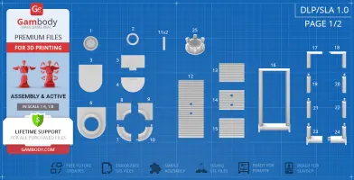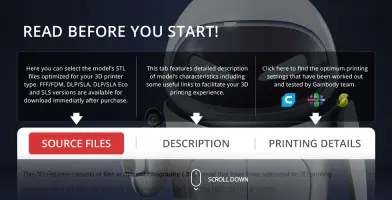 All assembly parts are provided in STL files in recommended positions that were worked out in order to ensure the smoothness of the details’ surfaces after printing and that the 3D printing beginners won't face difficulties when placing the parts on a build plate. When downloading any model's file you will also receive "Assembly Manual" for FFF/FDM 1.0 and DLP/SLA 1.0 versions in PDF format. We highly recommend that you get acquainted with the “Assembly video” and "Assembly Manual" before getting down to the EVE model.