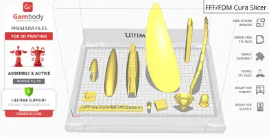 - Assembly of the articulated elements in the FDM version requires additional “pins” that do not come in STL files but can be made out of short pieces of regular 1.75mm filament;