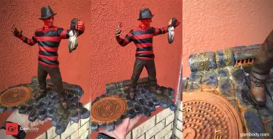 • This model captures Freddy Krueger in his iconic attire: a striped sweater, fedora, scarred face, worn pants, and the infamous razor-bladed glove;