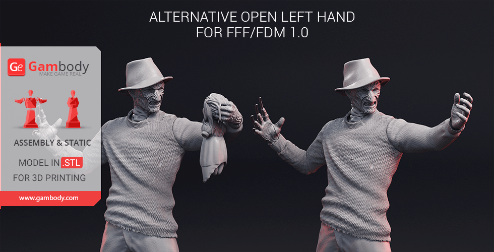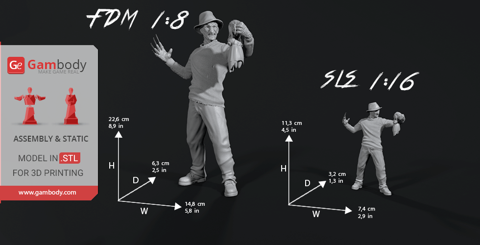 • The model is available in recommended scales of 1:8 for the FFF/FDM version and 1:16 for the DLP/SLA/SLS versions, based on the height of Freddy Krueger.