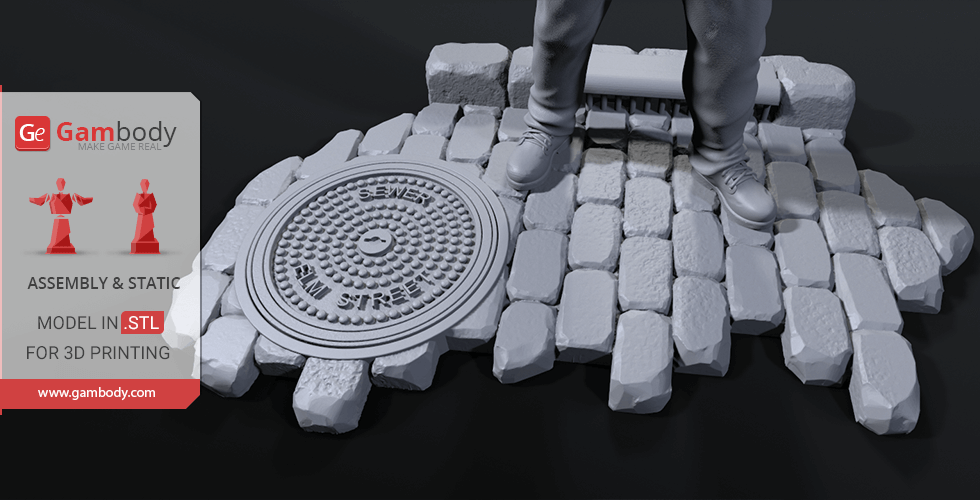 • The model stands on a cobbled circular base with a central manhole cover, designed as a chilling stage for the dream-stalking villain;