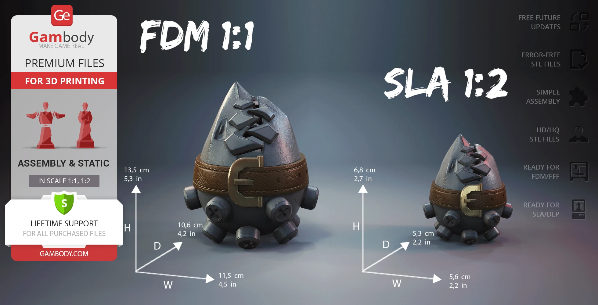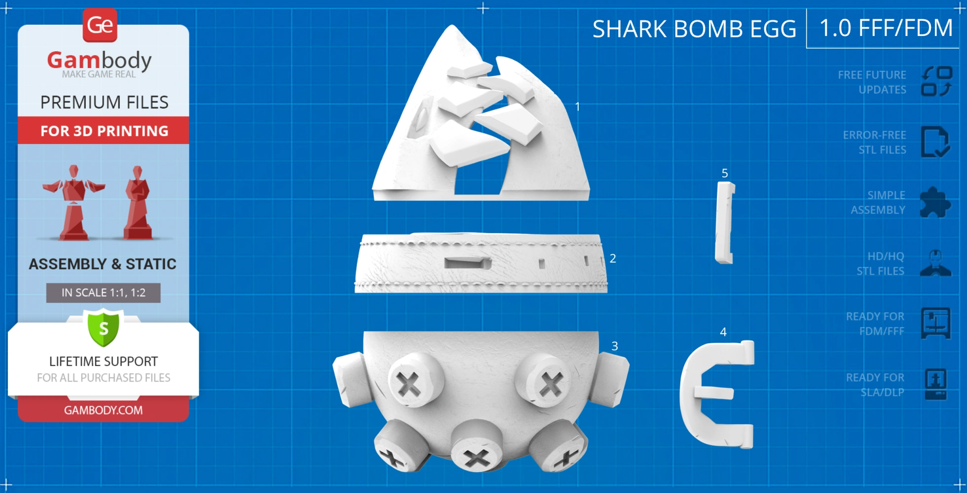 - A printed Shark Bomb Egg model is 135 mm tall, 115 mm wide, and 106 mm deep;