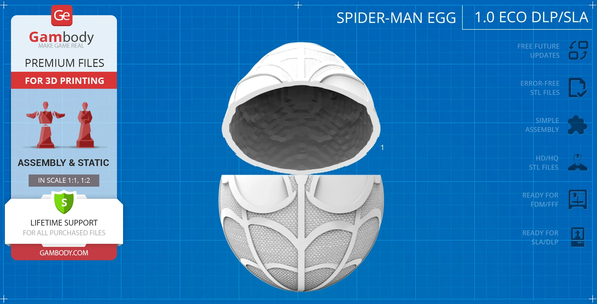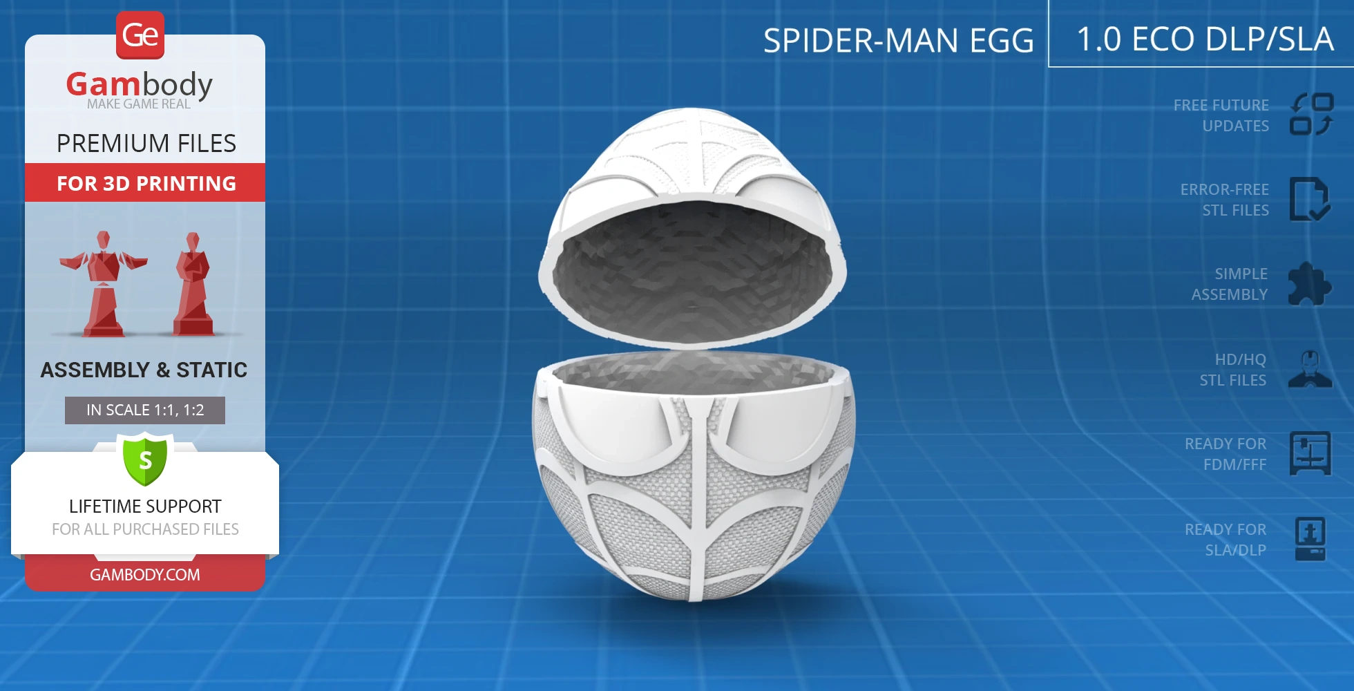 - DLP/SLA Spider-Man Egg: 58 mm tall, 44 mm wide, 44 mm deep;