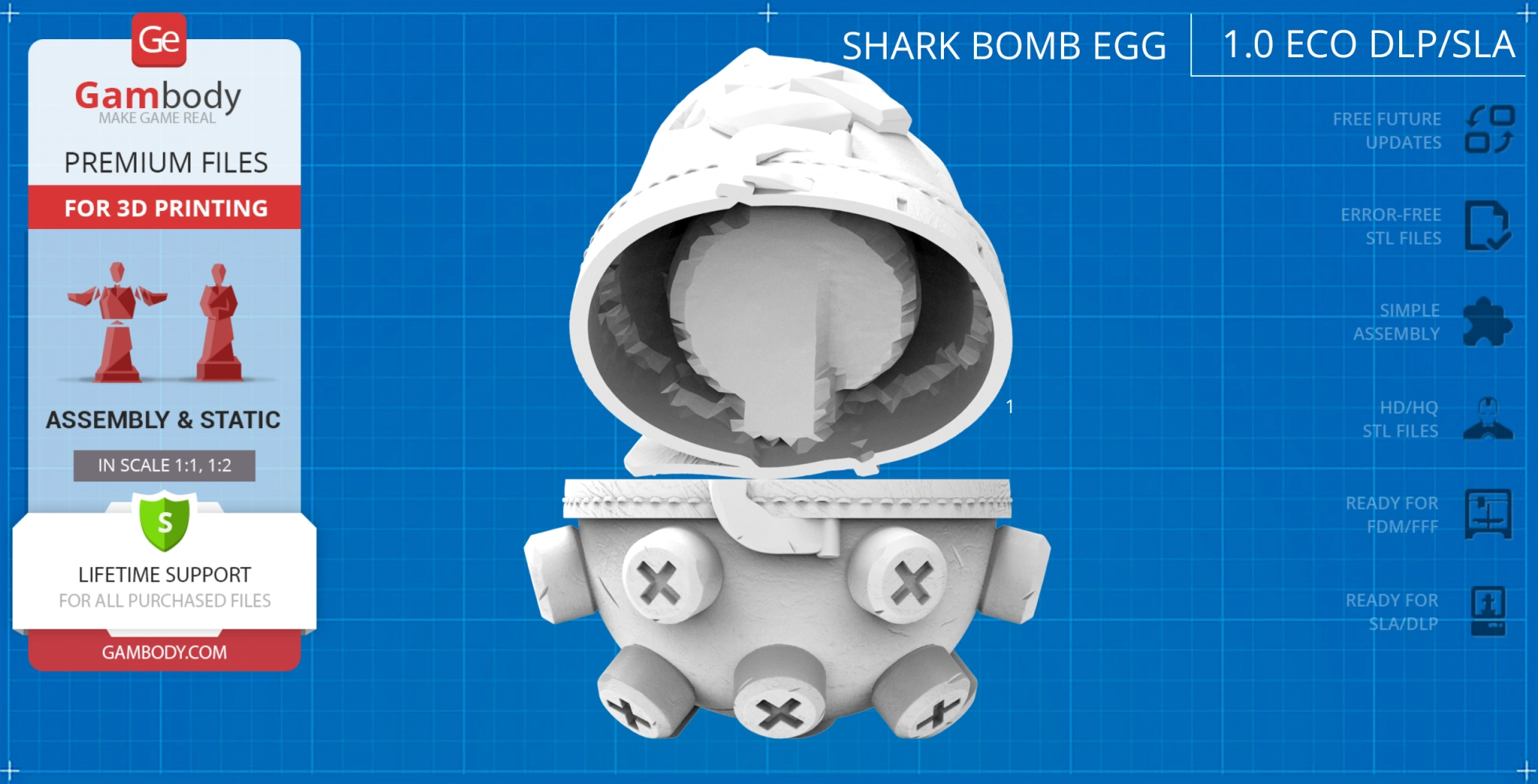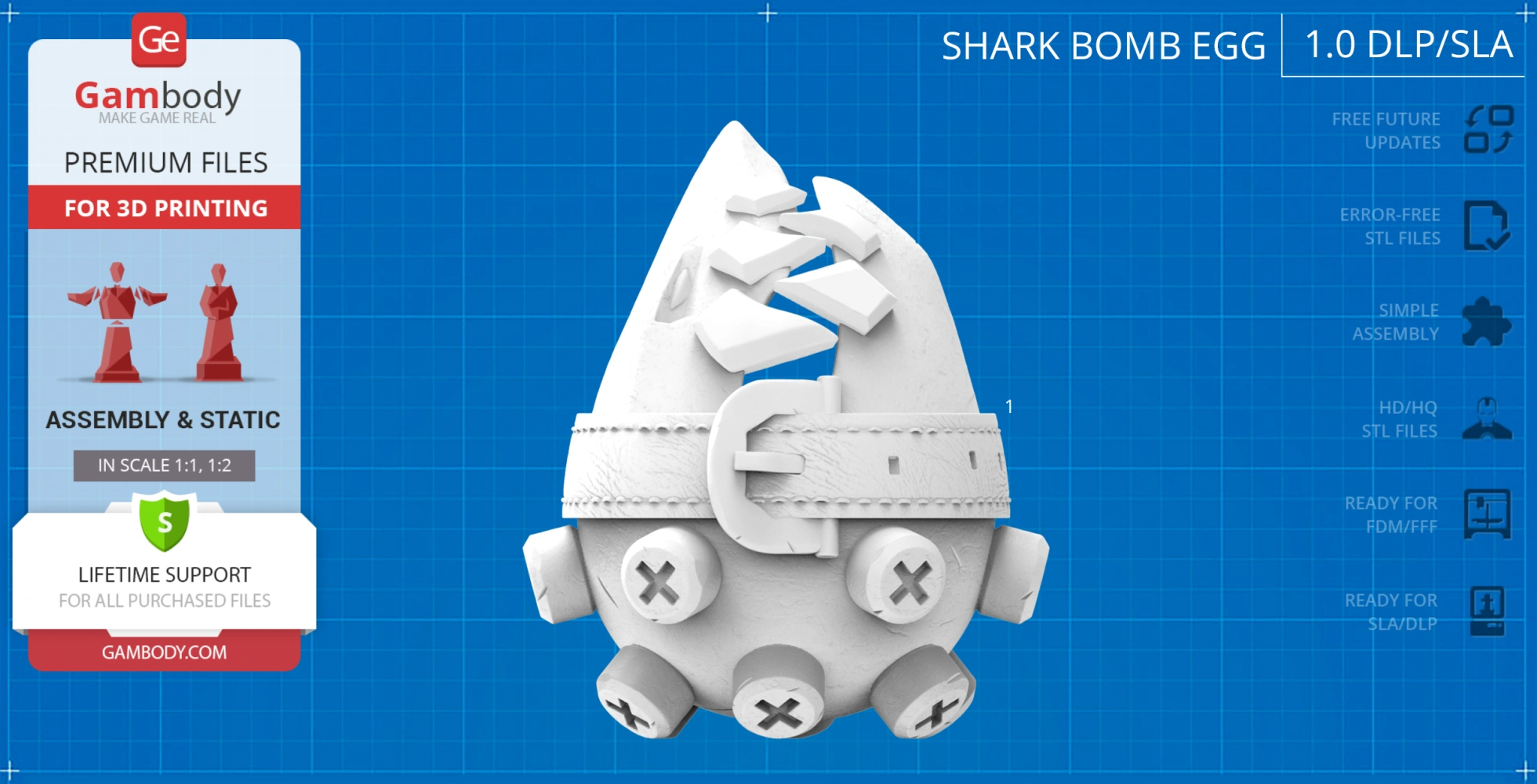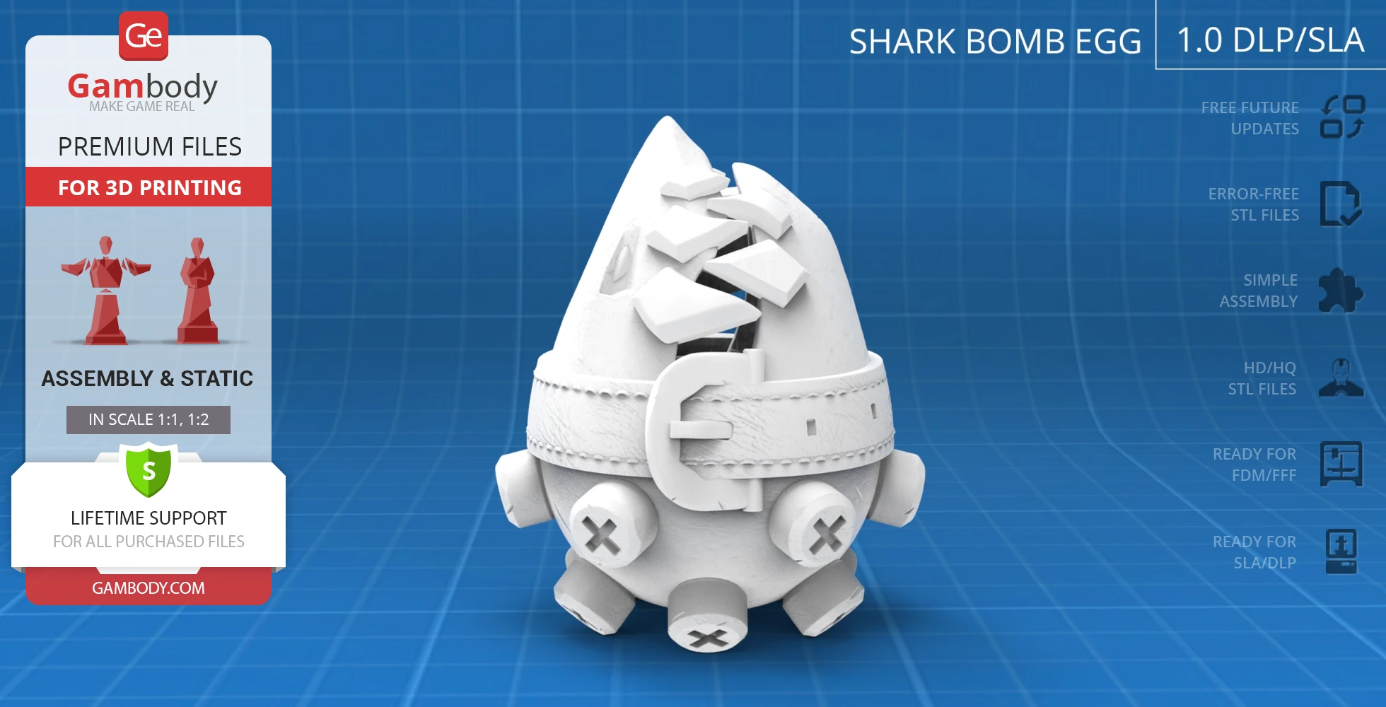 - DLP/SLA Shark Bomb Egg: 68 mm tall, 56 mm wide, 53 mm deep;
