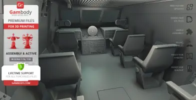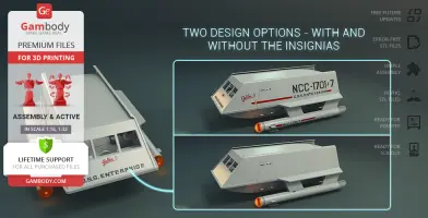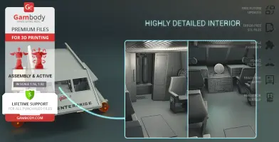 FFF/FDM 1.0 version features:- Contains 80 parts;- A printed model stands 151 mm tall, 256 mm wide, 420 mm deep;- Two design options - with and without the insignias;- You can assemble the model with window frames or glass panels;- Removable rear hatch to access circuit boards;- Opening side doors, a stopper to keep the upper door open;- Highly detailed interior;- Articulated scanners;- Tunnels throughout the ship's body are provided for you to introduce LED wiring and light up the nacelles, front grilles, interior, rear engine grilles, a spot to hide the battery is provided inside the craft;- All parts are divided in such a way that you will print them with the smallest number of support structures.