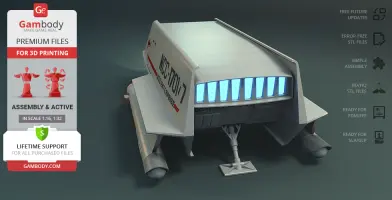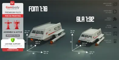 DLP/SLA 1.0 version features:- Contains 65 parts;- A printed model stands 76 mm tall, 128 mm wide, 210 mm deep;- Two design options - with and without the insignias;- You can assemble the model with window frames or glass panels;- Removable rear hatch to access circuit boards;- Opening side doors, a stopper to keep the upper door open;- Highly detailed interior;- Articulated scanners;- Tunnels throughout the ship's body are provided for you to introduce LED wiring and light up the nacelles, front grilles, interior, rear engine grilles, a spot to hide the battery is provided inside the craft;- All parts are divided in such a way to fit the build plates and to ensure that support structures are generated where needed.