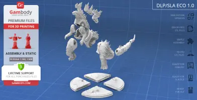 - STL files of Godzilla 2014 3D printing model which consist of 90 parts;- 4 versions of files for this model for FFF/FDM, DLP/SLA, DLP/SLA Eco and SLS;- High-poly detailed figurine of Godzilla 2014;- Assembly Manual for FFF/FDM 1.0 and DLP/SLA 1.0 versions in PDF format;- Detailed settings that we provide as a recommendation for Cura , Simplify3D and Slic3r for the best print;- Full technical support from the Gambody Support Team.