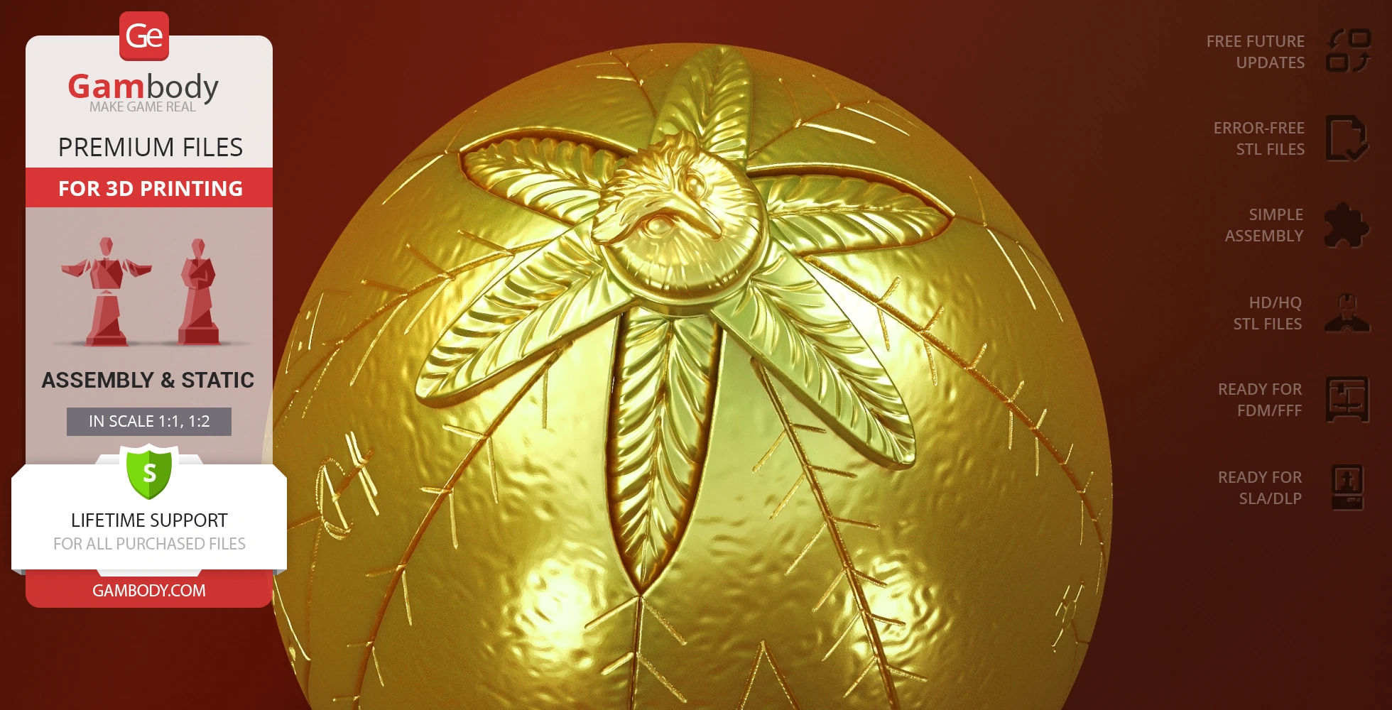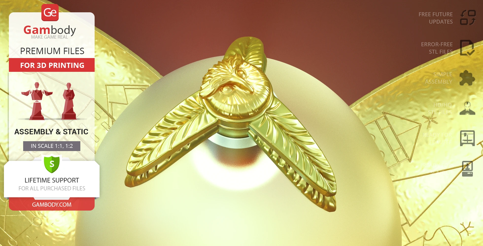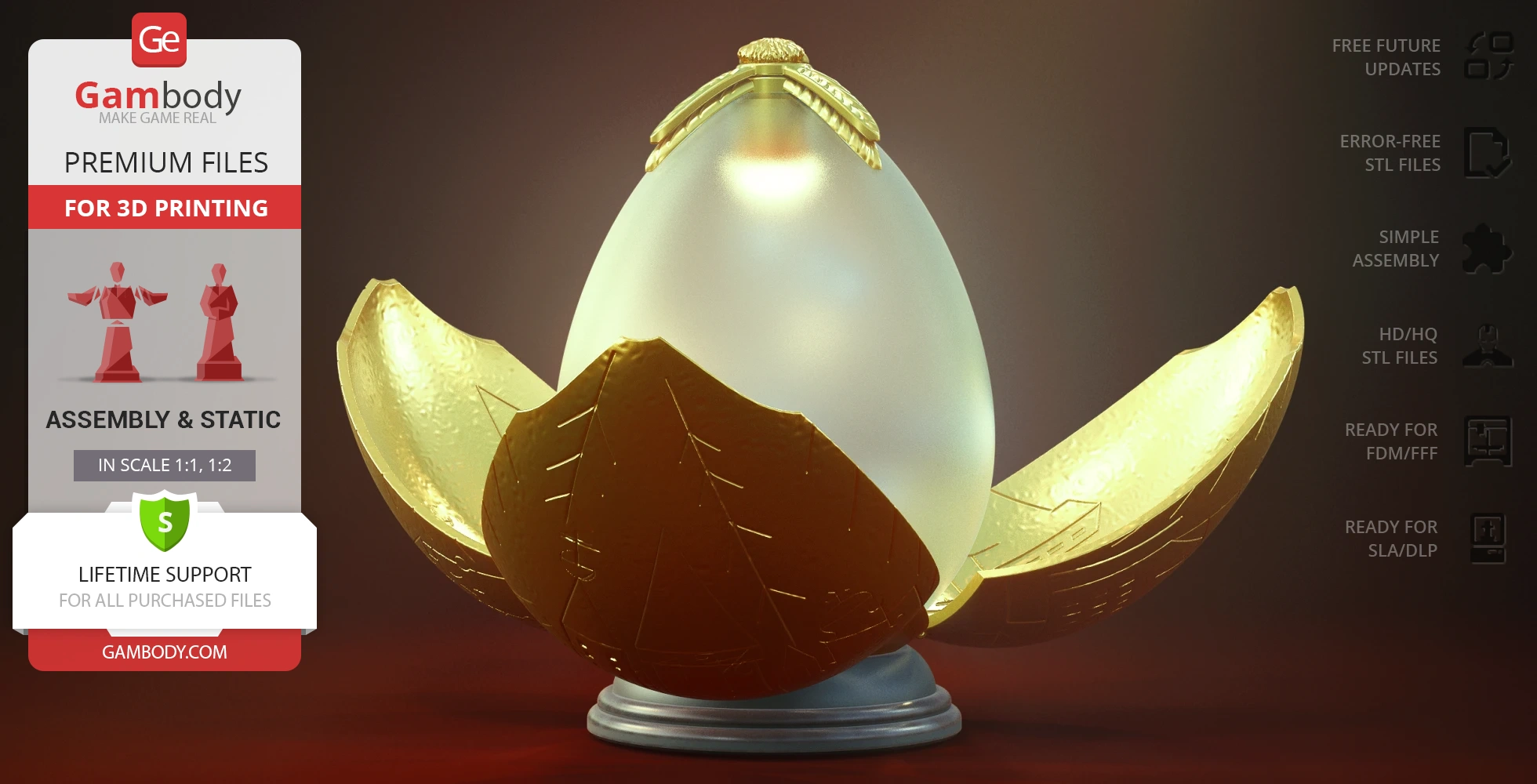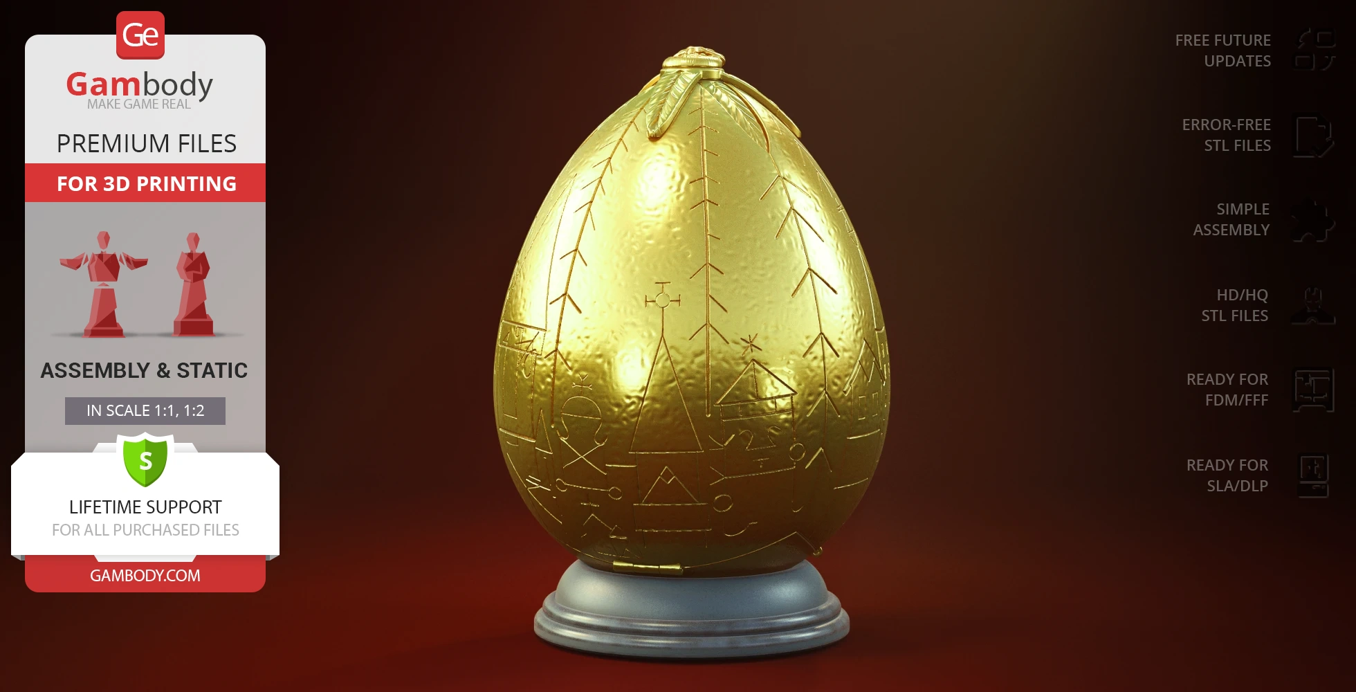 - 2 versions of Golden Egg STL files for FFF/FDM and DLP/SLA— files for all versions are available for download after the purchase;