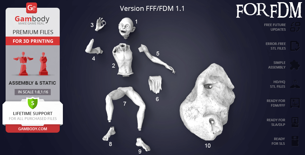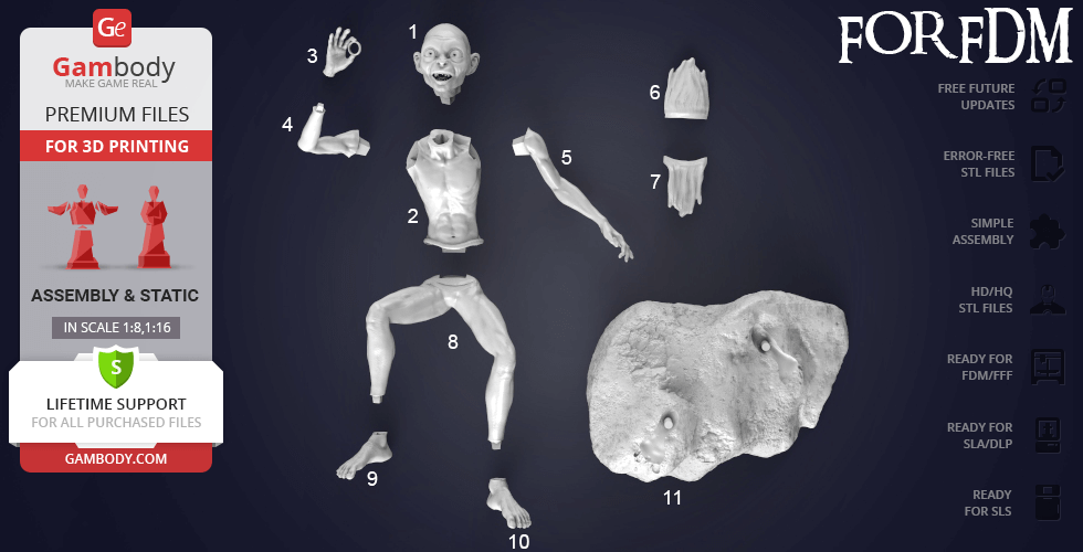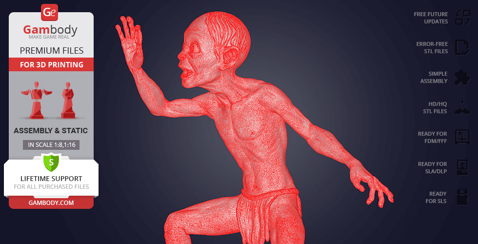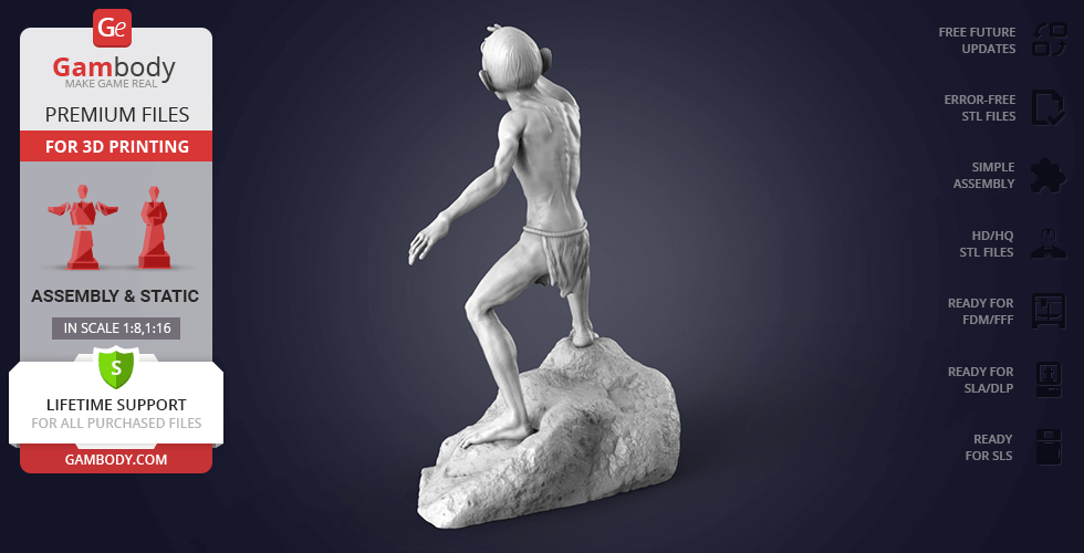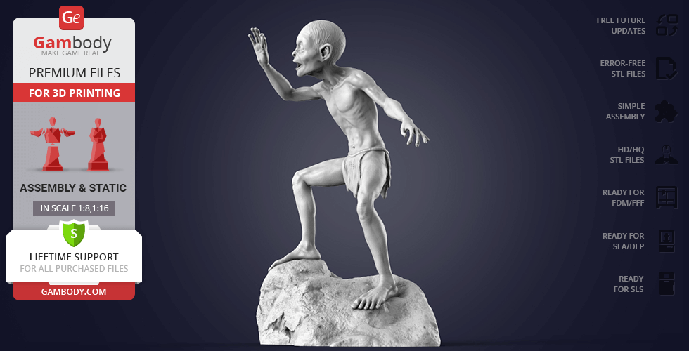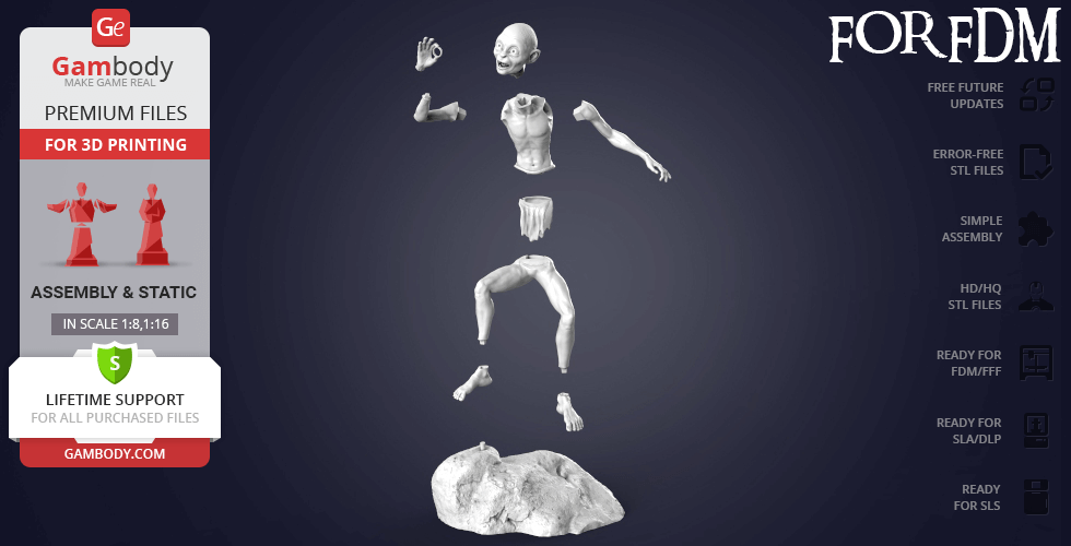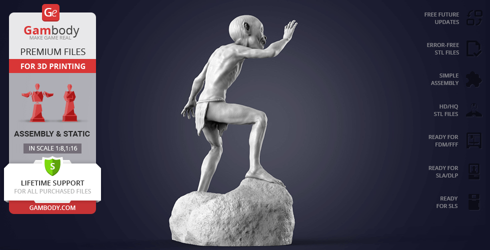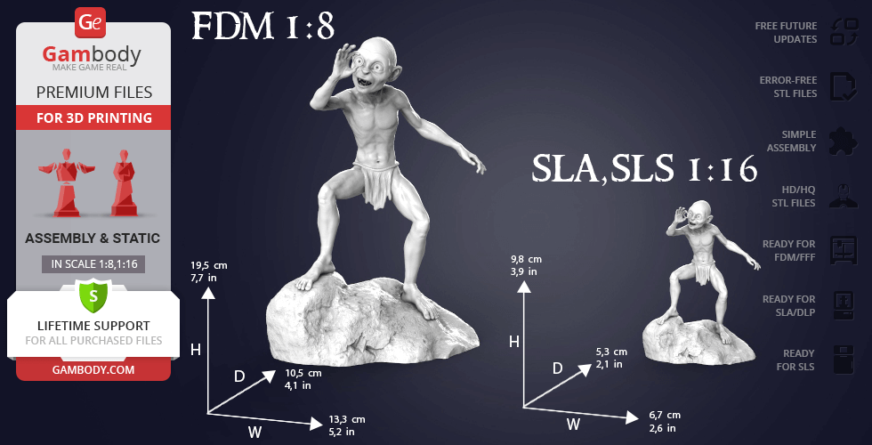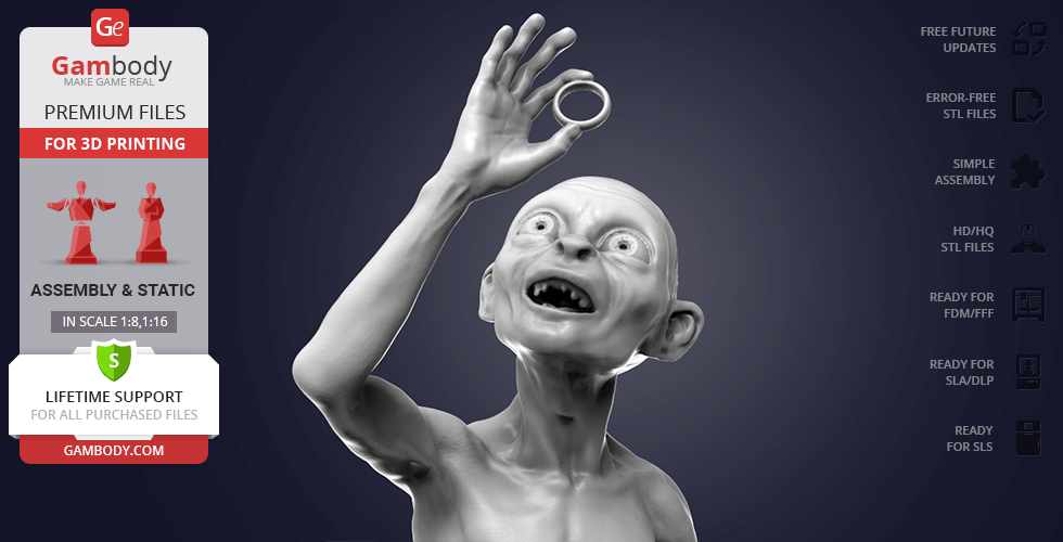 • 4 versions of Gollum & His Precious STL files for FFF/FDM, DLP/SLA and SLS - files for each version are available for download after the purchase;