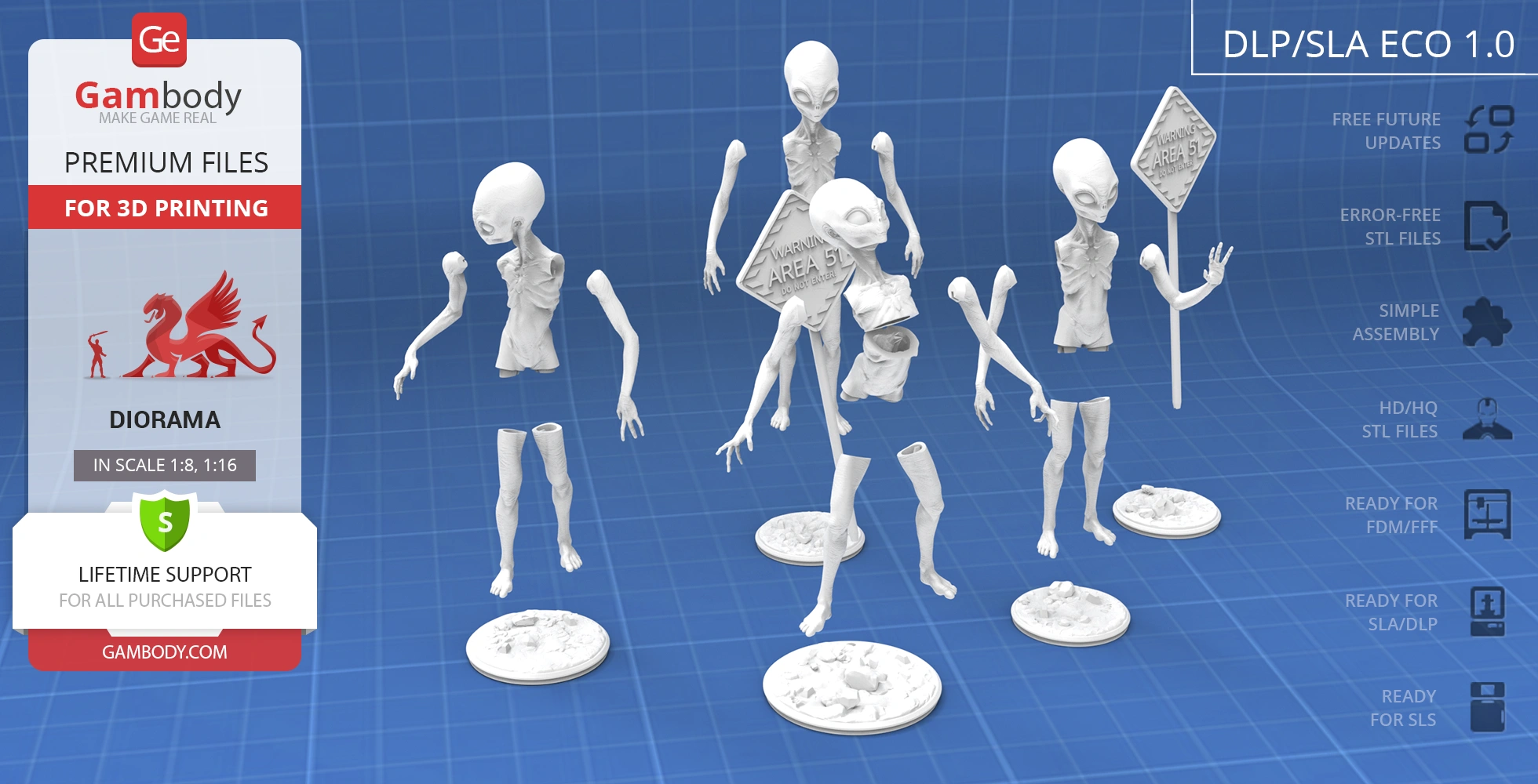 - 4 versions of Grey Aliens Diorama STL files for FFF/FDM, DLP/SLA, DLP/SLA Eco, and SLS — files for all versions are available for download after the purchase;