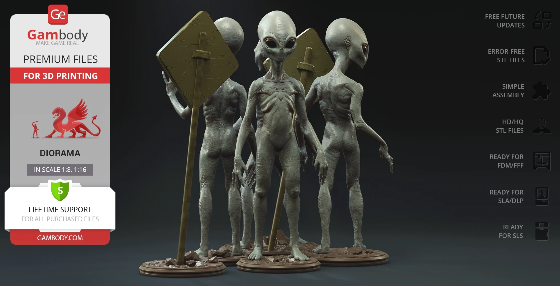 Grey Aliens Diorama 3D Printer Files | Assembly includes 3 version(s) for the supported 3D printer type(s): FFF/FDM, DLP/SLA, SLS. Files are available for download after purchase.
