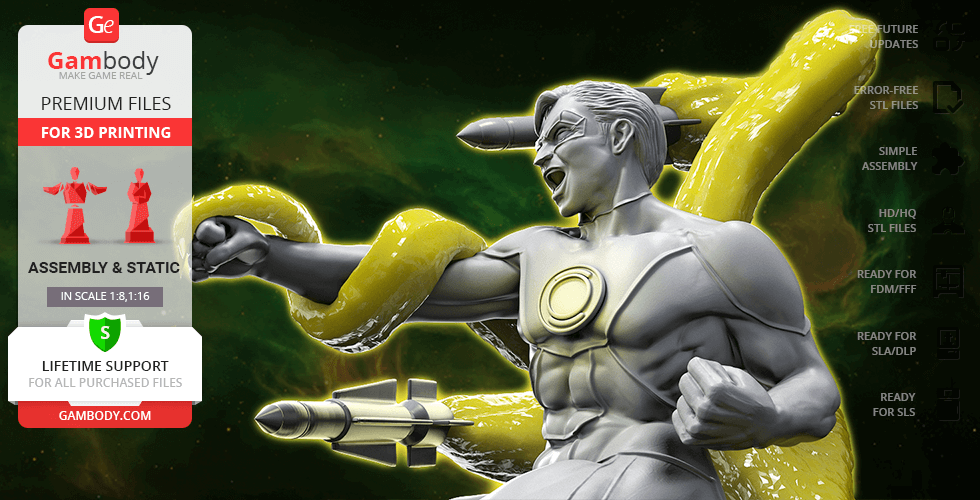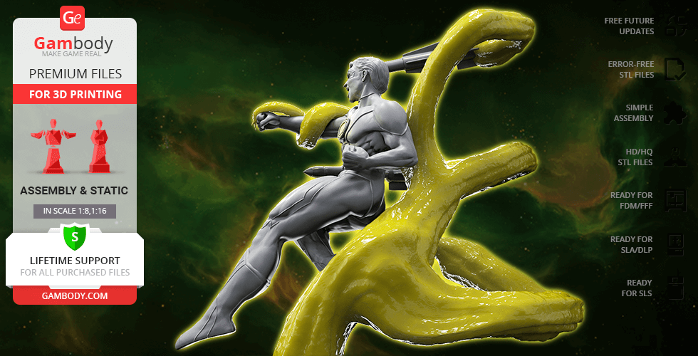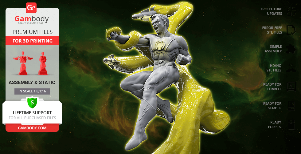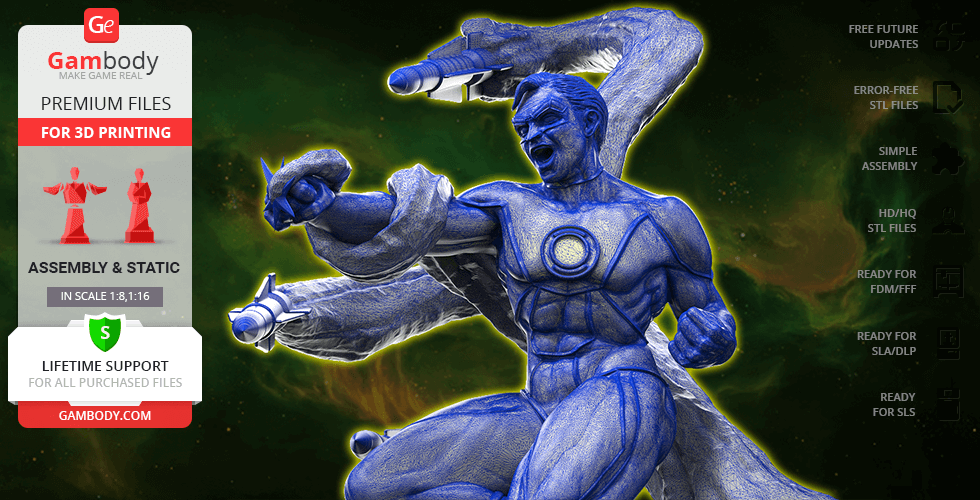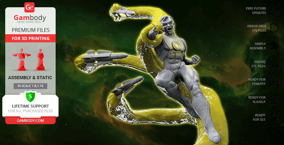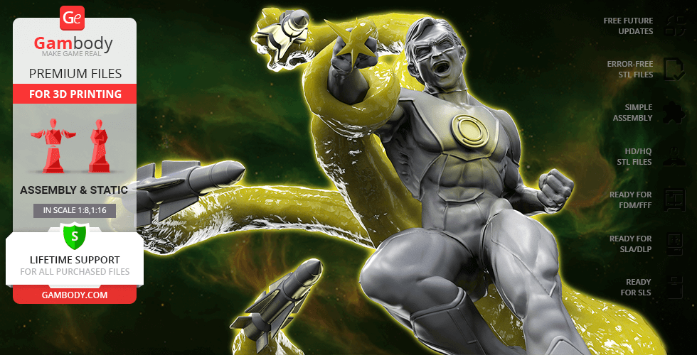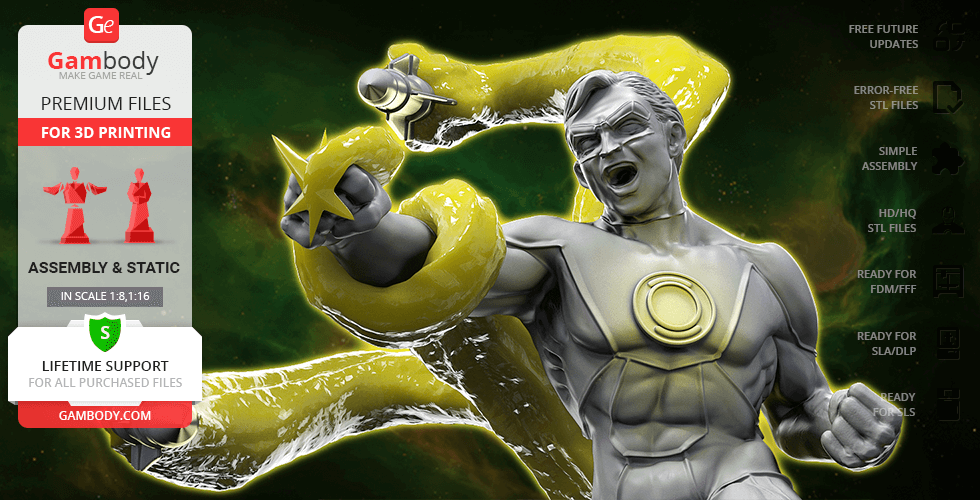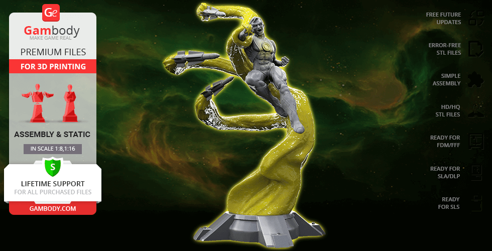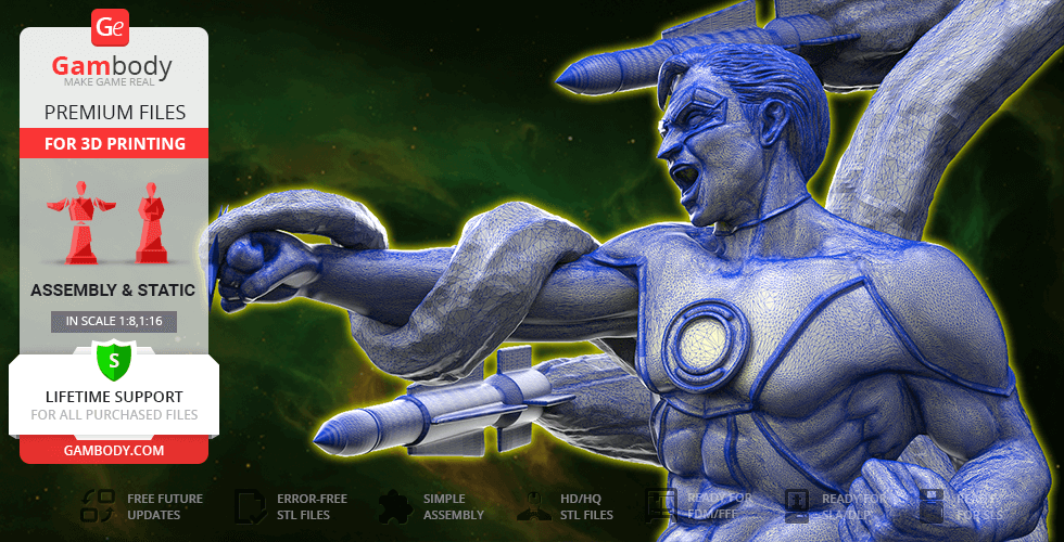 Hal Jordan figurine for 3D printing is a static assembly model and its moderation and adaptation for different types of 3D printers took Gambody team 48 hours in total. The figurine’s anatomy was thoroughly reviewed during the moderation process for the Green Lantern to be depicted harmoniously in the intended flying pose. The model’s cutting was chosen by our team to minimise the amount of filament needed for generated support and some of the parts were hollowed out for you to save resin in the model’s Eco version. Moreover, in order to conceal the places where assembly parts of the figurine must be connected, the model was cut along the contour of Green Lantern suit’s seams. The figurine's platform that resembles the intricate energy conduit generated by Power Ring was divided into 13 separate parts to fit even the smallest 3D printers’ build plates. Besides, the pointed missiles that 3D printing Green Lantern is depicted generating are also available as separate assembly pieces. All assembly parts are provided in STL files in recommended positions that were worked out so to ensure the smoothness of the details’ surfaces after printing and that the 3D printing beginners won't face difficulties when placing the parts on a build plate.