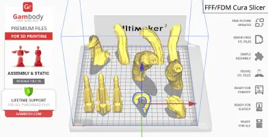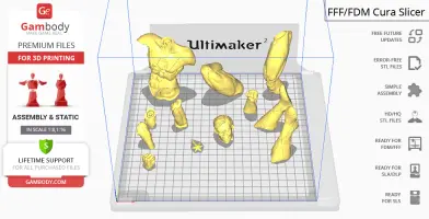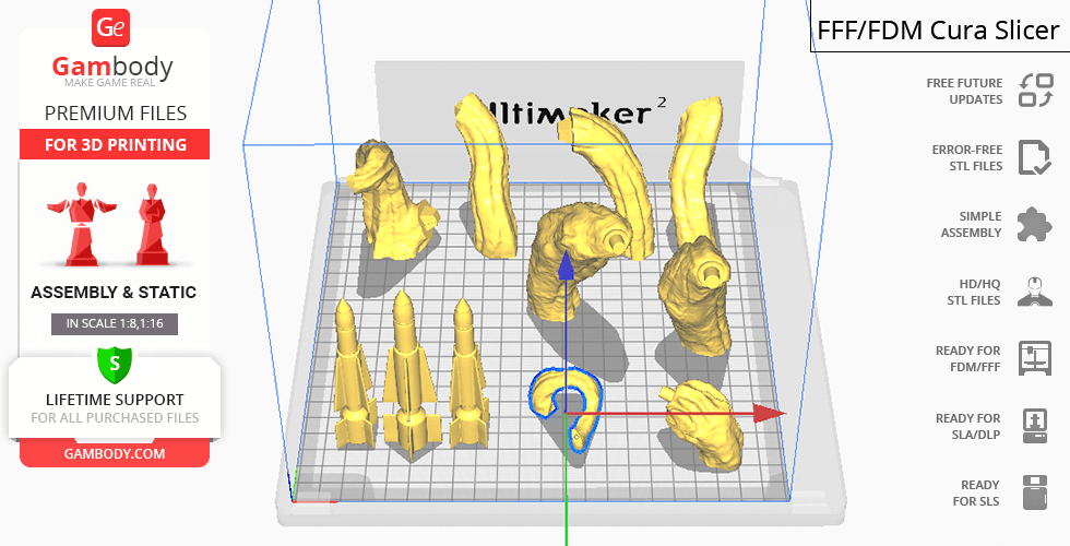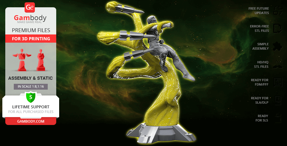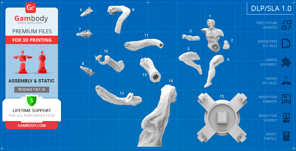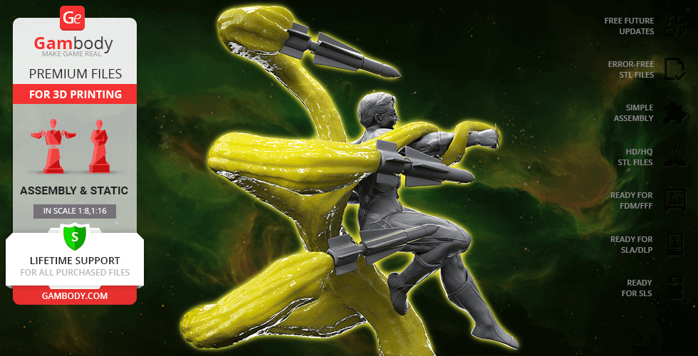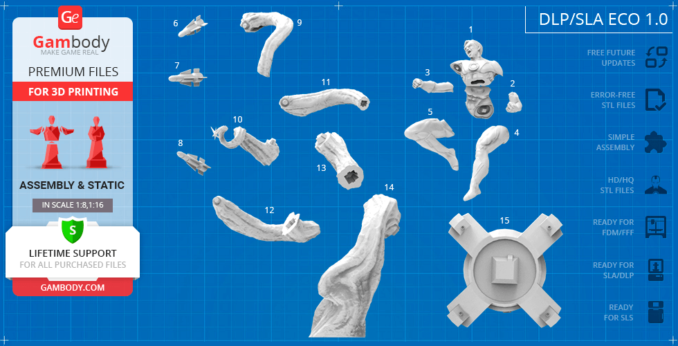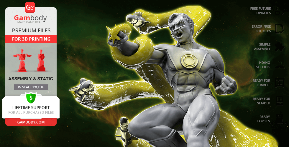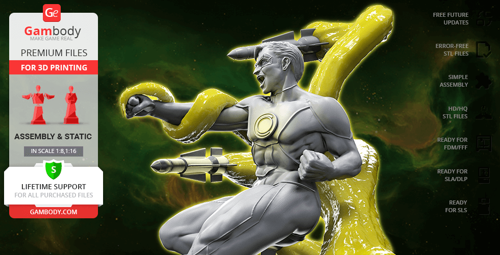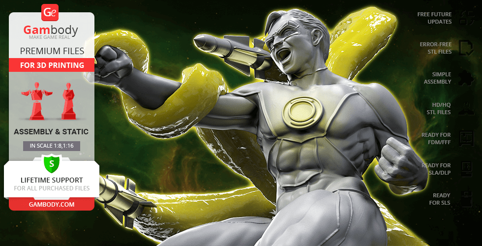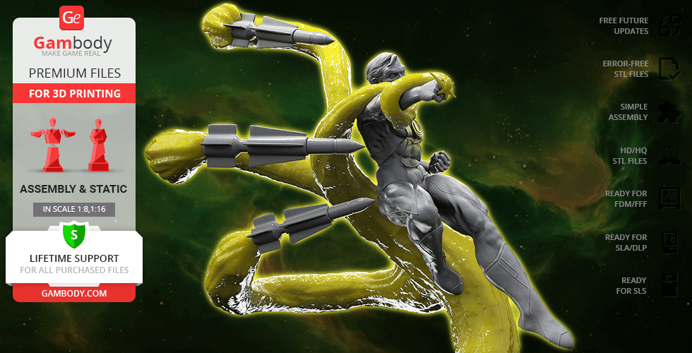 Hal Jordan figurine for 3D printing is a static assembly model and its moderation and adaptation for different types of 3D printers took Gambody team 48 hours in total. The figurine’s anatomy was thoroughly reviewed during the moderation process for the Green Lantern to be depicted harmoniously in the intended flying pose. The model’s cutting was chosen by our team to minimise the amount of filament needed for generated support and some of the parts were hollowed out for you to save resin in the model’s Eco version. Moreover, in order to conceal the places where assembly parts of the figurine must be connected, the model was cut along the contour of Green Lantern suit’s seams. The figurine's platform that resembles the intricate energy conduit generated by Power Ring was divided into 13 separate parts to fit even the smallest 3D printers’ build plates. Besides, the pointed missiles that 3D printing Green Lantern is depicted generating are also available as separate assembly pieces. All assembly parts are provided in STL files in recommended positions that were worked out so to ensure the smoothness of the details’ surfaces after printing and that the 3D printing beginners won't face difficulties when placing the parts on a build plate.