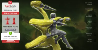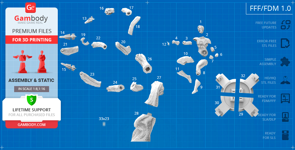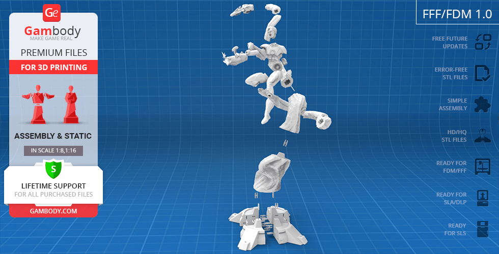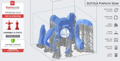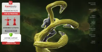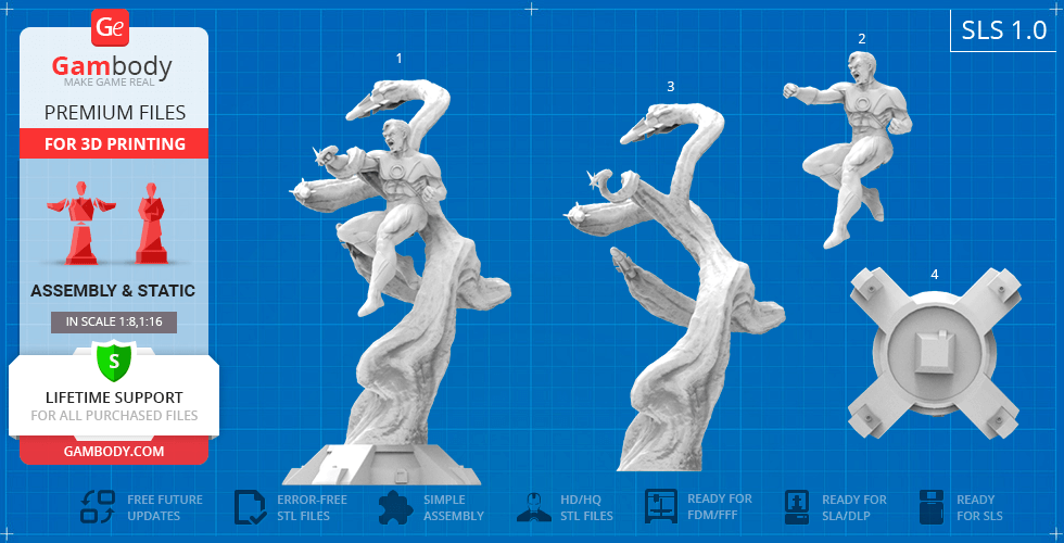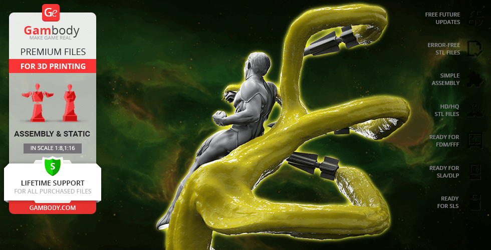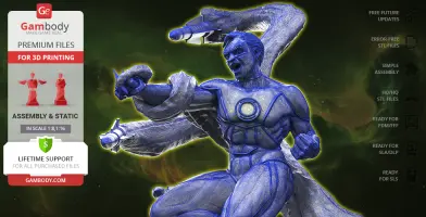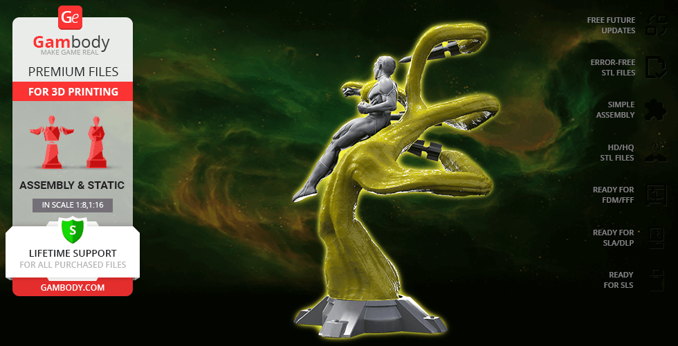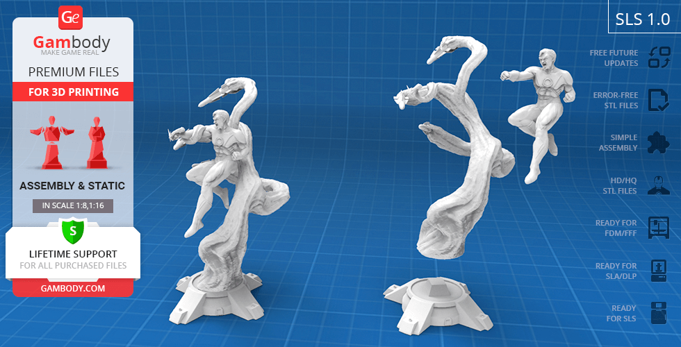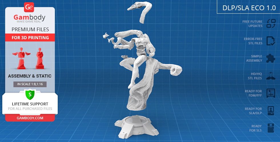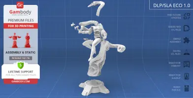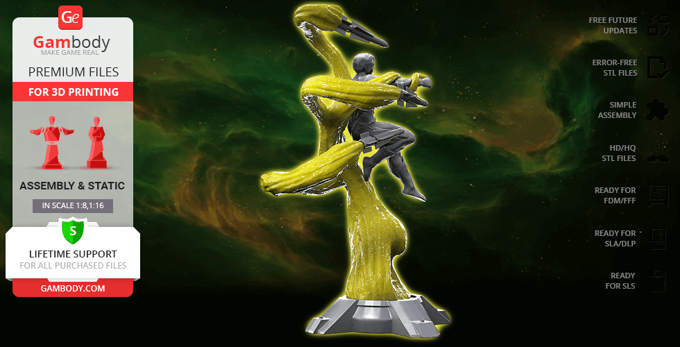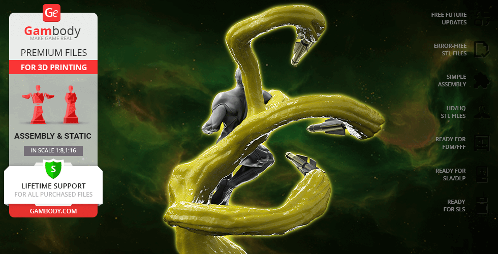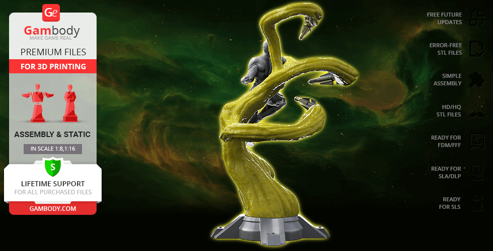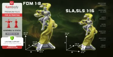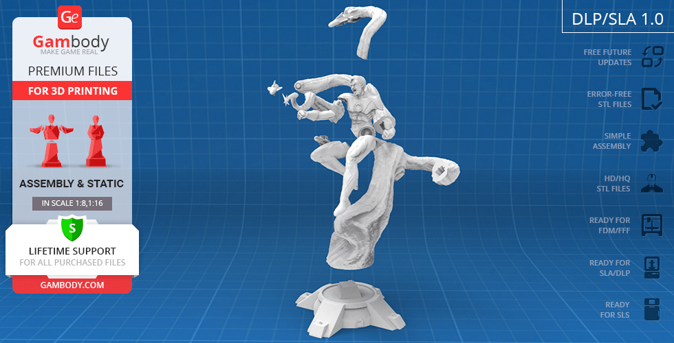 SLS 1.0 version features:- Made as a solid one-piece figurine;- A printed model is 195 mm tall, 111 mm wide, 138 mm deep;- Contains 4 parts - a one-piece model and the figurine with energy conduit and base separated.