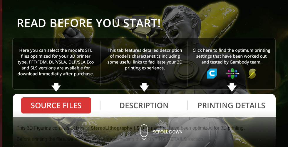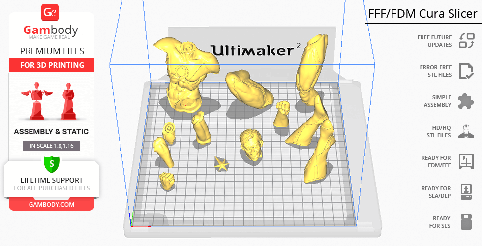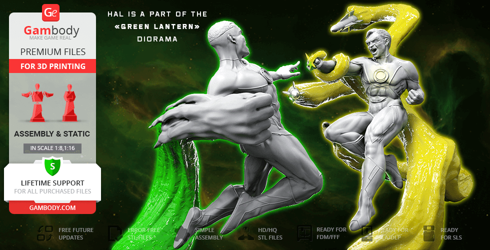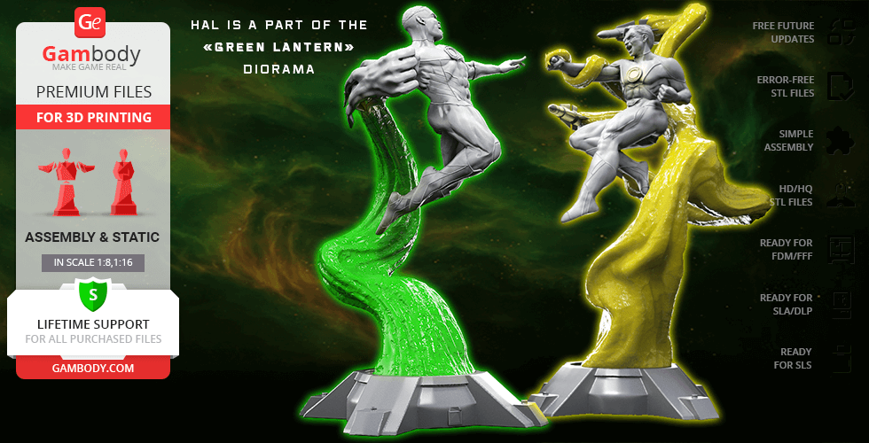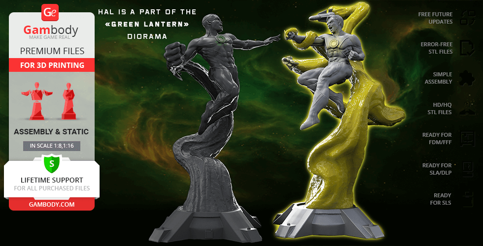 - STL files of Hal Green Lantern 3D Model for 3D printing which consist of 67 parts;- 4 versions of files for this model for FFF/FDM, DLP/SLA, DLP/SLA Eco and SLS;- High-poly detailed figurine of Hal Green Lantern;- Detailed settings that we provide as a recommendation for Cura , Simplify3D and Slic3r for the best print;- Full technical support from the Gambody Support Team.