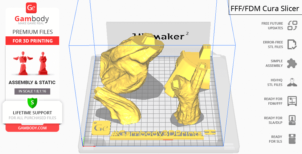 The figurine is saved in STL files, a format supported by most 3D printers. All STL files for 3D printing have been checked in Netfabb and no errors were shown.