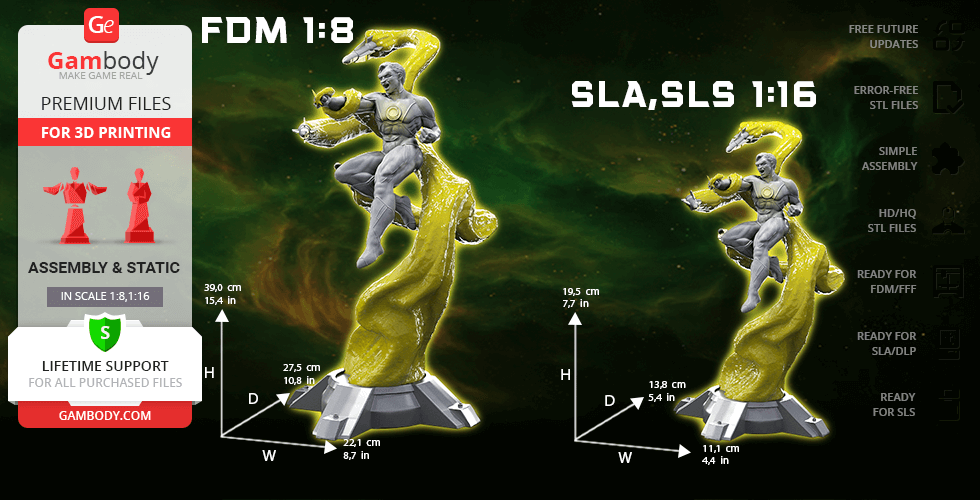 The model's scale was calculated from Hal Jordan's actual height that is 1870 mm. The 3D printing figurine's chosen scale is 1/8 for the FFF/FDM version and 1/16 for the DLP/SLA/SLS versions.
