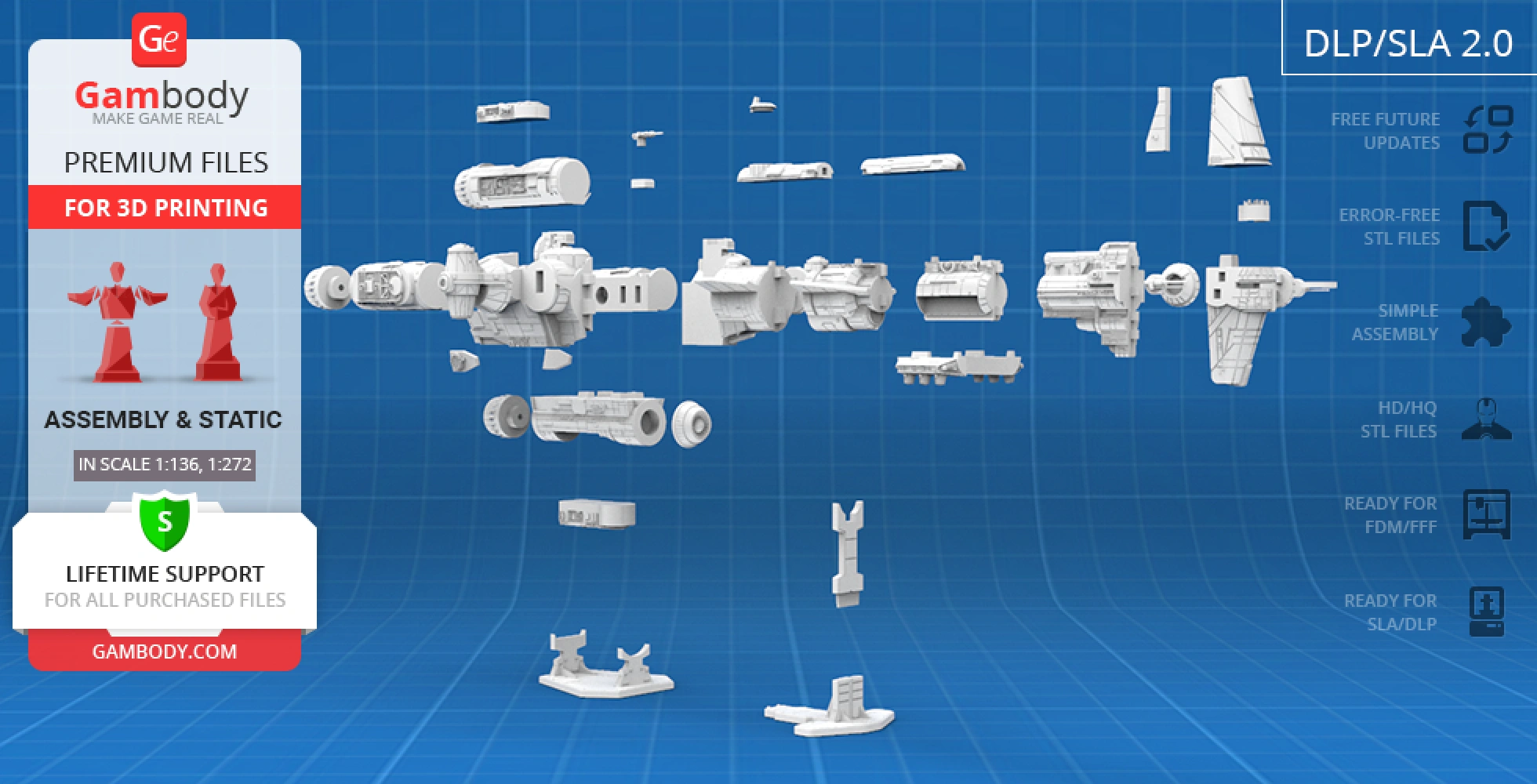 Hammerhead Corvette for 3D printing is a static assembly model and its updating and adaptation for different types of 3D printers took Gambody team 60 hours in total. Due to the fact that this model was first released on Gambody back in 2017, for all Star Wars fans to print the best Sphyrna-class transport possible, the model was upgraded from the ground up, cut into assembly parts anew, and adapted for different types of 3D printers taking into account the present-day technology advancements.