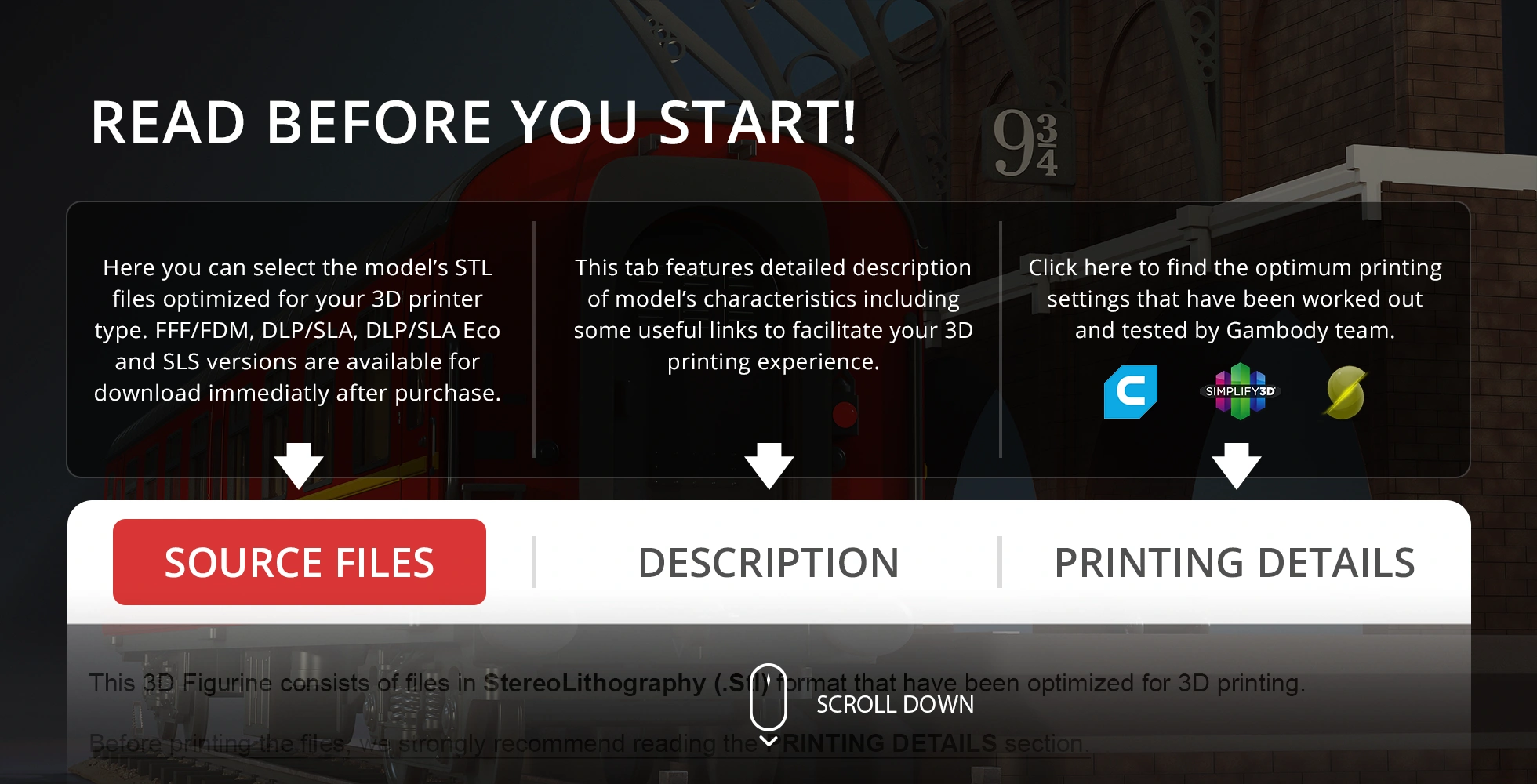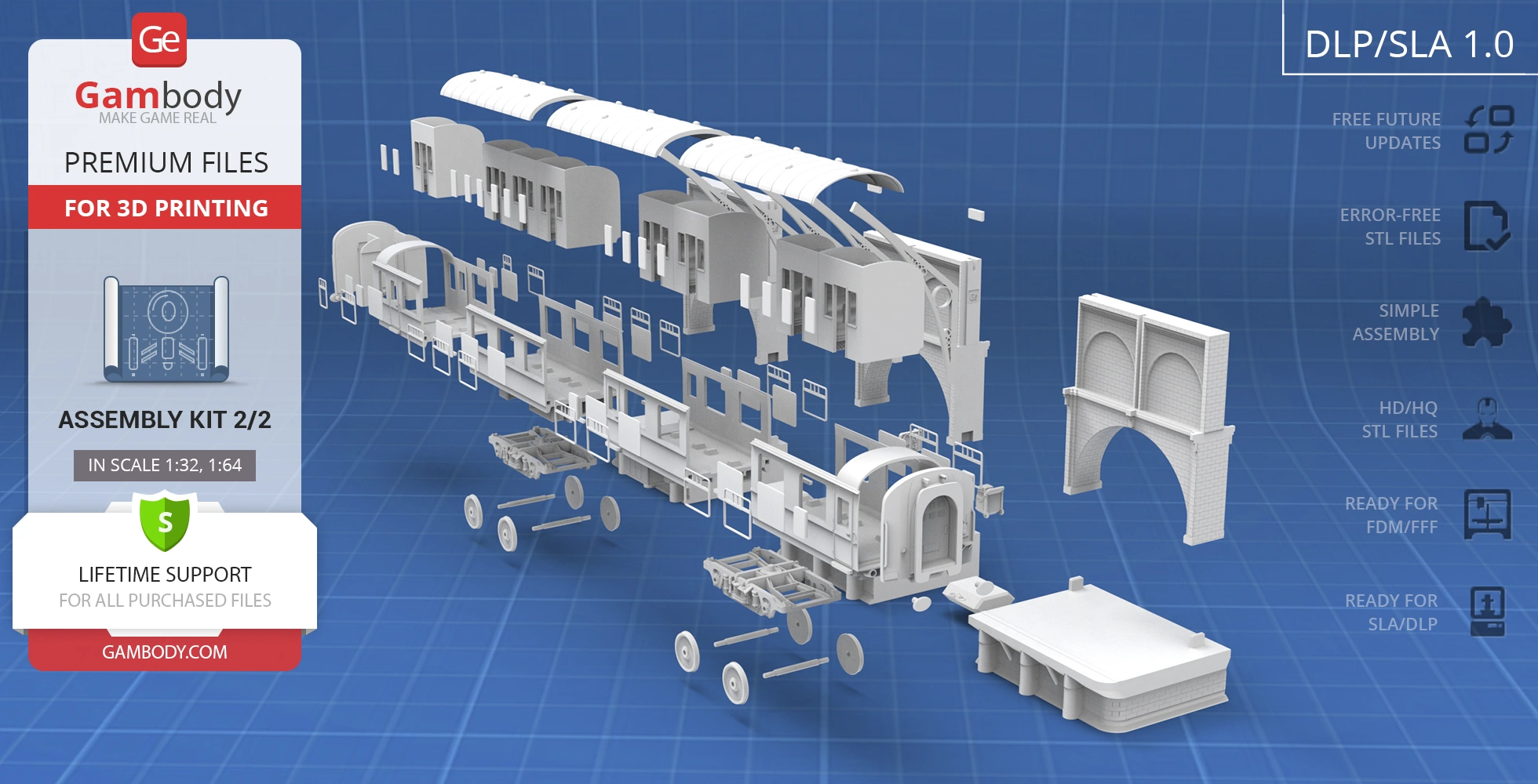 All assembly parts in the FFF/FDM 1.0 version are provided in STL files in recommended positions that were worked out in order to ensure the smoothness of the details’ surfaces after printing and that the 3D printing beginners won’t face difficulties when placing the parts on a build plate. When downloading any model’s file you will also receive “Assembly Manual” for FFF/FDM 1.0 and DLP/SLA 1.0 versions in PDF and video formats. We highly recommend that you get acquainted with the “Assembly Video” and “Assembly Manual” before getting down to the Hogwarts Express Assembly Kit 2 3D printing model.