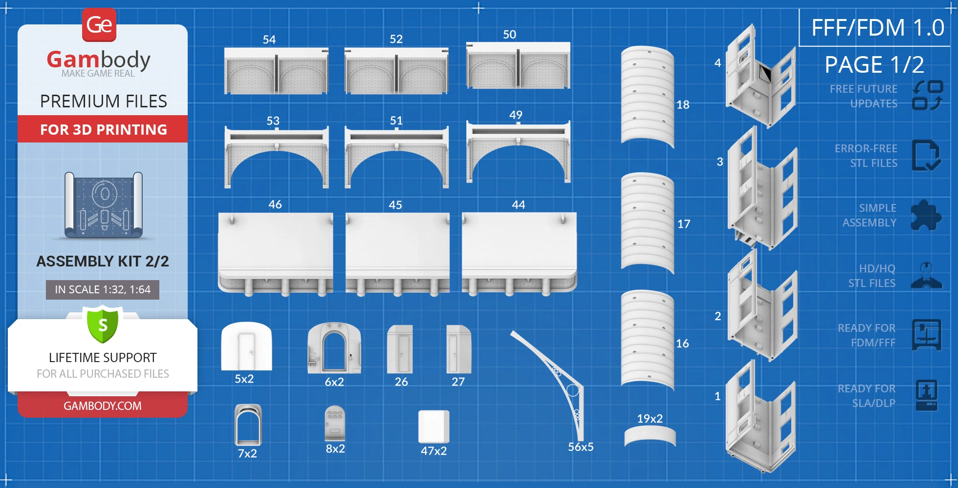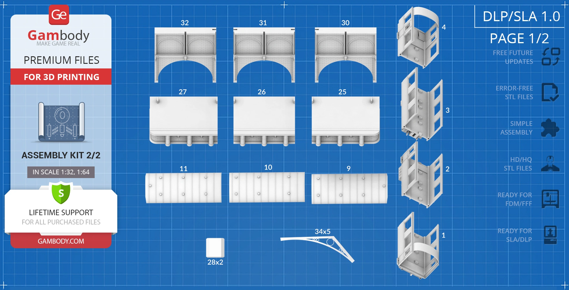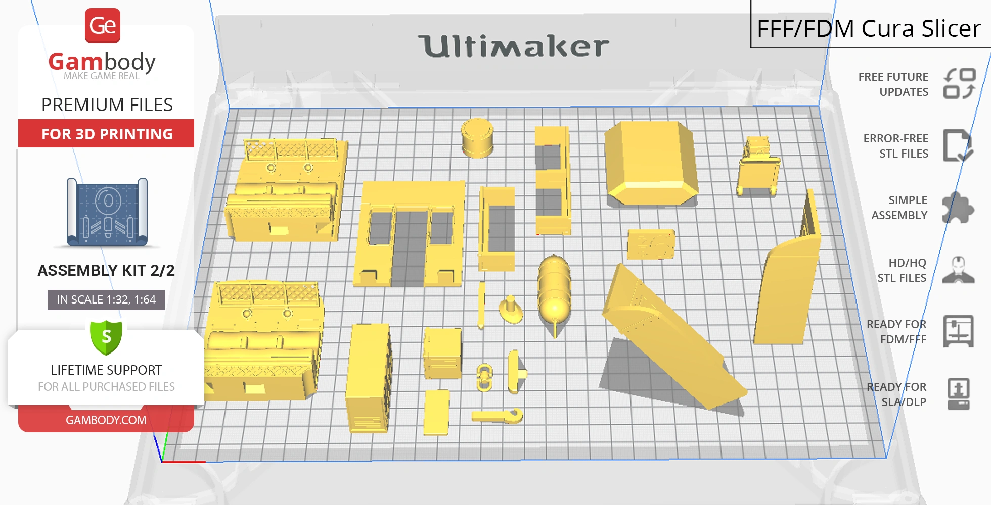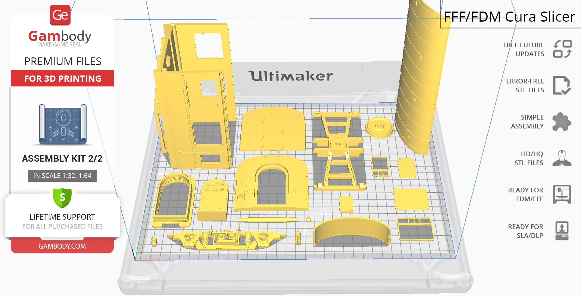 For you to receive the cleanest 3D printing result possible, minimize the amount of filament needed for generated support, and make use of the active elements designed by Gambody Engineers, the platform and the carriage were divided into convenient assembly parts.