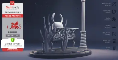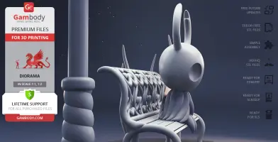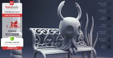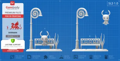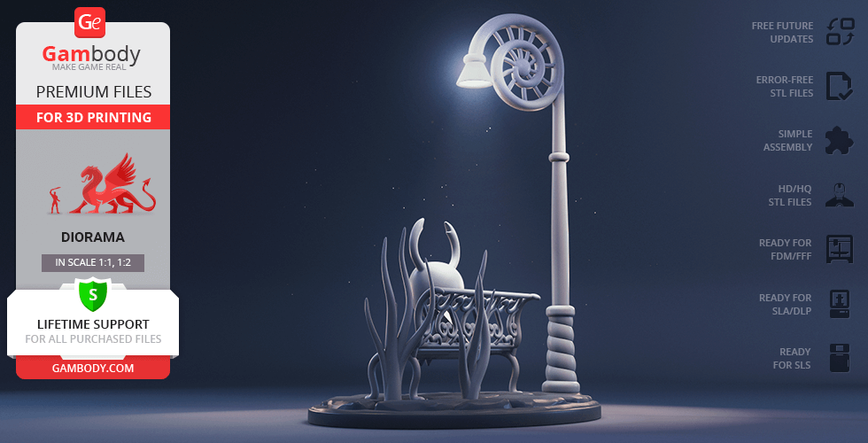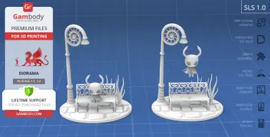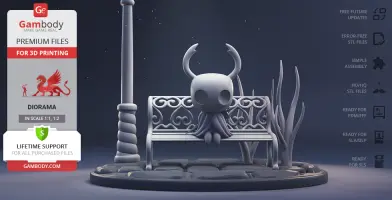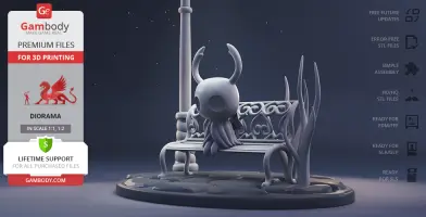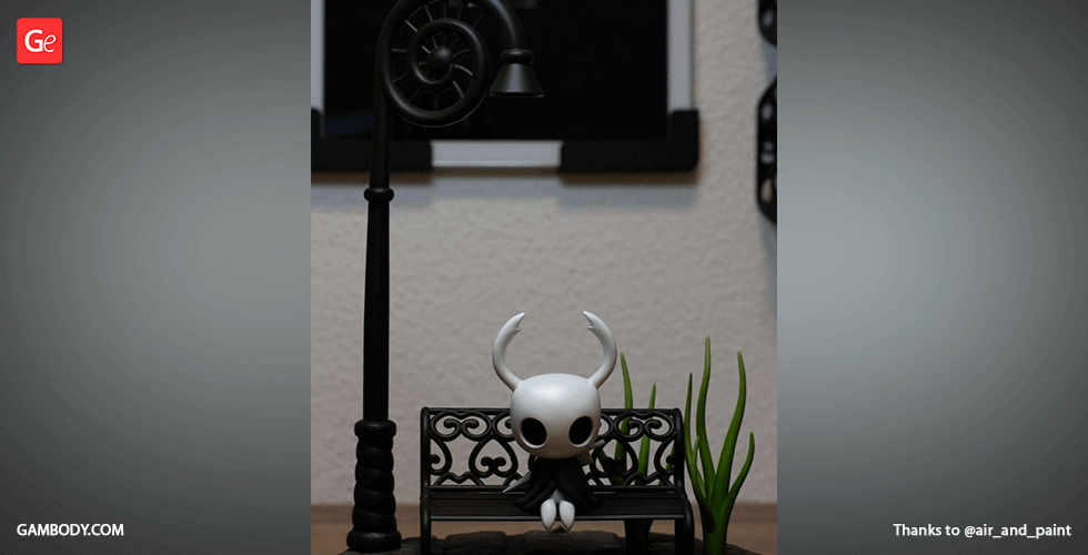 The author of the Hollow Knight 3D print model decided to depict the Little Ghost as a part of a diorama that all fans of the video game will surely find dear and moving. The Little Wanderer holds its Nail while taking a rest on a nice little bench that is known to be a checkpoint throughout Hallownest. Next to the bench is a large lamppost with an intricate design that is well-liked by the Hollow Knight’s fans, and a couple of simple bushes to complete a touching diorama for your display shelf.