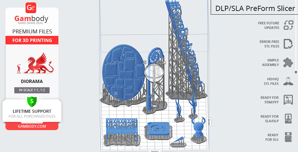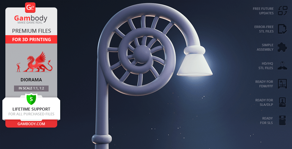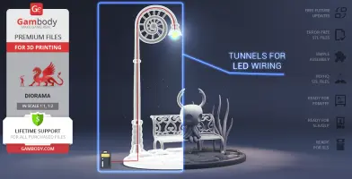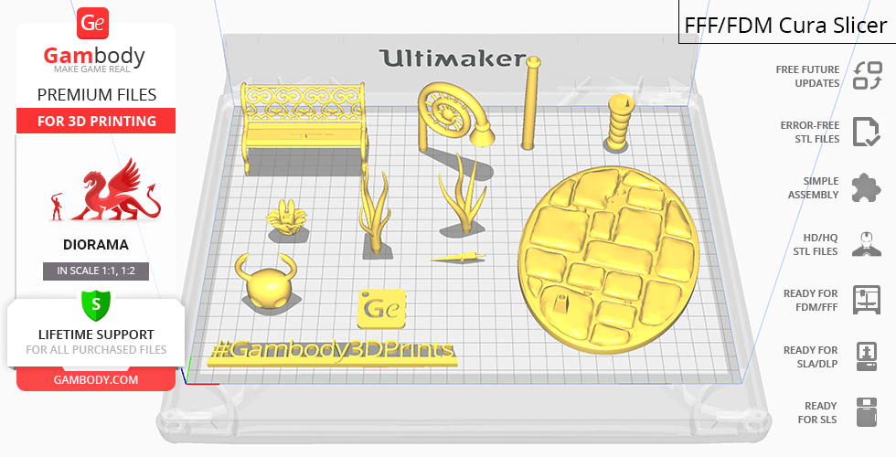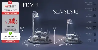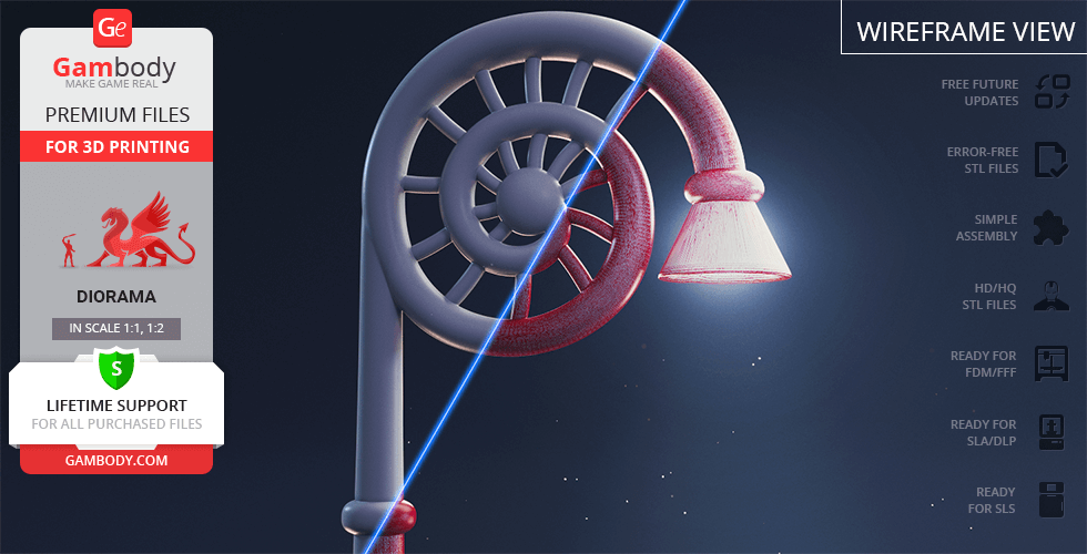 - To achieve the cleanest 3D printed result possible, the Knight’s head, Nail, both plants, the bench, as well as the model’s platform and lamppost were separated and come as independent assembly parts;