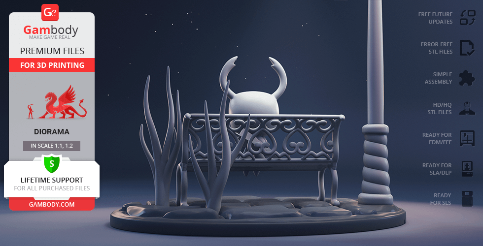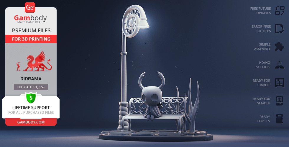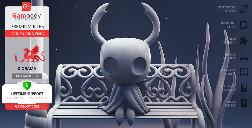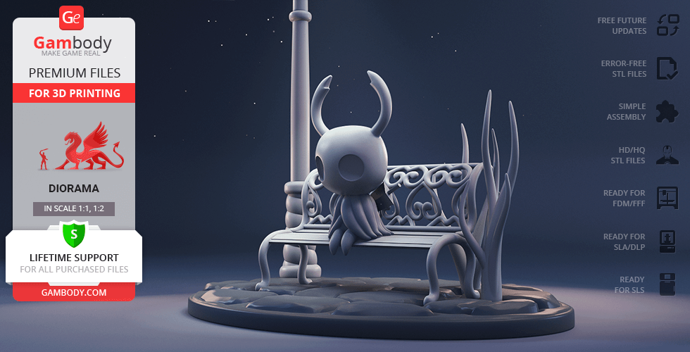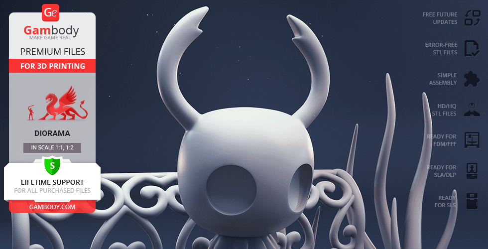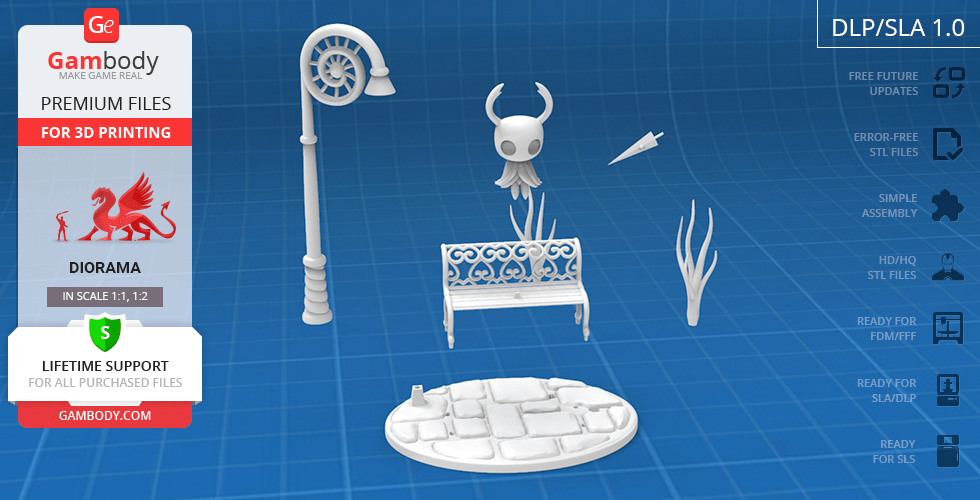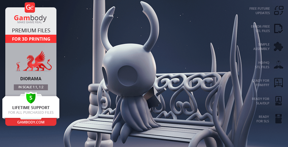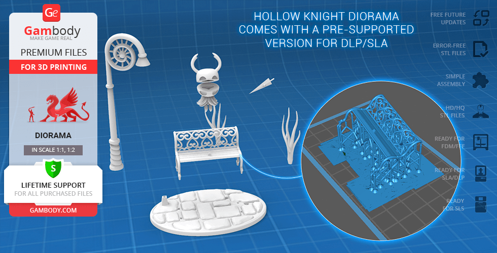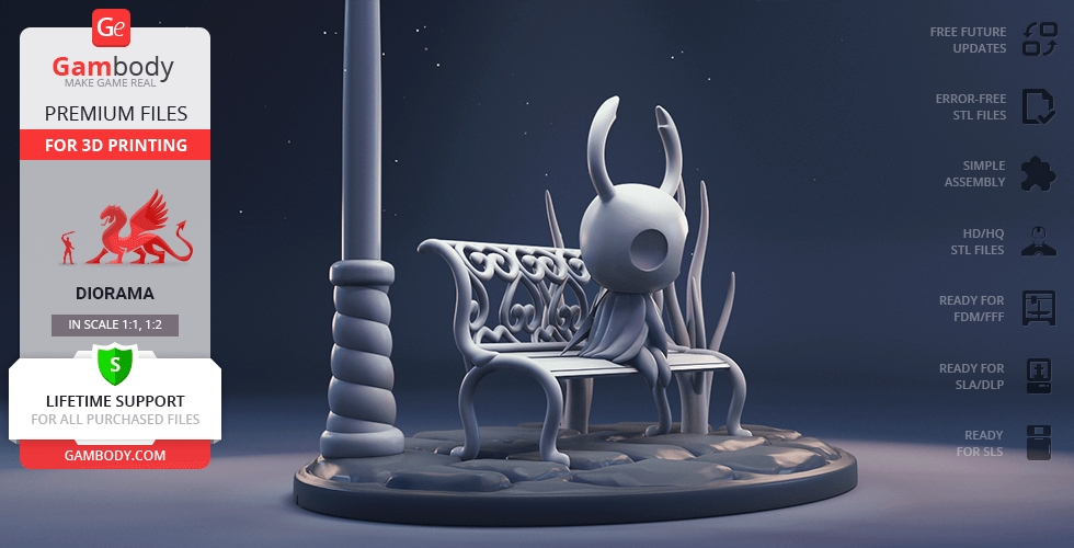 - 5 versions of Hollow Knight in Diorama diorama STL files for FFF/FDM, DLP/SLA, DLP/SLA Eco, DLP/SLA Pre-supported and SLS — files for all versions are available for download after the purchase;