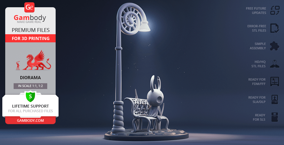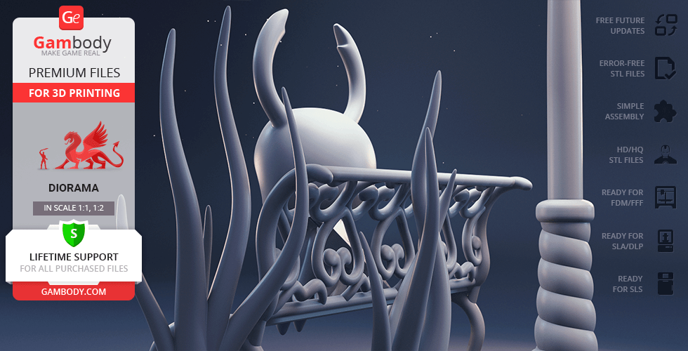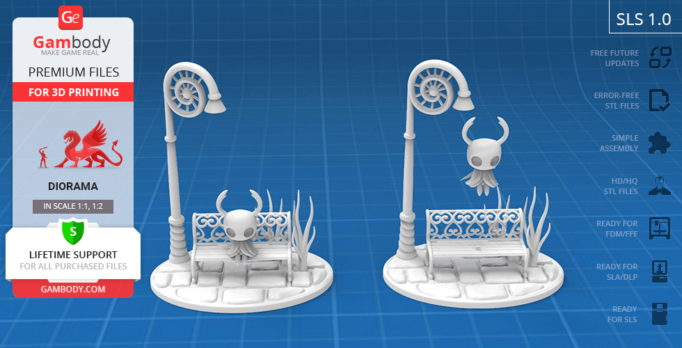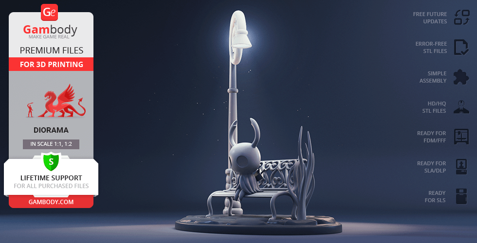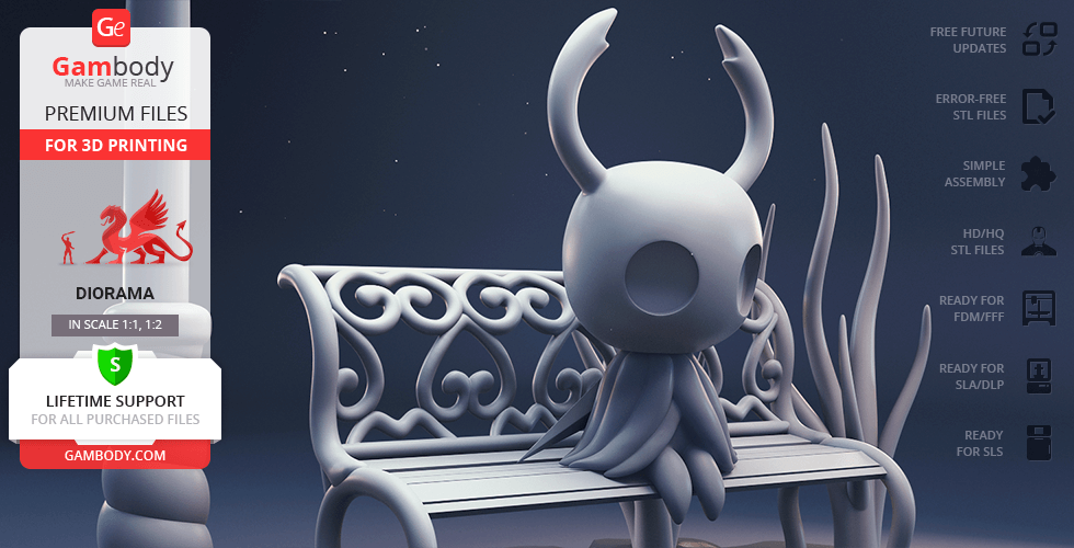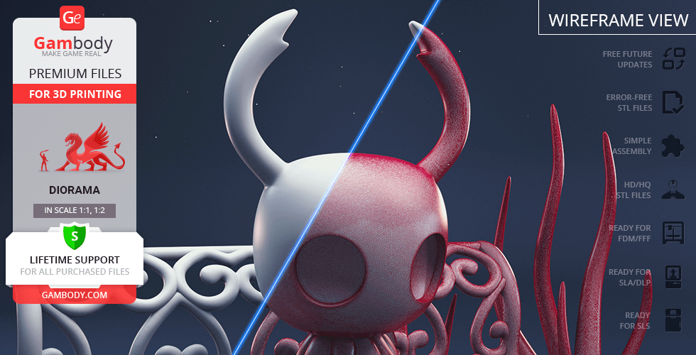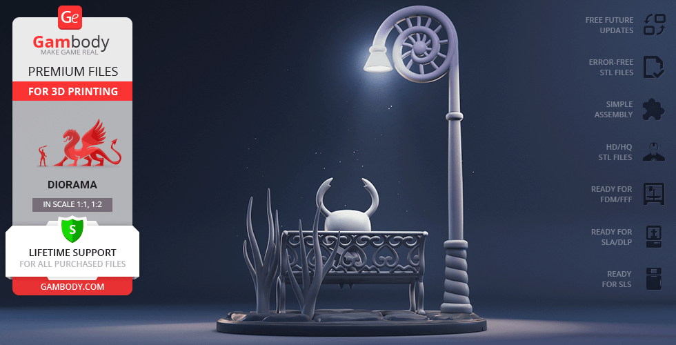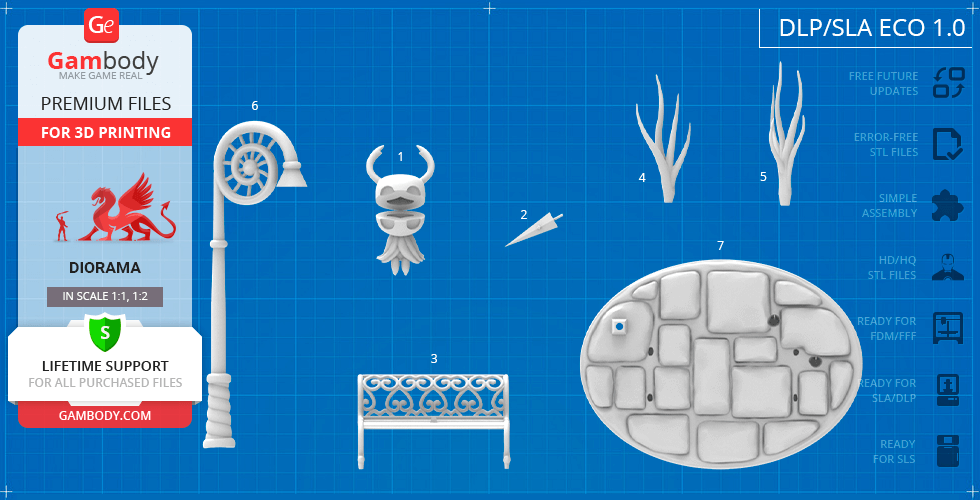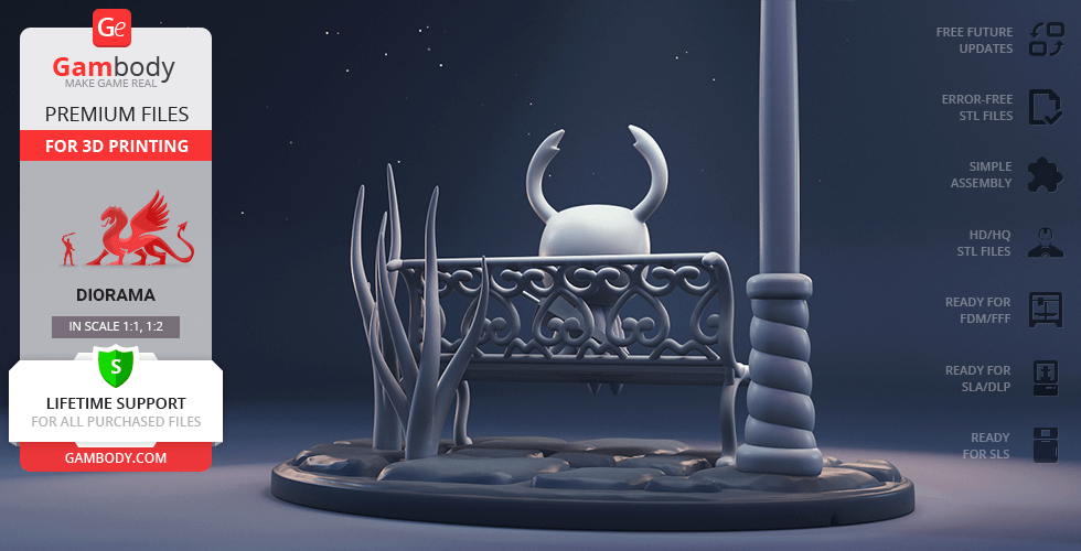 - 5 versions of Hollow Knight in Diorama diorama STL files for FFF/FDM, DLP/SLA, DLP/SLA Eco, DLP/SLA Pre-supported and SLS — files for all versions are available for download after the purchase;