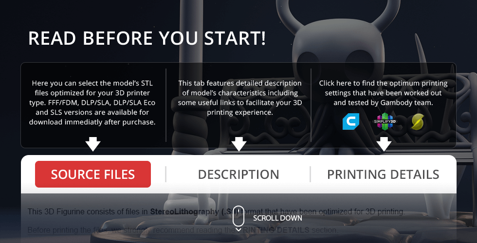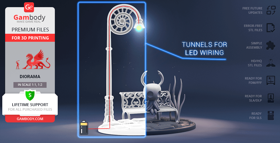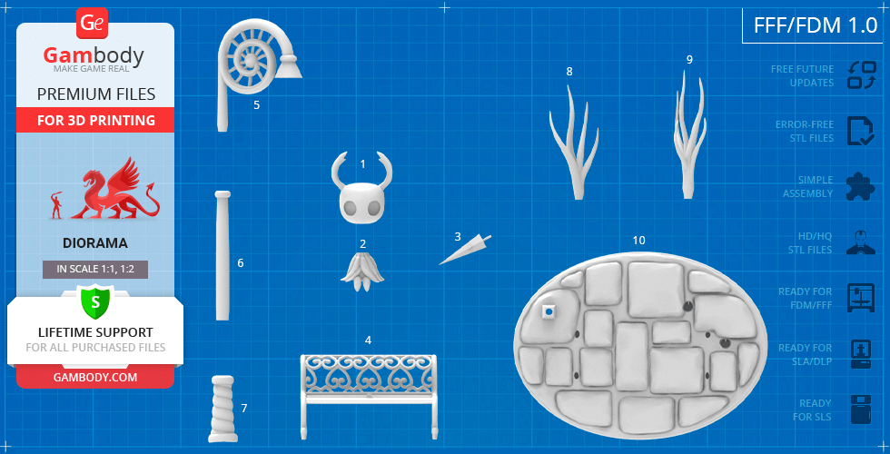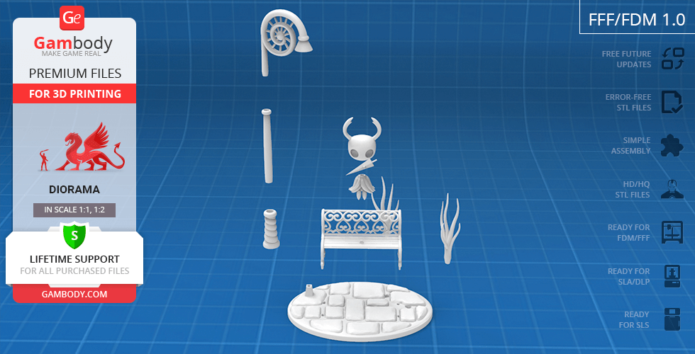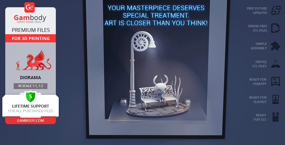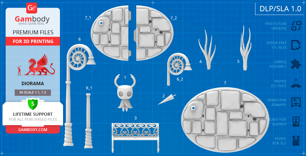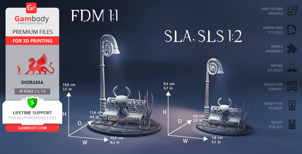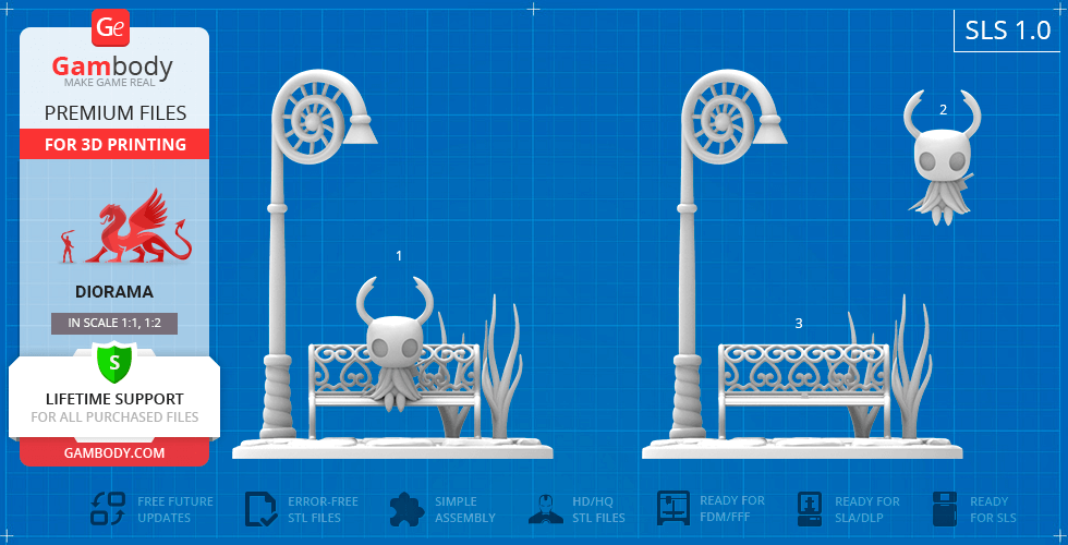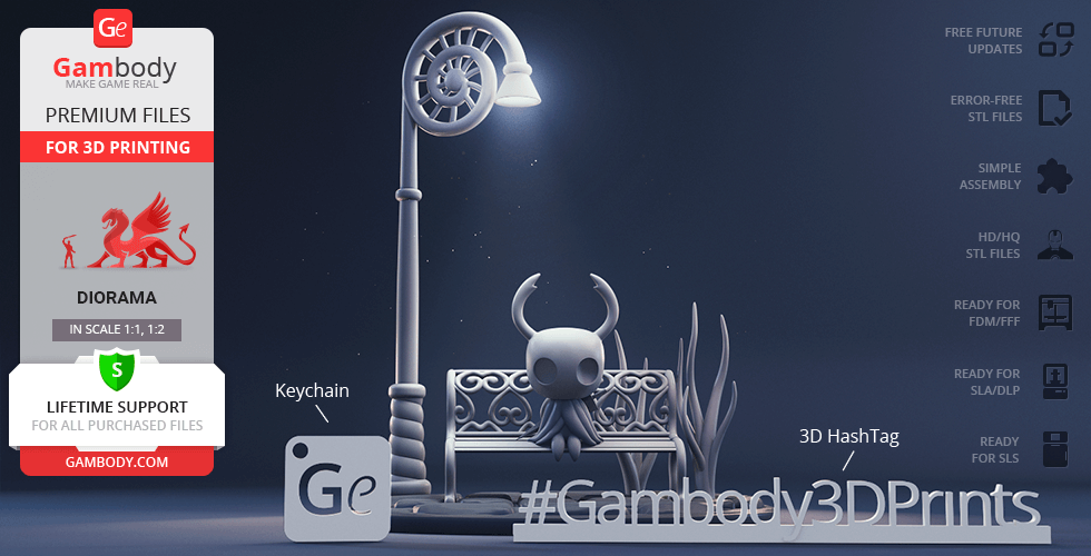 - 5 versions of Hollow Knight in Diorama diorama STL files for FFF/FDM, DLP/SLA, DLP/SLA Eco, DLP/SLA Pre-supported and SLS — files for all versions are available for download after the purchase;