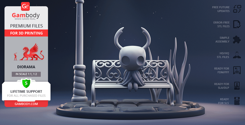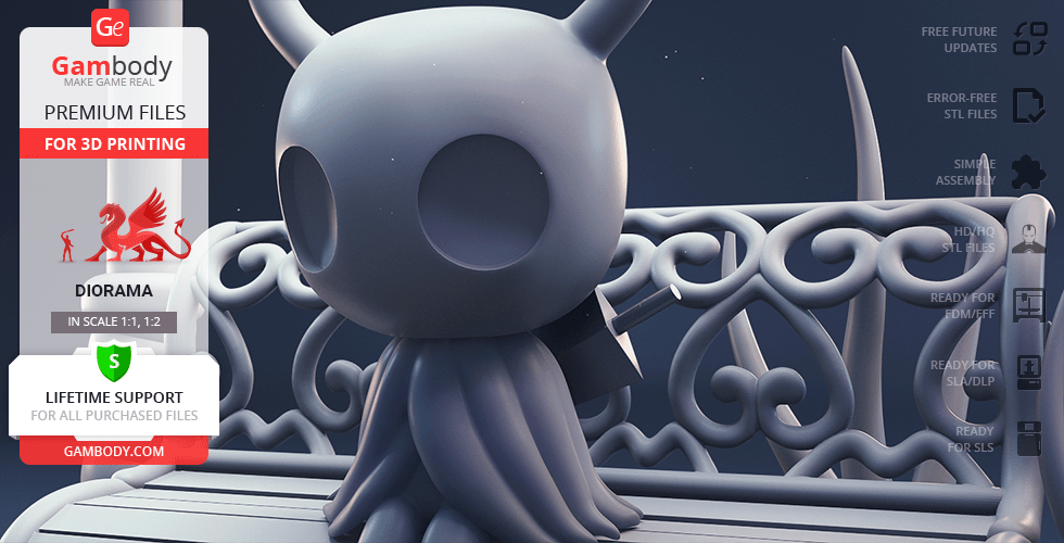 Hollow Knight in Diorama 3D Printer Files | Assembly includes 3 version(s) for the supported 3D printer type(s): FFF/FDM, DLP/SLA, SLS. Files are available for download after purchase.
