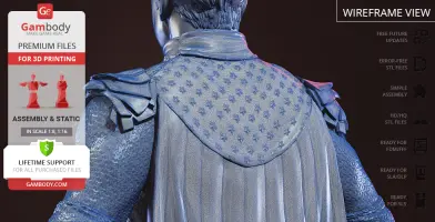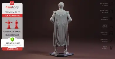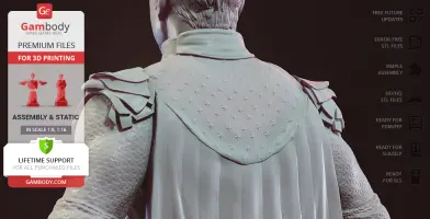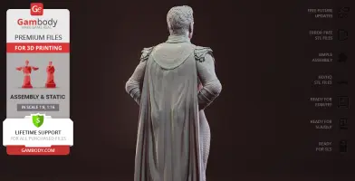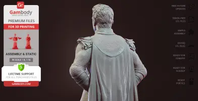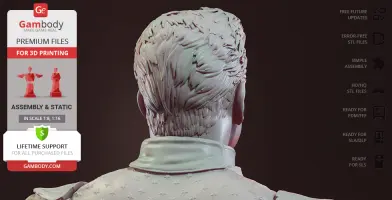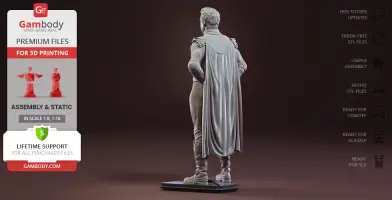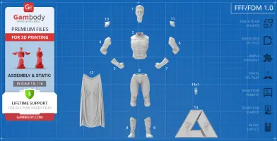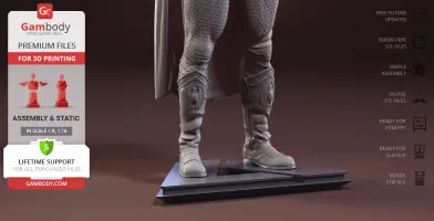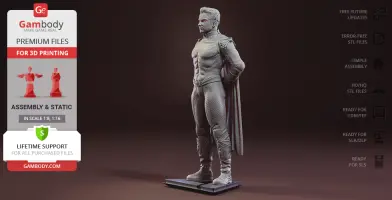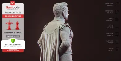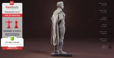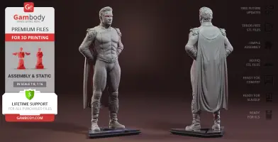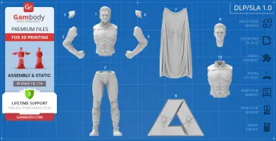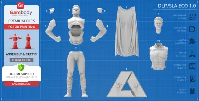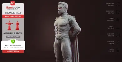 Homelander figurine for 3D printing is a static assembly model and its moderation and adaptation for different types of 3D printers took Gambody team 44 hours in total. Figurine’s anatomy was thoroughly reviewed during the moderation process for the powerful superhuman to be depicted harmoniously in the intended pose. The model’s cutting was chosen by our team to minimize the amount of filament needed for generated support and some of the parts were hollowed out for you to save resin in the model’s Eco version. In order to conceal the places where the assembly parts of the model must be connected, the figurine was cut along the contour of the character’s suit seams. For you to achieve the cleanest result possible such smaller parts as Homelander’s eagle epaulettes, gloves, high boots, etc. are provided as separate files. The supervillain’s long cape has also been taken off the figurine’s back and comes as separated 3D printing part that is to be inserted along the suit’s pattern. All the assembly parts come in STL files in recommended positions that were worked out in order to ensure the smoothness of the details’ surfaces after printing and to make sure the 3D printing beginners won't face difficulties when placing the parts on a build plate. When downloading any figurine's file you will also receive "Assembly Manual" for FFF/FDM 1.0 and DLP/SLA 1.0 versions in PDF format.