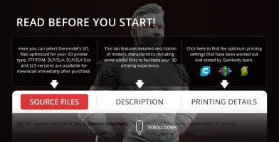 - STL files of Homelander 3D Model for 3D printing which consist of 33 parts;- 4 versions of files for this model for FFF/FDM, DLP/SLA, DLP/SLA Eco and SLS;- High-poly detailed figurine of Homelander;- Assembly Manual for FFF/FDM 1.0 and DLP/SLA 1.0 versions in PDF format;- Detailed settings that we provide as a recommendation for Cura , Simplify3D and Slic3r for the best print;- Full technical support from the Gambody Support Team.